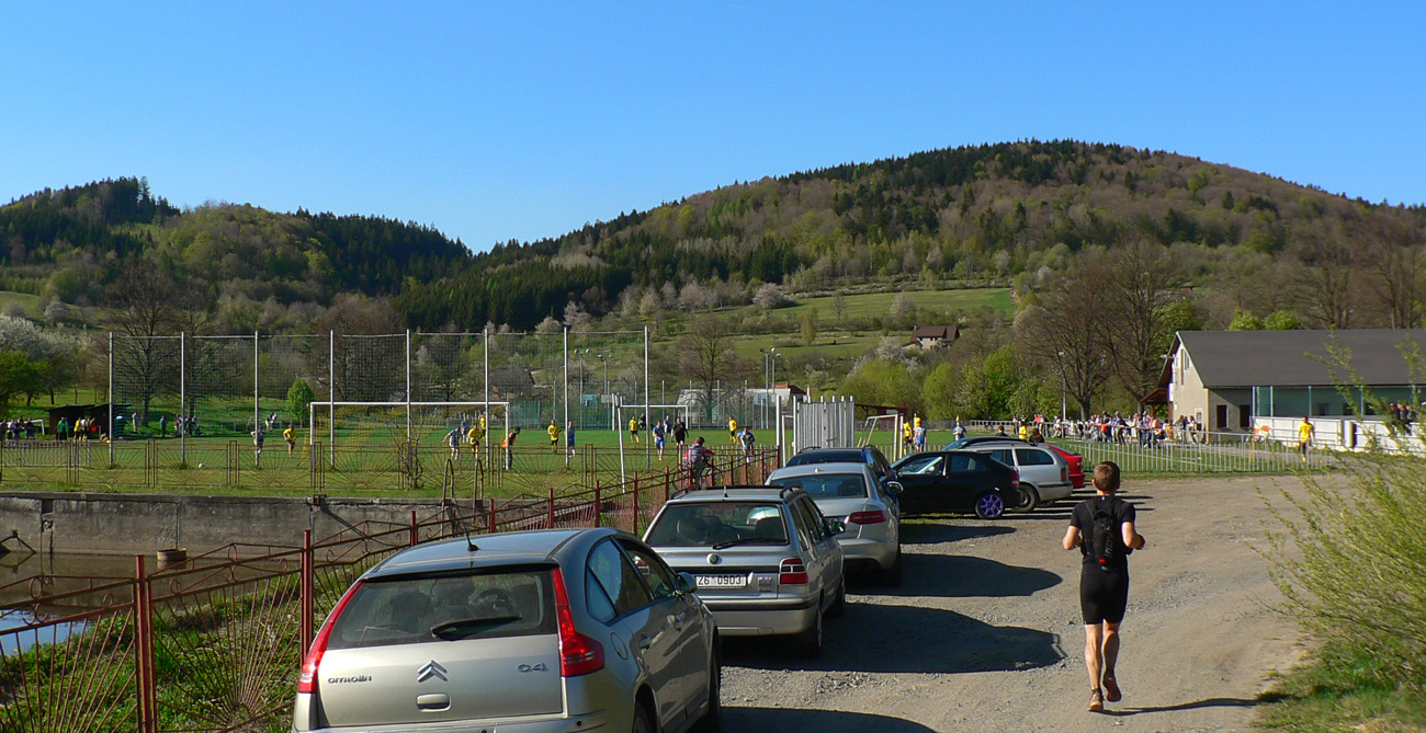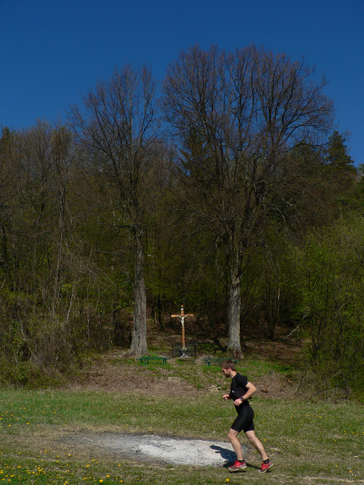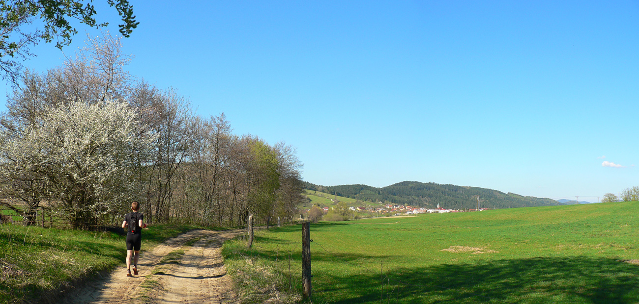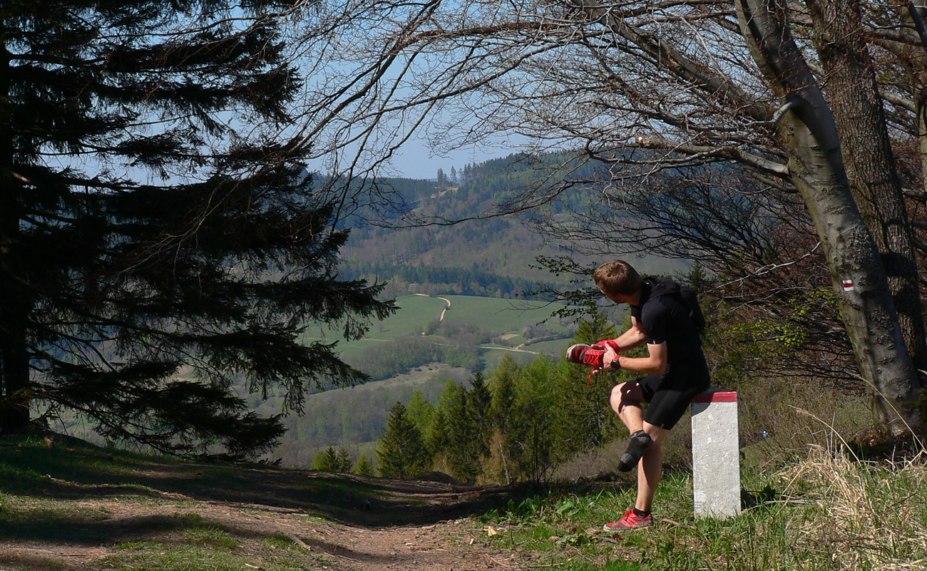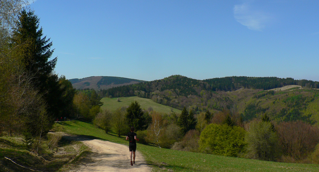 Týždeň po Lazovici veľkonočné sviatky, v pondelok nebolo treba do práce, mohli sme si dovoliť v nedeľu sa dobre vyklusať (=odrovnať). Tak sme sa dohodli s nemenovaným P.K., a ten premotivovaný, mladý, po stovke rýchlo zotavený srnec hneď začal v Hikeplanneri naklikávať varianty. Prvý mal asi 80, druhý 70, tretí 60 a štvrtý 50 km, tak som rýchlo písal, že ideálny bude piaty, možno šiesty. Nakoniec sme sa skompromisnili na tom štvrtom teda... Ale chybu som spravil, že som si zase nepozrel profil. Oni tie milé, guľaté kopčeky Bielych Karpát vyzerajú tak prívetivo... Nakoniec to nebolo až také zlé - asi deväťhodinové vyklusávanie a vykecávanie v prevažne peknej krajine CHKO Biele/Bílé Karpaty. Len pár krátkych stretnutí s ľudskou tuposťou, ale to zas aby sme si neodvykli...A tak sme teda vyrazili. Na úvod to síce boli ešte chvíľu Javorníky, lebo z Nosíc cez priehradu, cez kúpele na Holíš prvé výhľady uchmatnúť sme išli a cez lesy popri Púchovskej skale sme do budúceho cieľového mesta zbehli. Ranný chlad prešiel do chládku, fajná rozcvička. Pekná krajina, ale aj prvé stretnutie s ľudskou blbosťou, v tomto prípade lesohospodárskou. Celé „pole“ smrekových sadeníc - vo výške okolo 450 m. Hlavne že majú plnú hubu rečí o zlých ochranároch. Ale prvé dva kopčeky za nami: