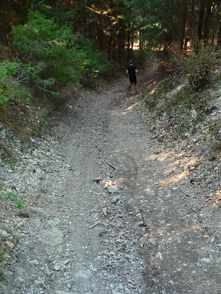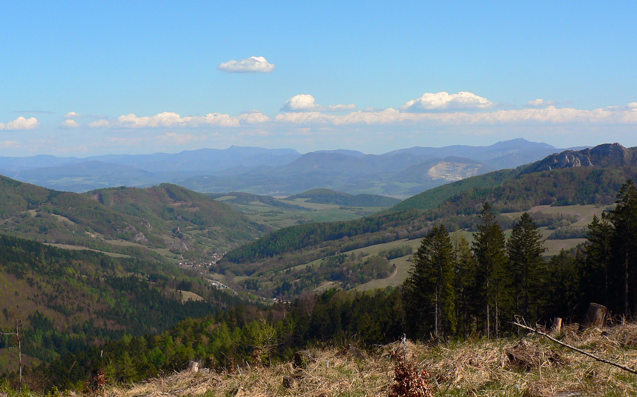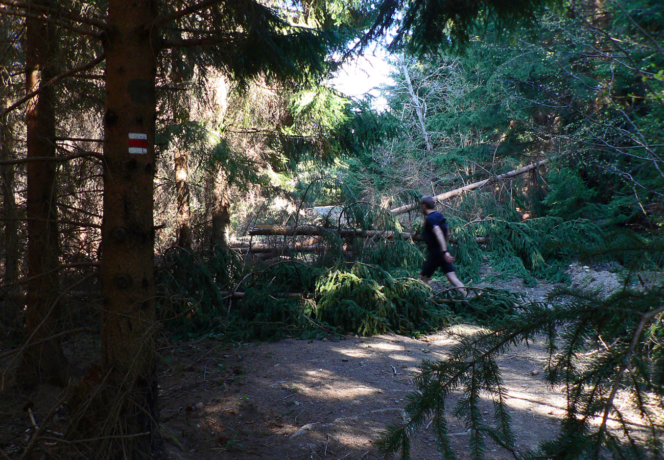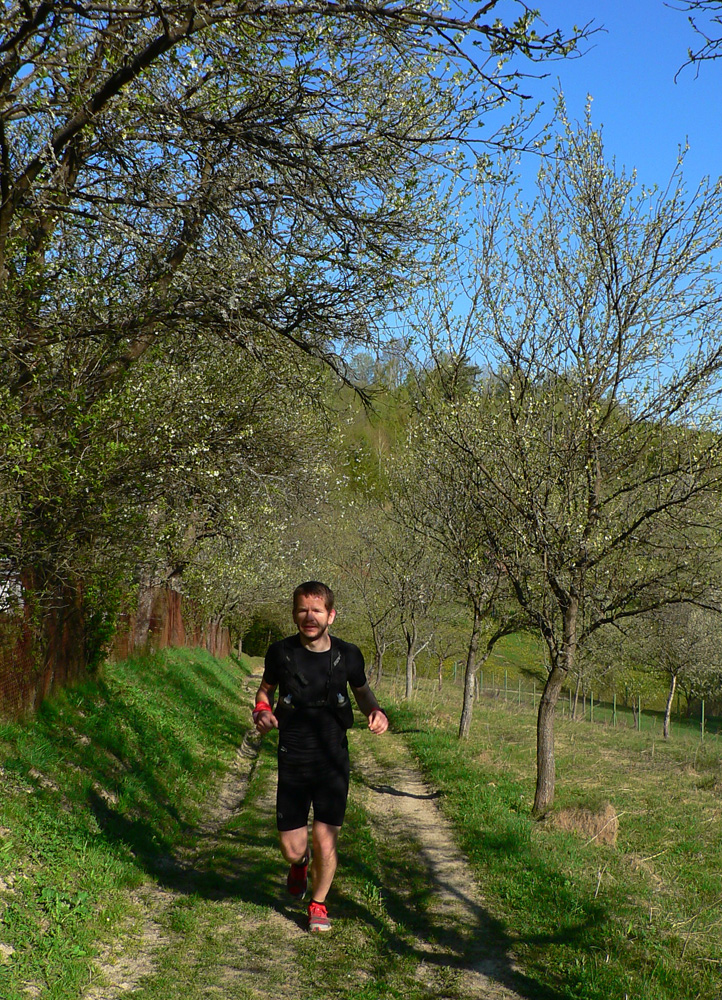 Týždeň po Lazovici veľkonočné sviatky, v pondelok nebolo treba do práce, mohli sme si dovoliť v nedeľu sa dobre vyklusať (=odrovnať). Tak sme sa dohodli s nemenovaným P.K., a ten premotivovaný, mladý, po stovke rýchlo zotavený srnec hneď začal v Hikeplanneri naklikávať varianty. Prvý mal asi 80, druhý 70, tretí 60 a štvrtý 50 km, tak som rýchlo písal, že ideálny bude piaty, možno šiesty. Nakoniec sme sa skompromisnili na tom štvrtom teda... Ale chybu som spravil, že som si zase nepozrel profil. Oni tie milé, guľaté kopčeky Bielych Karpát vyzerajú tak prívetivo... Nakoniec to nebolo až také zlé - asi deväťhodinové vyklusávanie a vykecávanie v prevažne peknej krajine CHKO Biele/Bílé Karpaty. Len pár krátkych stretnutí s ľudskou tuposťou, ale to zas aby sme si neodvykli...A tak sme teda vyrazili. Na úvod to síce boli ešte chvíľu Javorníky, lebo z Nosíc cez priehradu, cez kúpele na Holíš prvé výhľady uchmatnúť sme išli a cez lesy popri Púchovskej skale sme do budúceho cieľového mesta zbehli. Ranný chlad prešiel do chládku, fajná rozcvička. Pekná krajina, ale aj prvé stretnutie s ľudskou blbosťou, v tomto prípade lesohospodárskou. Celé „pole“ smrekových sadeníc - vo výške okolo 450 m. Hlavne že majú plnú hubu rečí o zlých ochranároch. Ale prvé dva kopčeky za nami:
