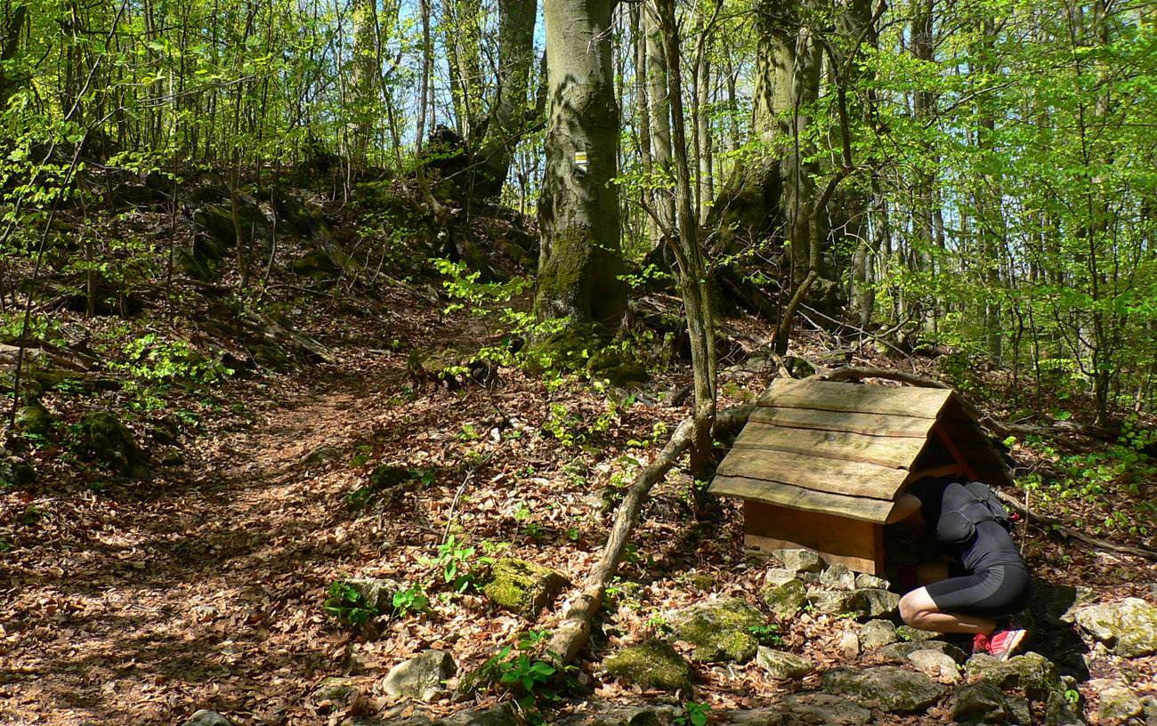 Čakal nás najdlhší kopec výletu, až hore pod Chmeľovú. Samozrejme odpustili sme si pokračovať modrou po asfalte a dupali sme po žltej. Veľmi pekný úsek, aj veľa výletníkov sme postretali a čo nás veľmi potešilo, že sme aj v studničke pod Babkami dotankovali. Začínalo byť teplo a dediny, kde sme mohli vyžobrať vodu, sa už minuli. Zachádzku na Chmeľovú som zatrhol, zdalo sa mi, že by sme mali trochu kopnúť do koní. Na konci sa ukázalo, že to bol dobrý tušák.