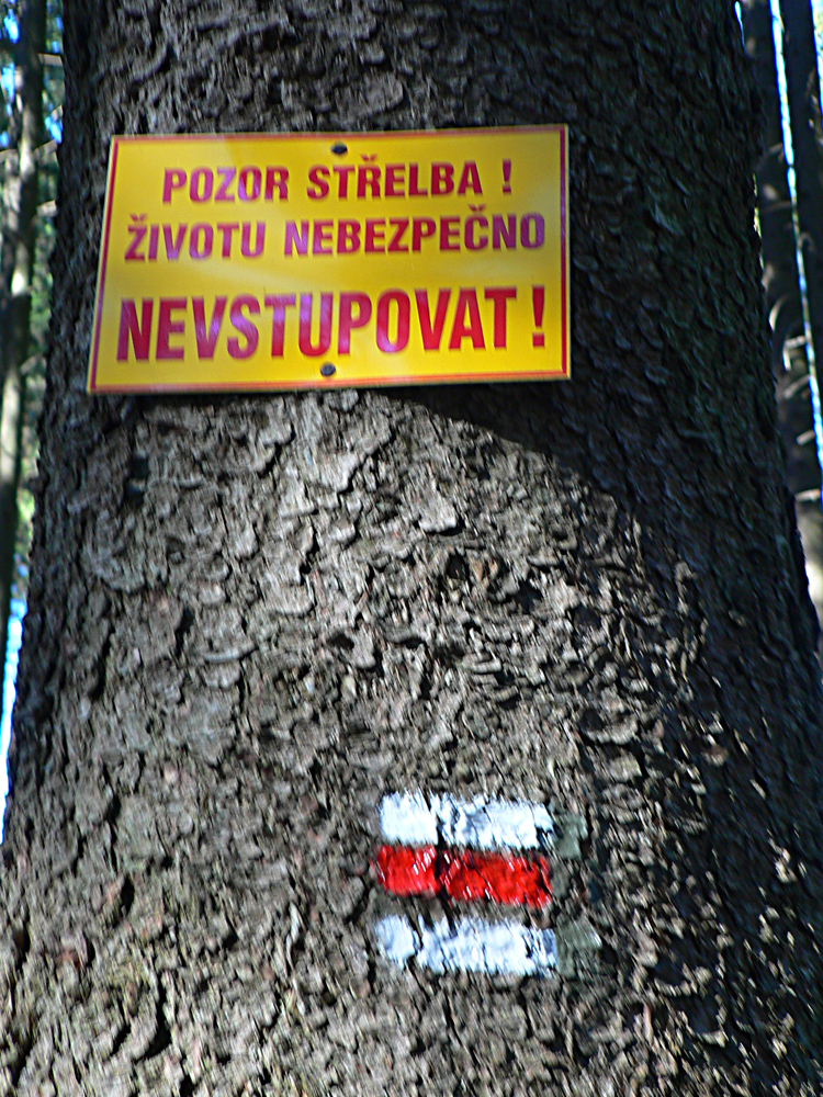 Ale nakoniec sme sa šťastne do Střelné dostali. Aj keď v doline pod nami sa strieľalo a na stromoch boli výstražné tabuľky, aj keď prudký zbeh z Končitej bol nepríjemný, podobne ako blbé pohľady a komentáre, keď nás značka viedla do dediny priamo cez naplnenú miestnu Marakanu.