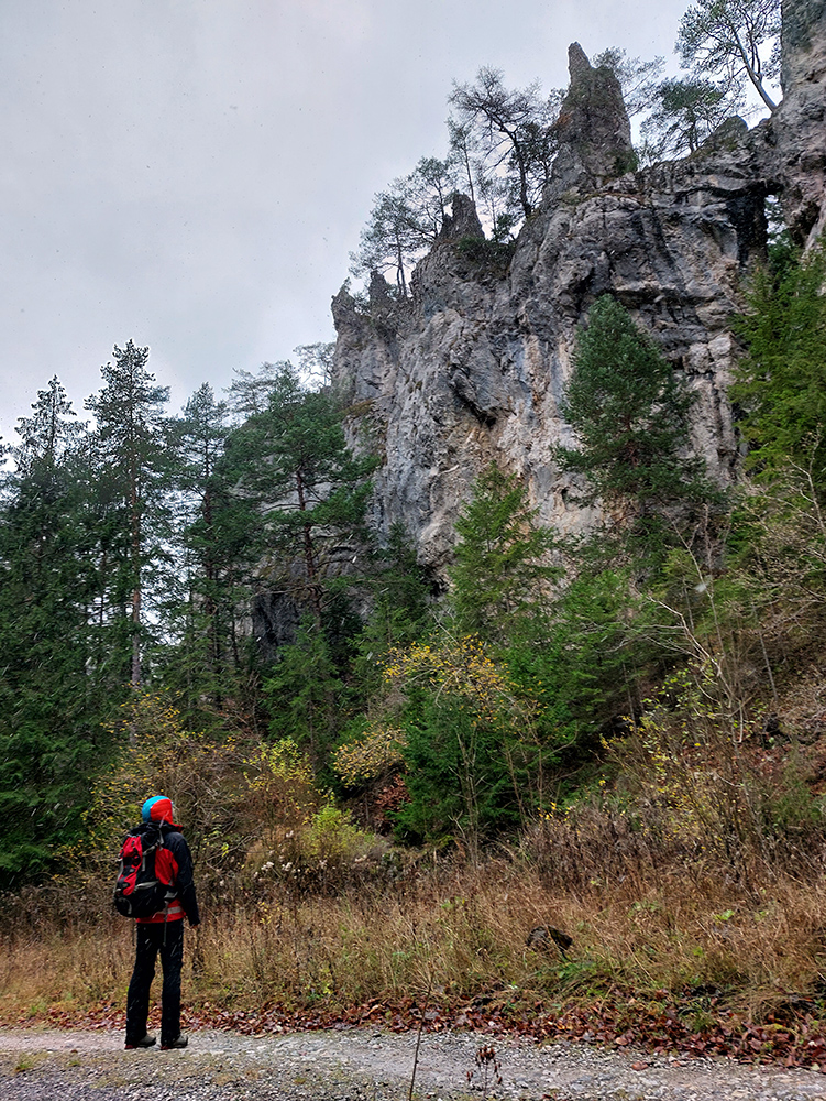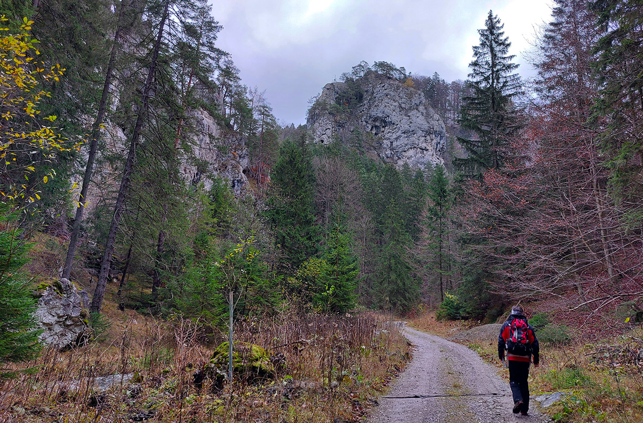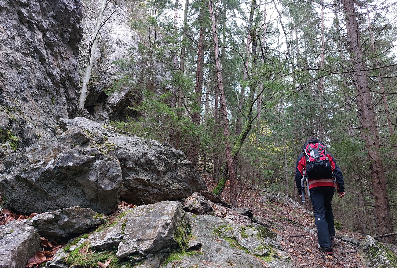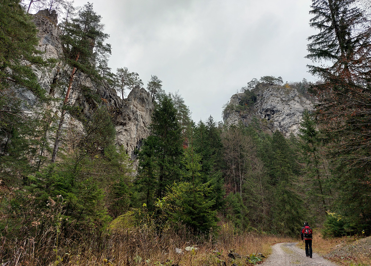Spevnená šotolinová cesta vedie zhruba šesť kilometrov od ústia po smerovník „Spoj Rakytovských dolín“, takže pod nohy netreba veľmi pozerať. Dolinou sa plazí v pohodovom, miernom sklone aj zelená značka a cyklotrasa. Zelená pokračuje ďalej cez Smrekov na Kráľovu studňu, cyklotrasa pri smerovníku končí. To ale nie sú jediné možnosti. Od smerovníka sa dá ešte „vybehnúť“ po žltej značke pod Drienok, podobná žltá vedie z nižšieho bodu doliny do opačného svahu (ale rovnako strmého) pod Ostrú. Na mapách sú tie žlté také krátke spojky, v realite poriadne výživné strminy. Ale najmä tú nižšiu odbočku sa oplatí pozrieť, aspoň po skalný prah v jej prvej tretine, lebo cestou k nemu sú v lese, aj priamo popri chodníku, porozhadzované parádne skaly až bralá. A tam dole nie je sklon veľký (to ani na druhej žltej odbočke).