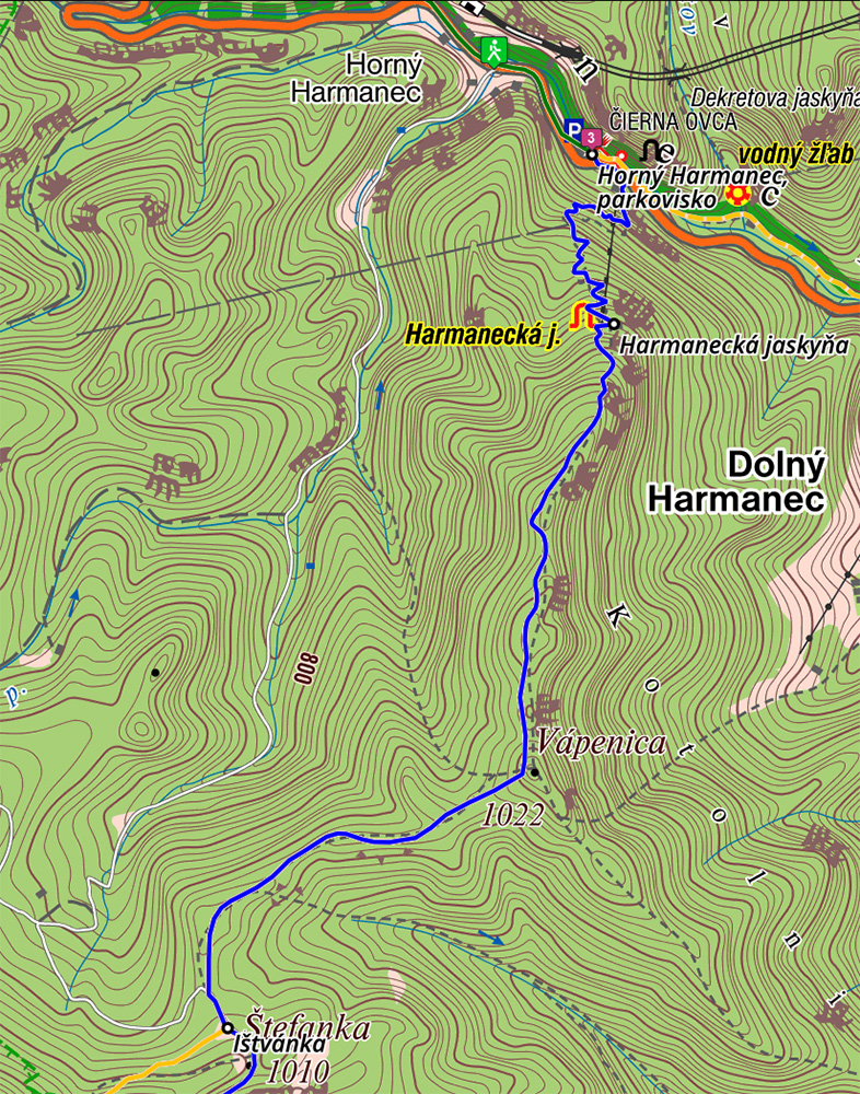 Čiže v podstate od parkoviska pod jaskyňou, no nie priamo hore serpentínkami, ale poriadnou okľukou. Zato peknou. Alebo ak niekto chce, od horárne v Hornom Harmanci, priamo spod železničnej zastávky Harmanec – jaskyňa, ani nie 500 m od spomenutého parkoviska. Tam totiž Čierna dolina začína. Teda vlastne ústi do doliny Harmaneckej – peknou, len pár rokov starou, úzkou asfaltkou. Len už ten nový asfalt poznačila ťažba dreva. To keby sa chcel nejaký žiletkár cestou na Šturec schladiť. Inak na mtb (no, stačil by gravel) sa tade dá pohodlne dostať cez Štefánku na Kordíky.