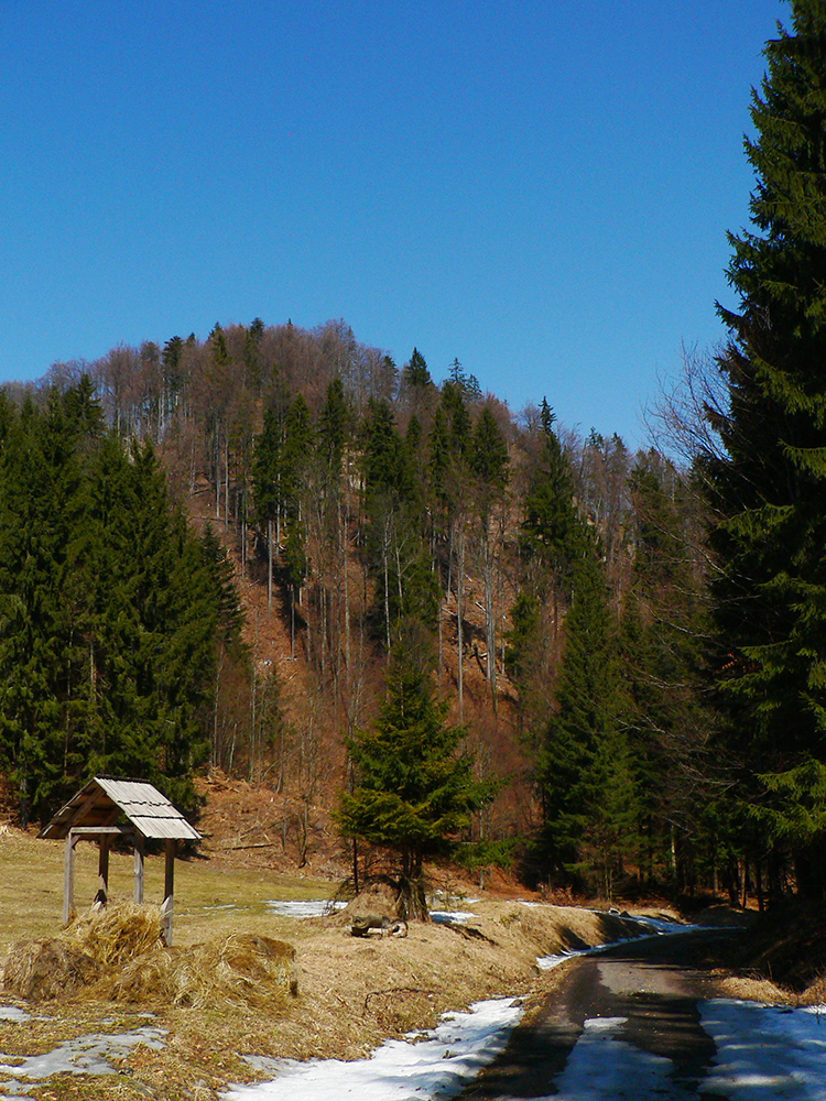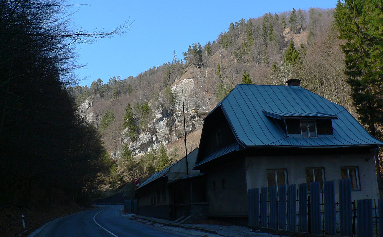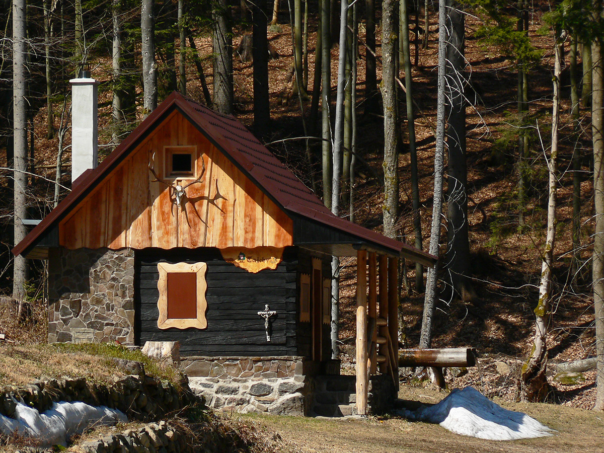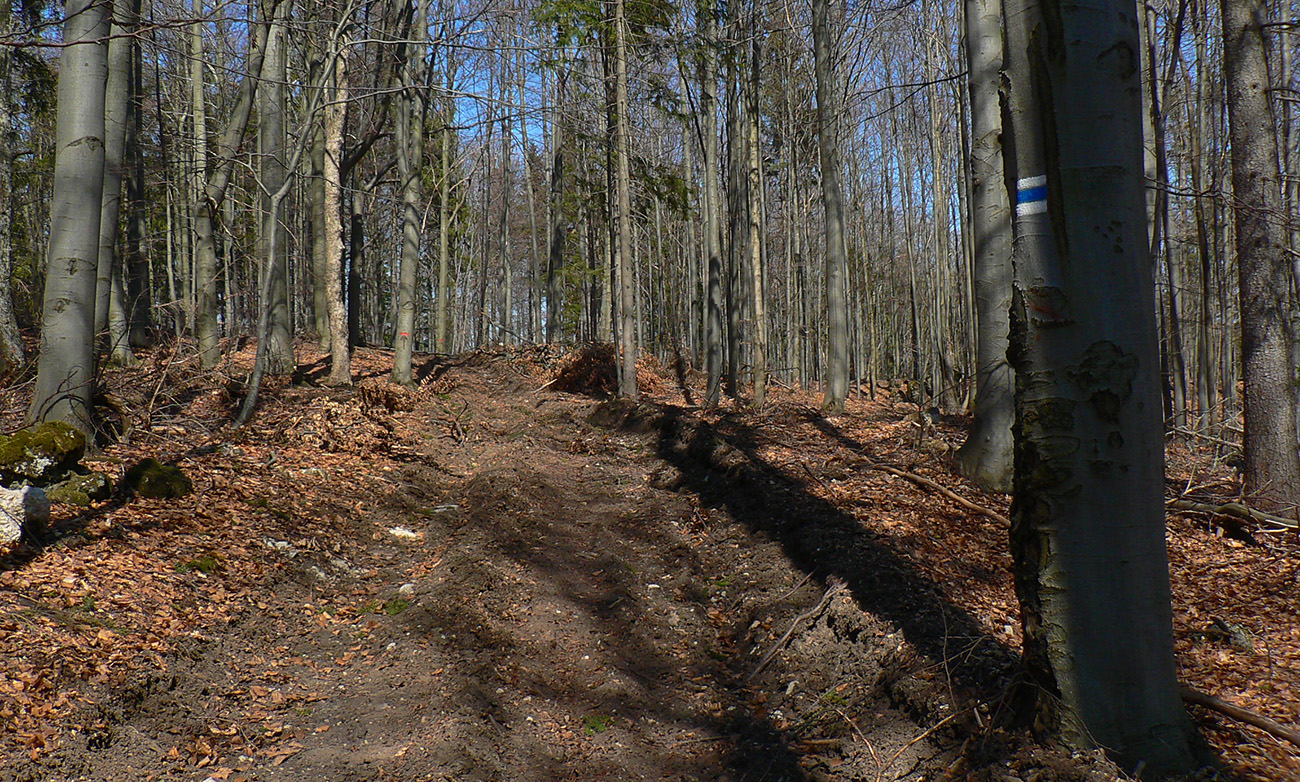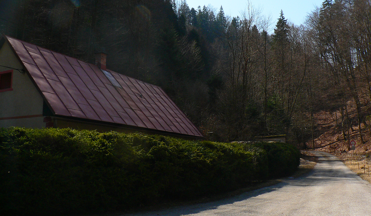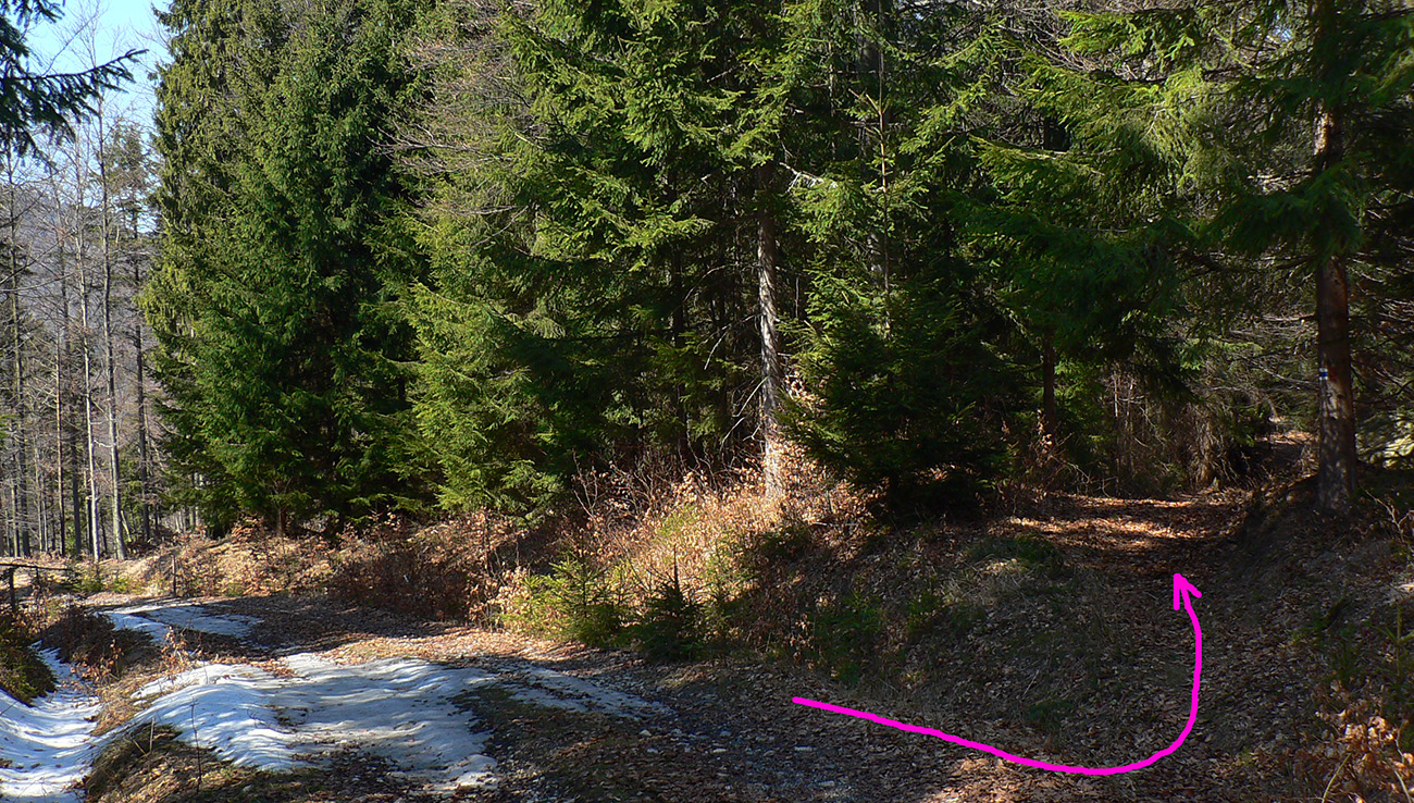 Pár serpentín, z jednej je krátka odbočka doprava k novej chatke v oplotenom areáli. Podľa insitnej (alebo infantilnej?) umeleckej výzdoby asi tiež jágri. Chatka je ale pre orientáciu dôležitá. Priamo nad ňou, za poslednou serpentínou, asfaltka totiž pokračuje už priamo na severozápad popod hrebeň, lenže treba ísť doľava, po výraznej, spevnenej lesnej ceste, ktorá asi po 500 m (za prvou zákrutou) križuje modrú značku.