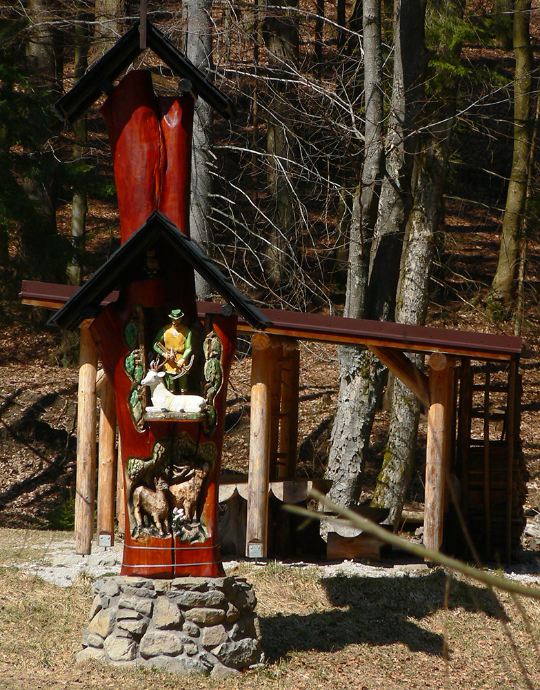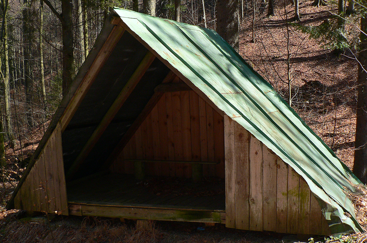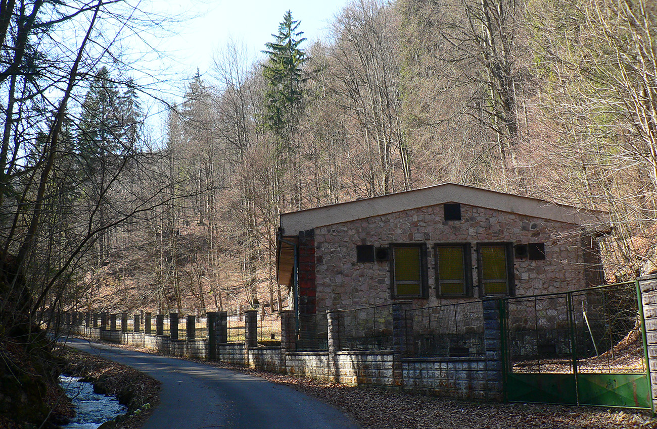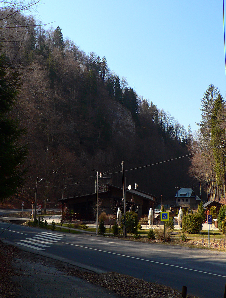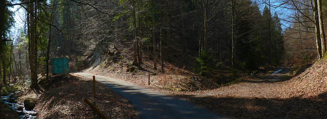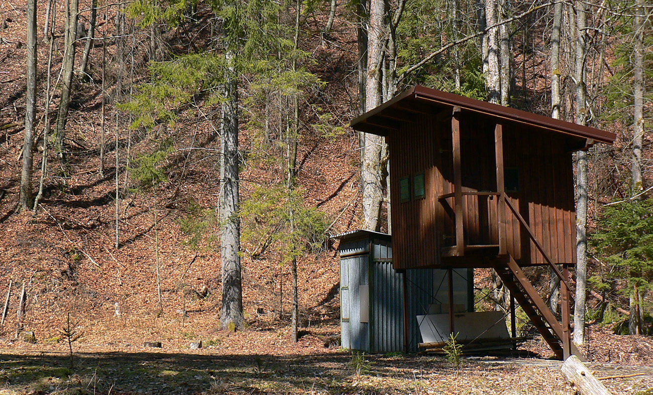 Pár serpentín, z jednej je krátka odbočka doprava k novej chatke v oplotenom areáli. Podľa insitnej (alebo infantilnej?) umeleckej výzdoby asi tiež jágri. Chatka je ale pre orientáciu dôležitá. Priamo nad ňou, za poslednou serpentínou, asfaltka totiž pokračuje už priamo na severozápad popod hrebeň, lenže treba ísť doľava, po výraznej, spevnenej lesnej ceste, ktorá asi po 500 m (za prvou zákrutou) križuje modrú značku.