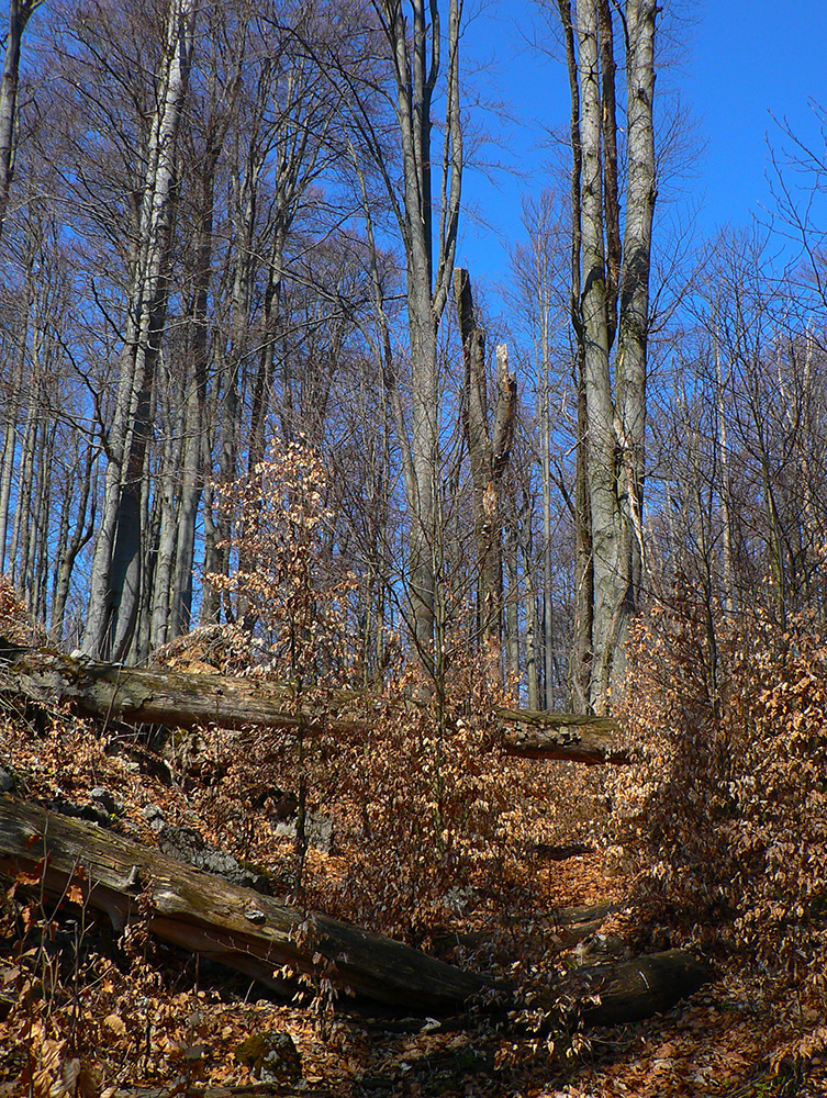 Štefanka je ešte pár metrov ďalej, ale tam netreba ísť, je to len križovatka zvážnic (aj keď geomorfologicky je to zaujímavosť - tu sa stretajú Starohorské vrchy, Kremnické vrchy a Veľká Fatra). Treba zabočiť z cesty doľava na modrú, ako ukazuje fotka tu vyššie. Cez Vápenicu, Kozeľník na Kotolnicu je to potom pekný, hrboľatý, bralnatý hrebienok, taký hore - dole. Výhľady síce minimálne, ale les pekný, divoký, okrem úvodnej zvážnice. Sem – tam presvitne vpravo dole Dolný Harmanec, vľavo vpredu Krížna. Až na konci, na Kotolnici, je malá lúčka s lavičkou a parádnym výhľadom.