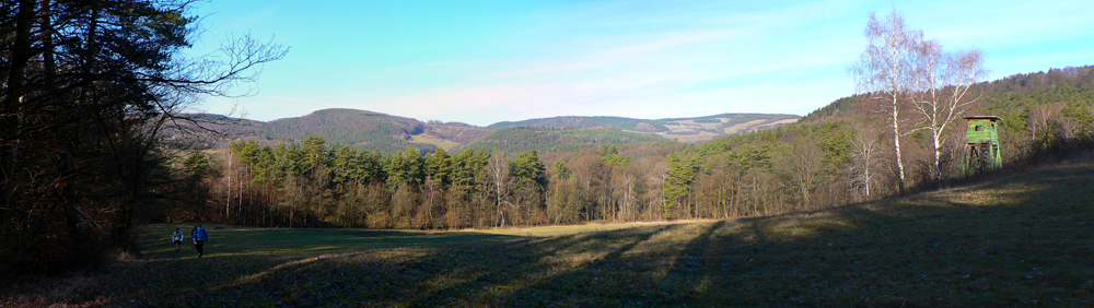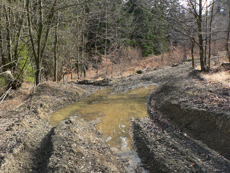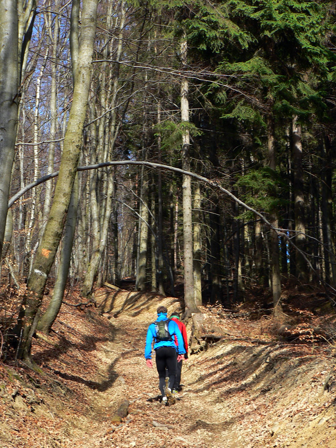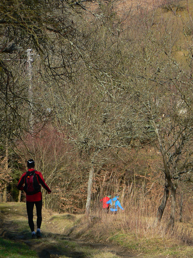 Počasie vyšlo ideálne - ráno trochu primrznuté, ale slnko krajinu rýchlo ohrialo. Tiež tak ideálne bežecko-turisticky, nebolo moc teplo. Aj blato na zvážniciach väčšinou také akurát, aby sa nelepilo na podrážky a nepodklzovalo v stúpaniach. Ani listov na stromoch samozrejme nebolo, čo tiež zlepšilo možnosti výhľadov aj orientácie - v lete by niektoré značky boli neviditeľné. Takže celkovo super tréning, len v cieli netankovali kofolu - no, malá chybička krásy :-) Inak super by bolo pomotať sa tadeto na bajku, lebo na pohodovú túru je to predsa len dlhé. Len keby tie lesné cesty neboli také rozryté. Preto aj viac stôp bolo po motorkách ako po pešiakoch, zdalo sa mi. Ale každopádne Radovi vďaka za super nápad a organizáciu - a aj za výber smeru, myslím že opačne by to bolo náročnejšie.