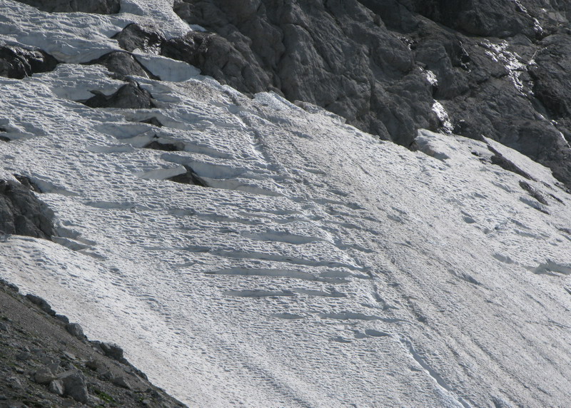 Prichádzame k ďalšiemu snehovému polu. Sneh je tvrdý, ale postupujeme ďalej. Blížime sa k nástupu. Stretávame ďalších ľudí a postupujúc po chodníku, ktorý tvoria len červené značky na skale už tušíme, že nás to k nástupu pustí.
