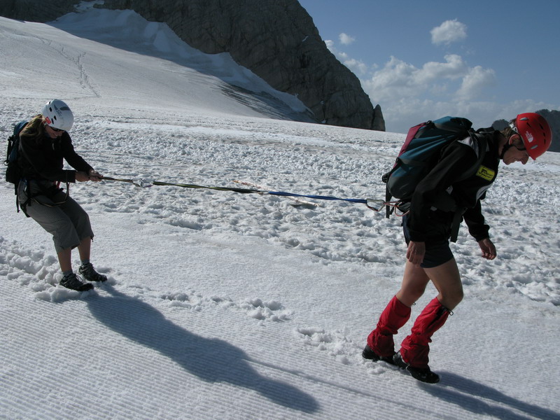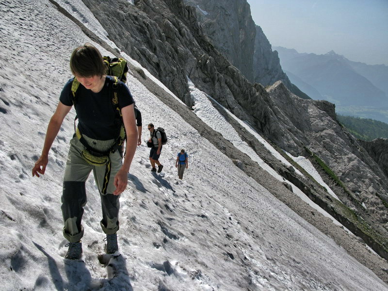 Zostupujúc si dáme pozor na okrajové trhliny a už sa šmýkame dole po snehu, Tí s väčšími chodidlami majú trošku výhodu: aspoň na dačo mi sú tie lode dobré haha. Na stanicu prichádzame už po záverečnej a tak si dávame pri zostupe ďalšiu ferratu, tentoraz však smerom dole.