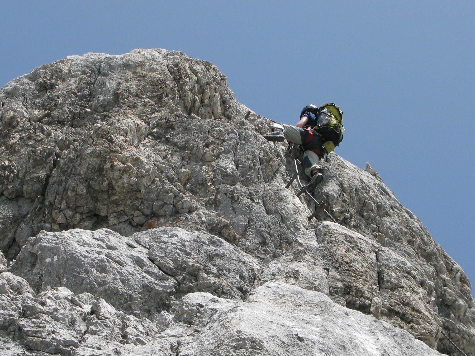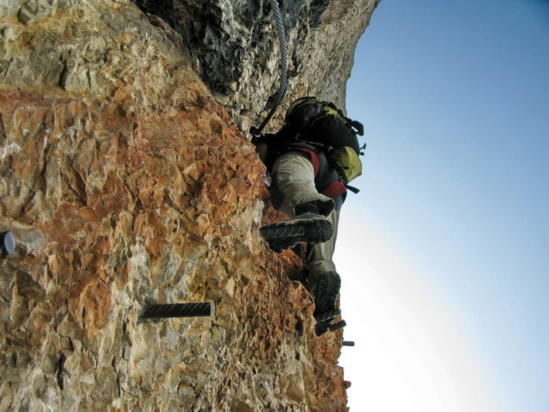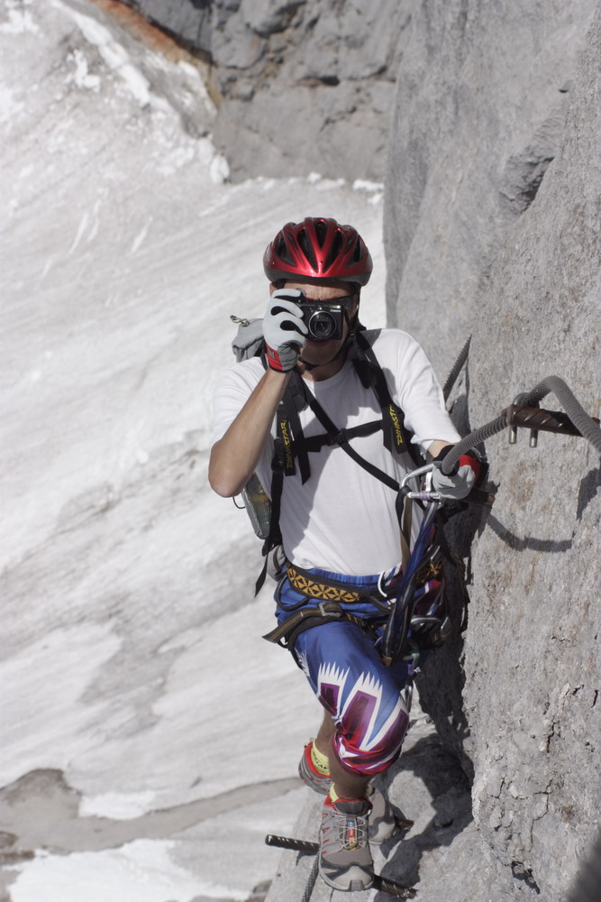 Pri chôdzi mokrým snehom zbadáme vľavo v skale ferratu vedúcu hrebeňom na vrchol. Rozhodujeme sa pre ňu, po skale je to predsa len lepšie ako po chladnom snehu. Na vrchole sme pred štvrtou a to už nasleduje eufória z nádherného dňa.