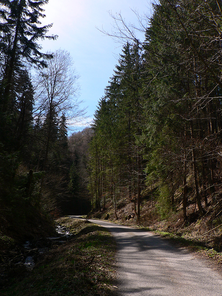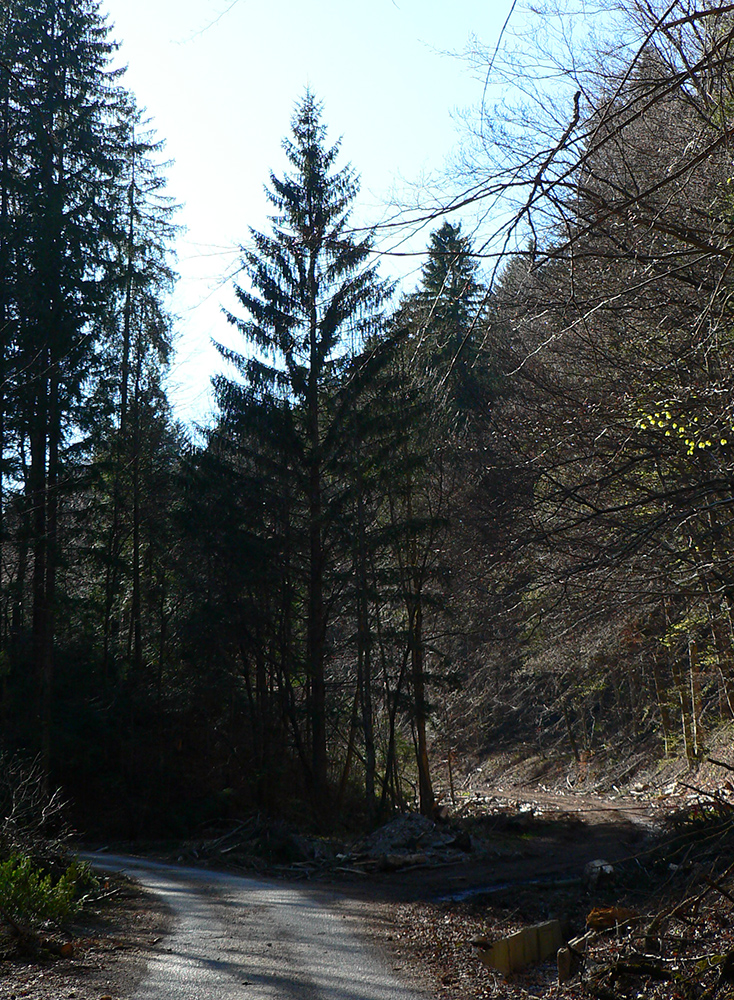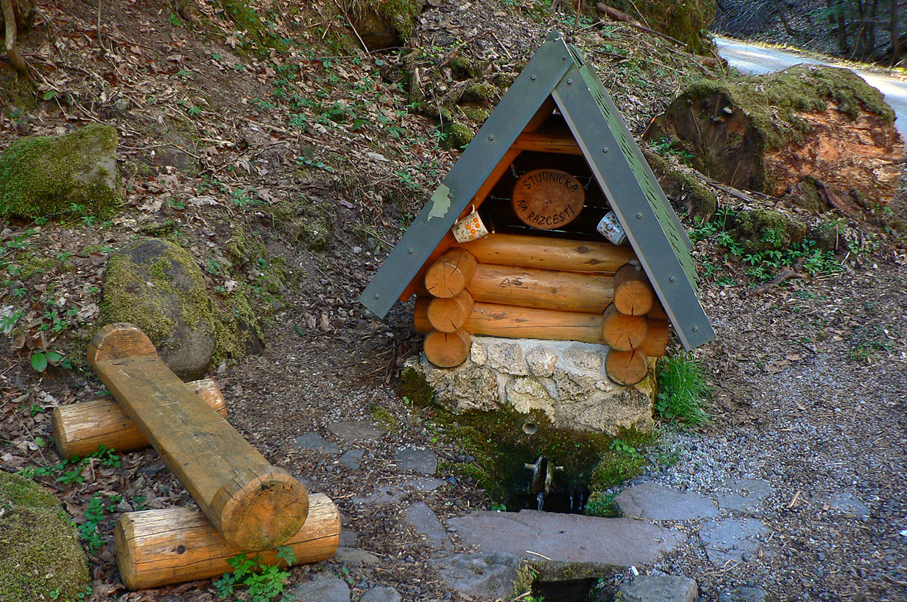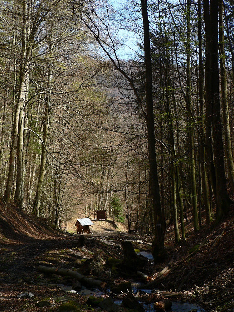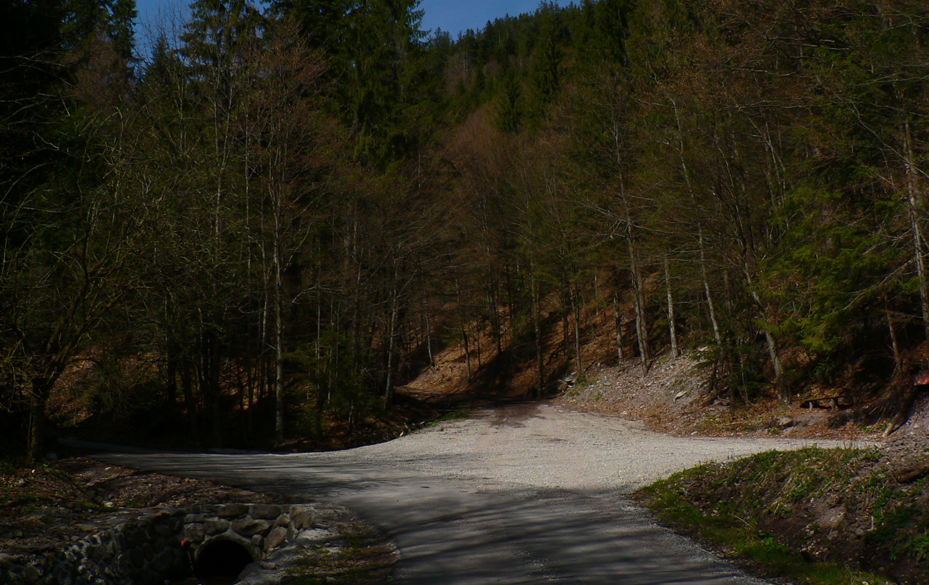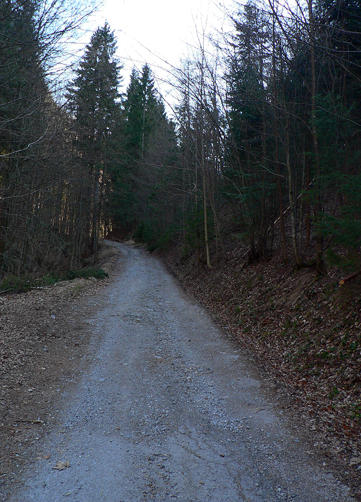 Pri horárni lúka, na lúke nový nevkusný kanadský zrub, popod horáreň výrazná cesta dole lesom. Po chvíli sa vnorí do hlbokej doliny a vysoko ponad jej potok schádza poriadne hustou bukovou mladinou, schudnutá už len na ledva zreteľný chodník. Končí na sútoku potokov, priamo pod parádnou skalnou slavobránou do Hadej doliny.