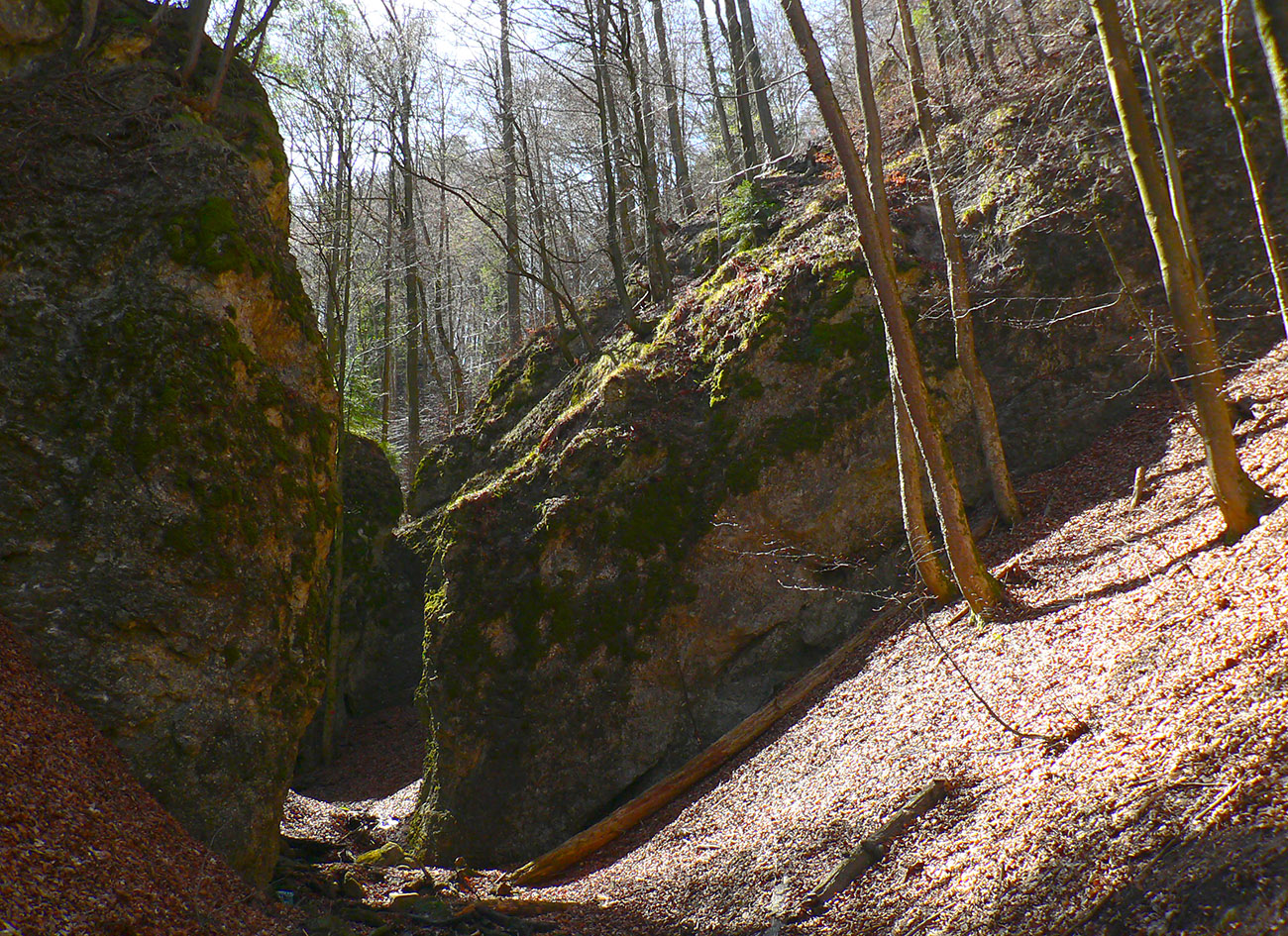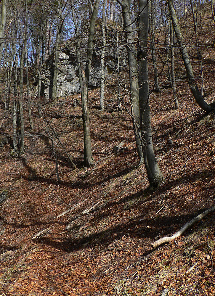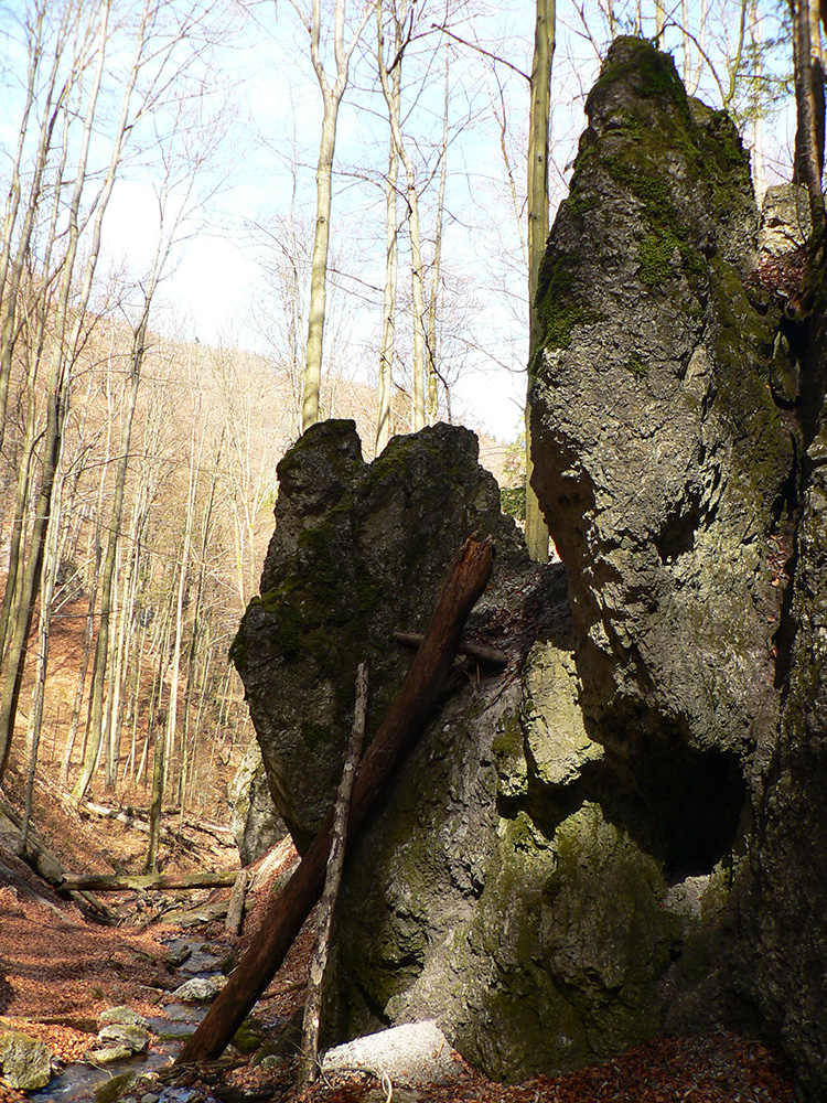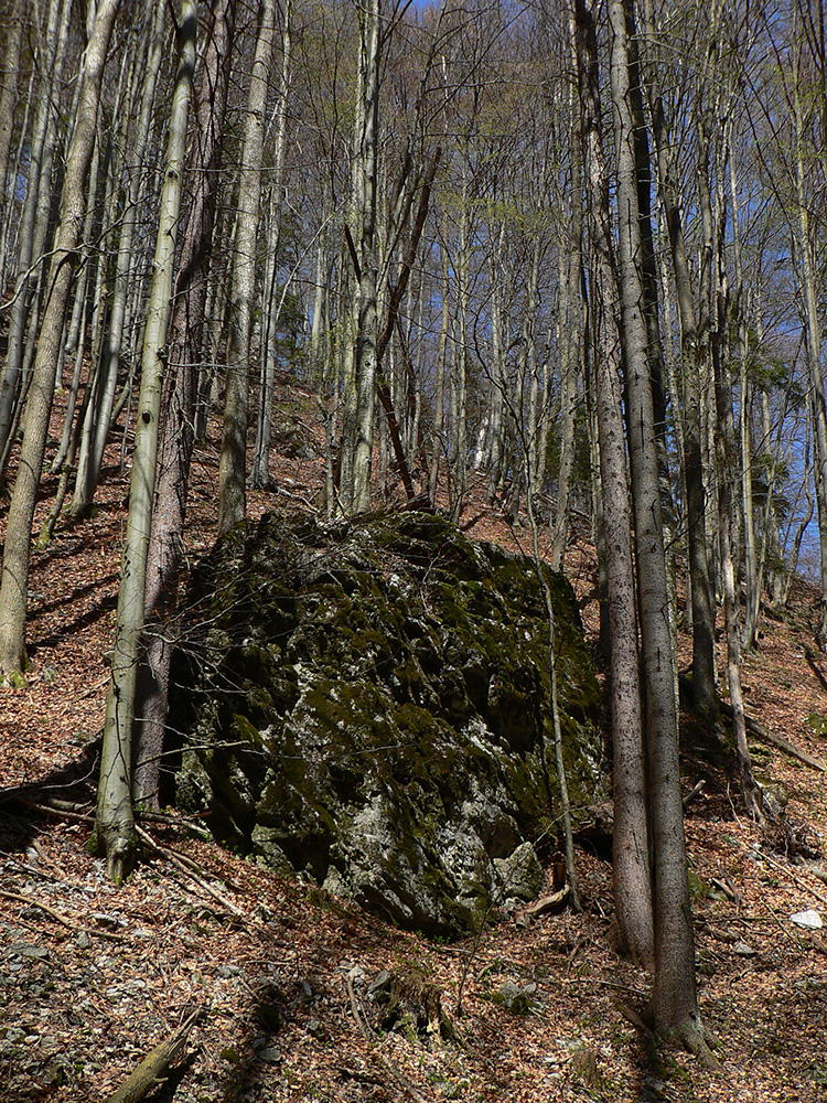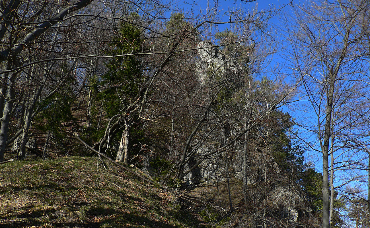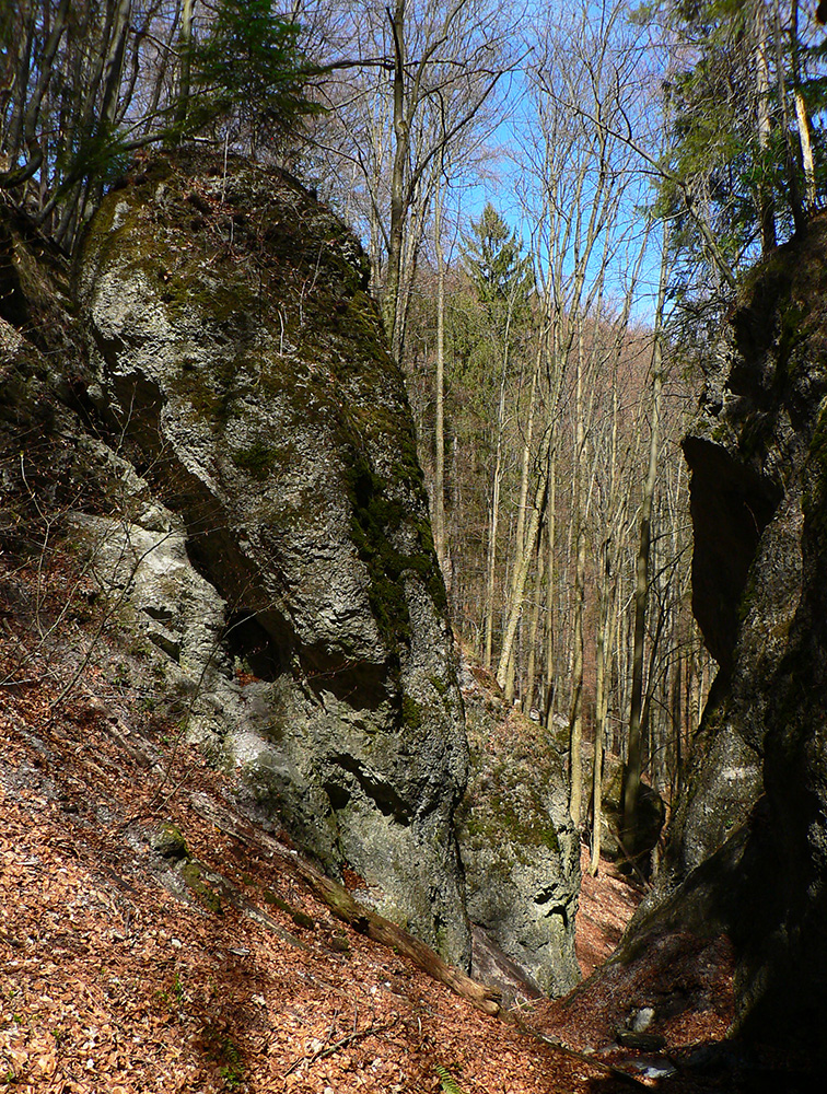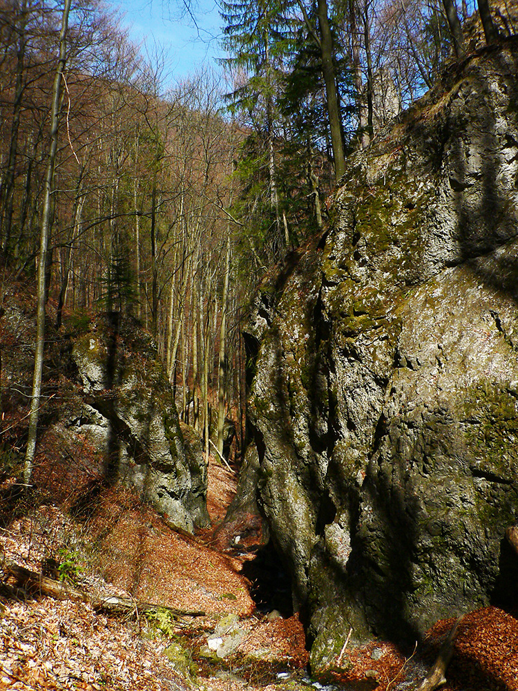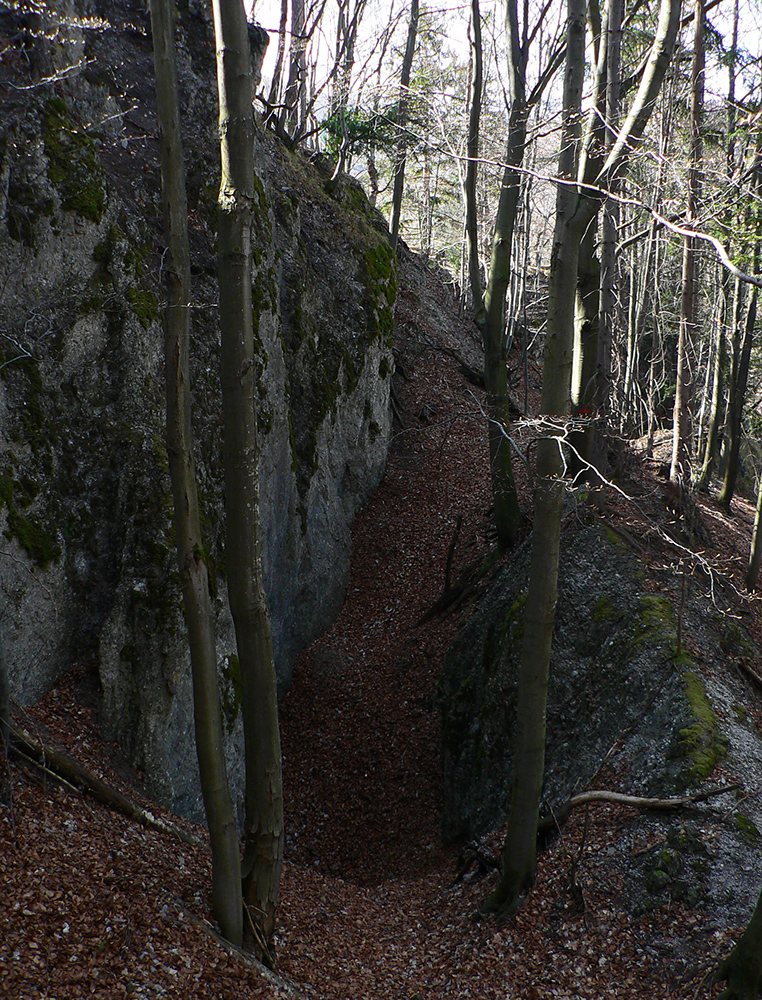 Chodník sa točí doľava a obchádza vrchol. Postupne sa vynárajú spomedzi stromov čoraz väčšie bralá a na severe parádna, hlboká skalná rozsadlina, do ktorej treba dole zísť. Možno by sa dalo aj skočiť do nej, tá perina z bukového lístia na jej dne sa zdá byť bezodná.