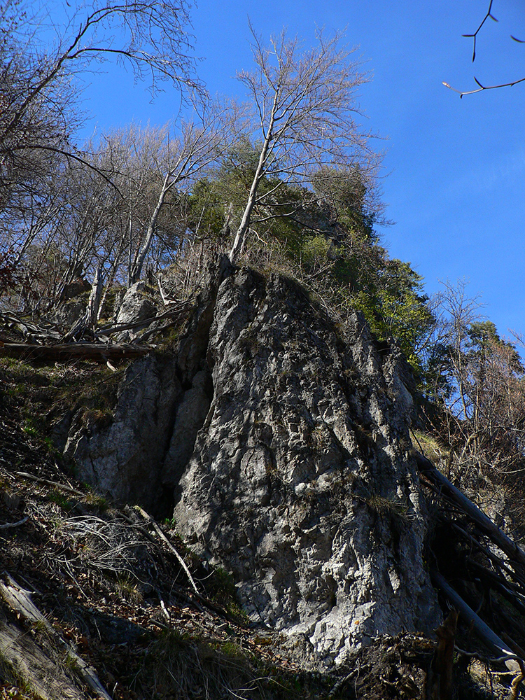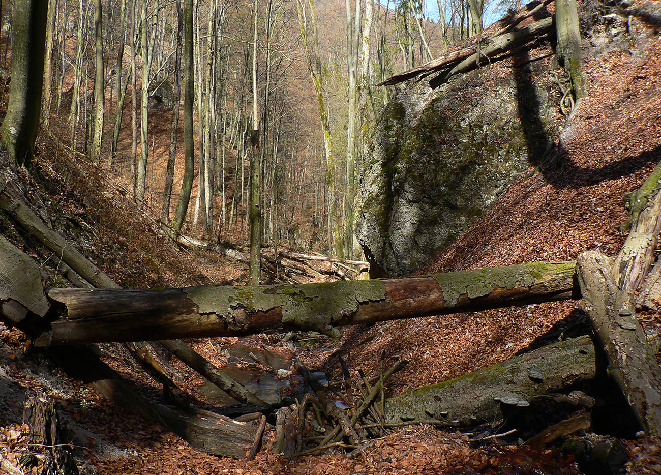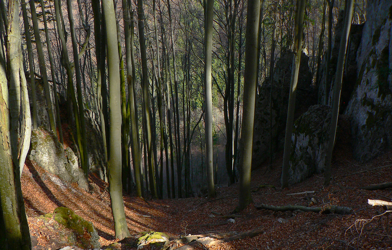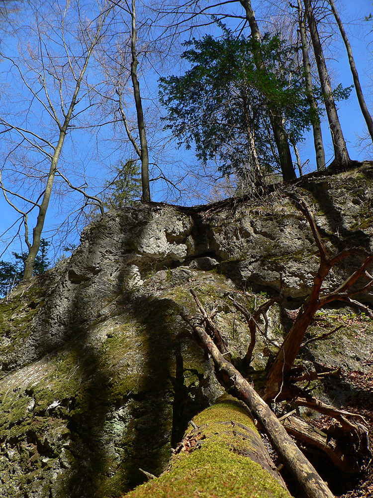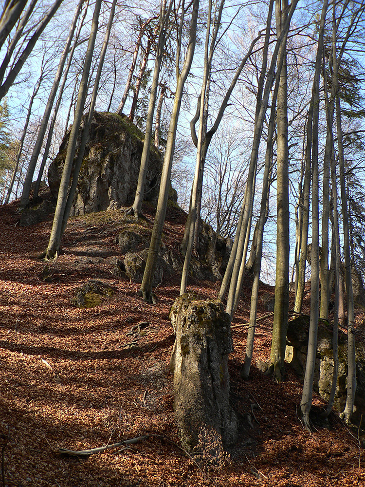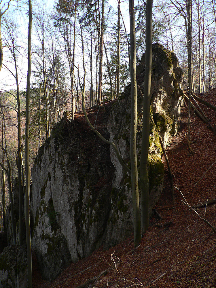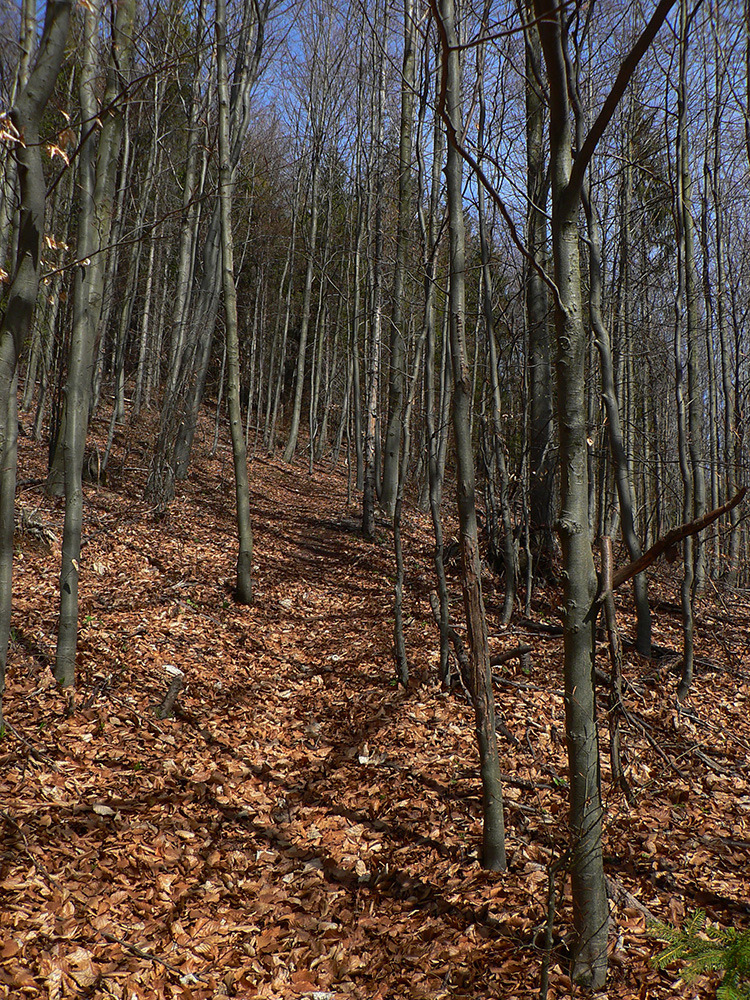 Chodník sa točí doľava a obchádza vrchol. Postupne sa vynárajú spomedzi stromov čoraz väčšie bralá a na severe parádna, hlboká skalná rozsadlina, do ktorej treba dole zísť. Možno by sa dalo aj skočiť do nej, tá perina z bukového lístia na jej dne sa zdá byť bezodná.