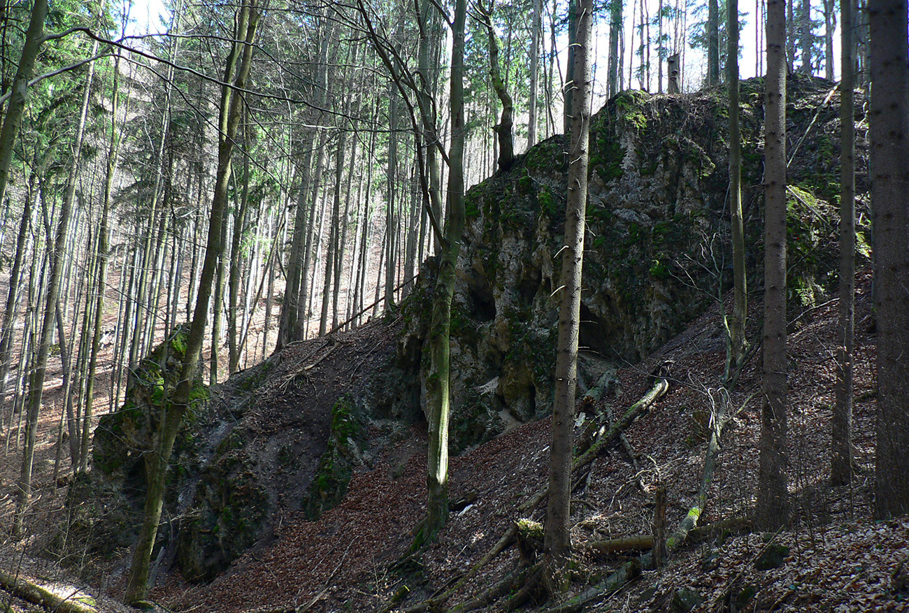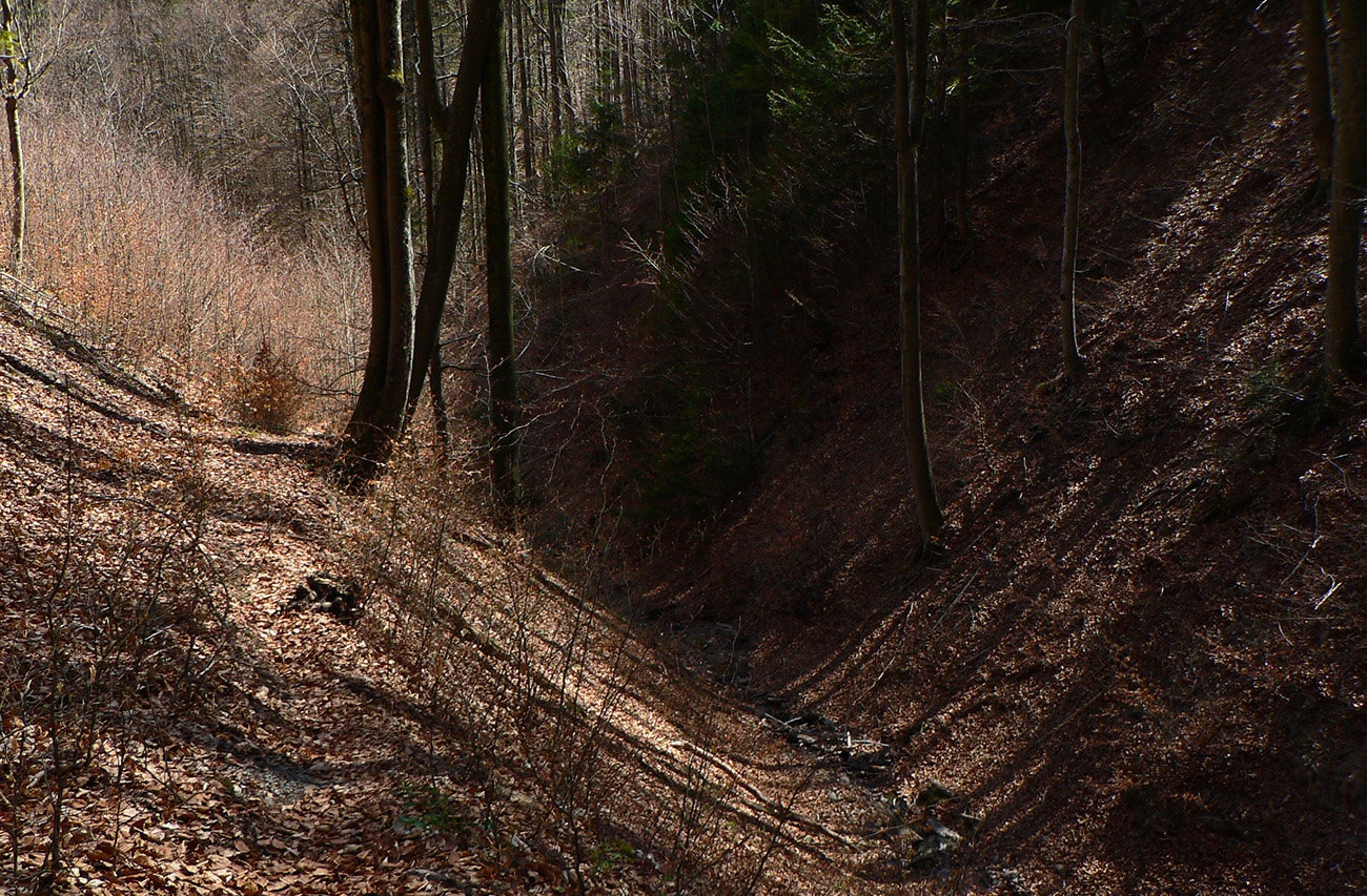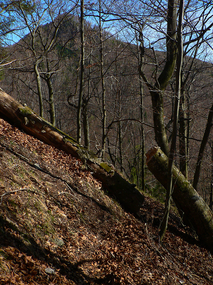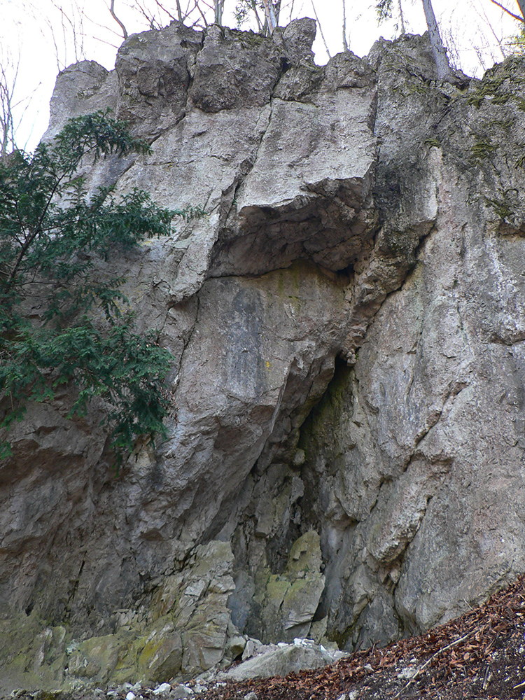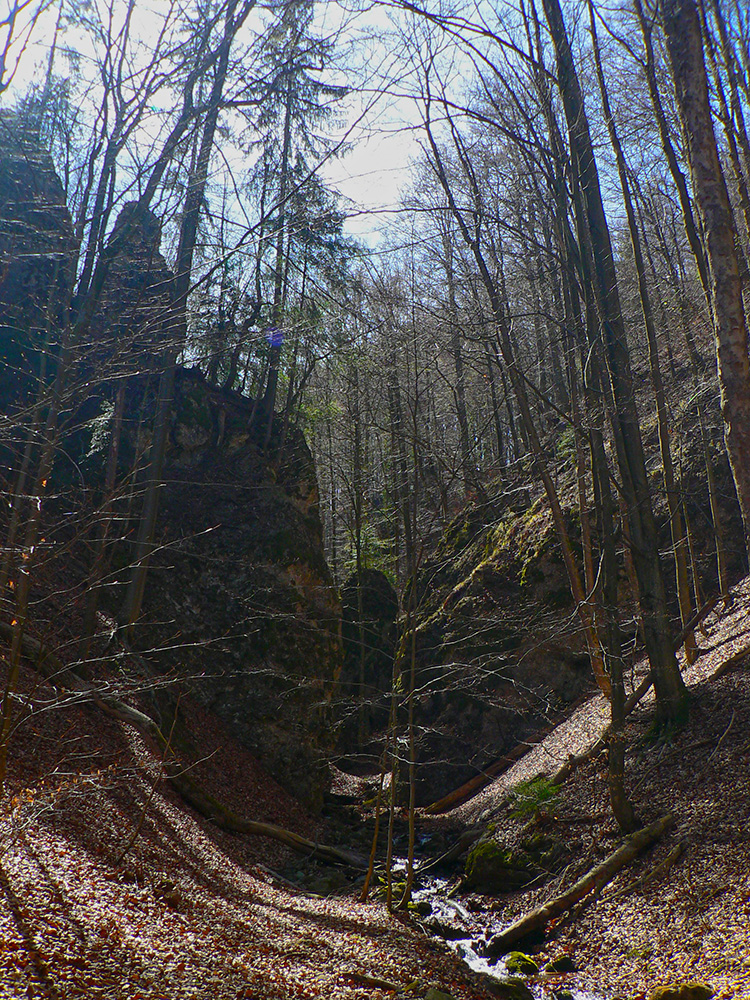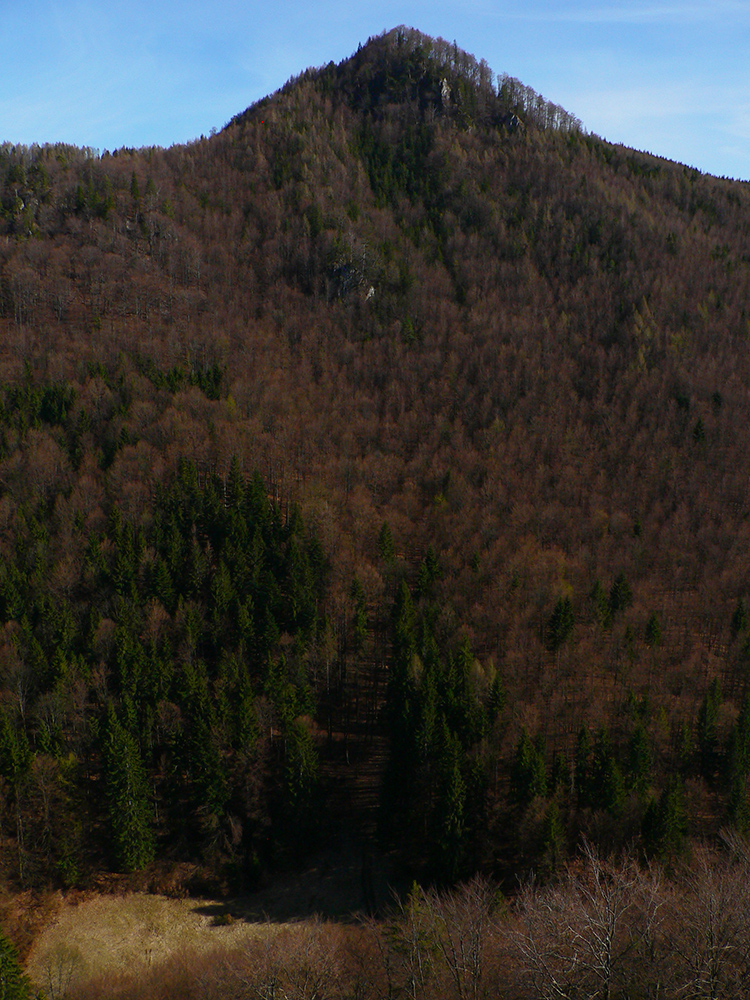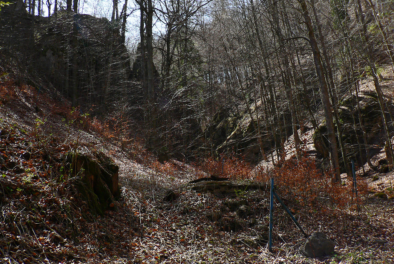 Chodník sa točí doľava a obchádza vrchol. Postupne sa vynárajú spomedzi stromov čoraz väčšie bralá a na severe parádna, hlboká skalná rozsadlina, do ktorej treba dole zísť. Možno by sa dalo aj skočiť do nej, tá perina z bukového lístia na jej dne sa zdá byť bezodná.