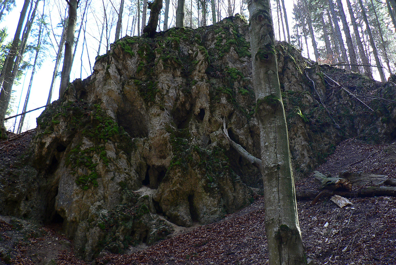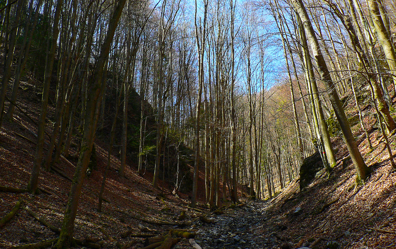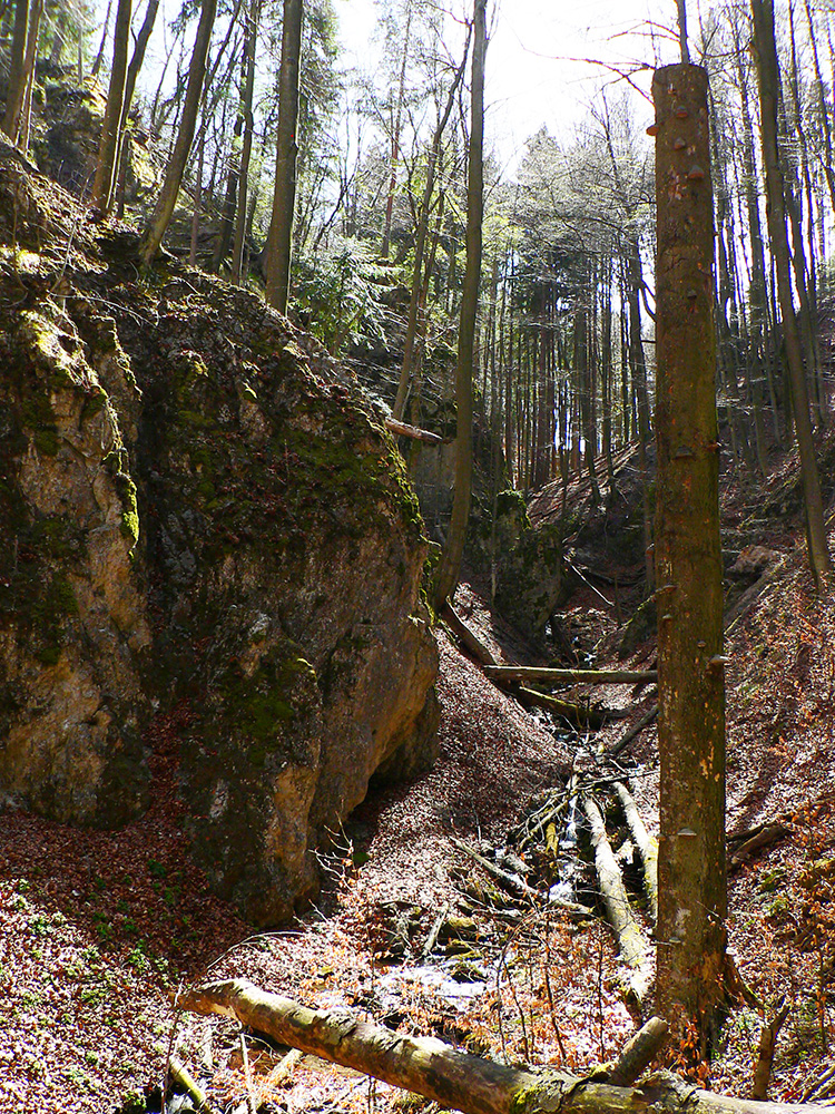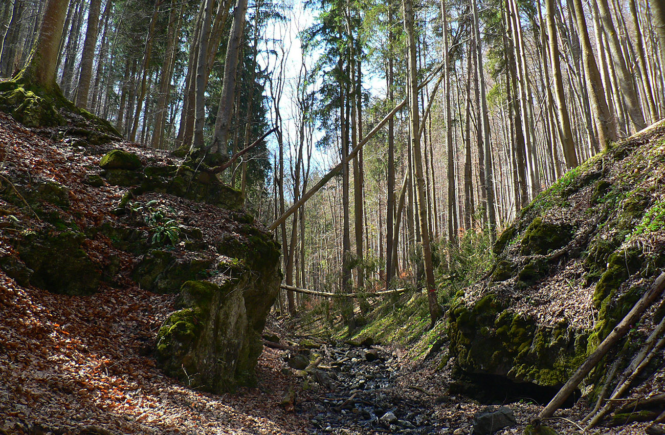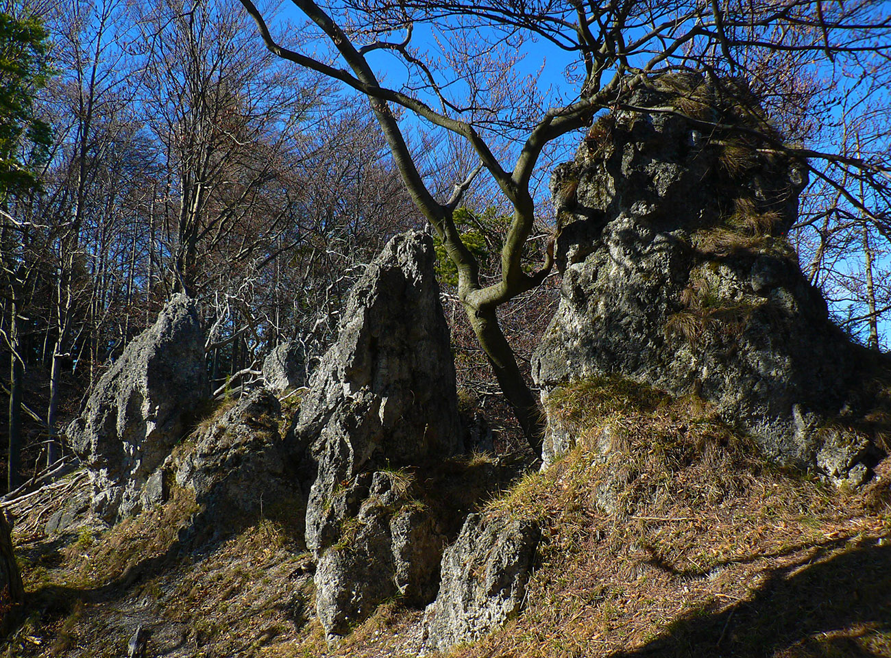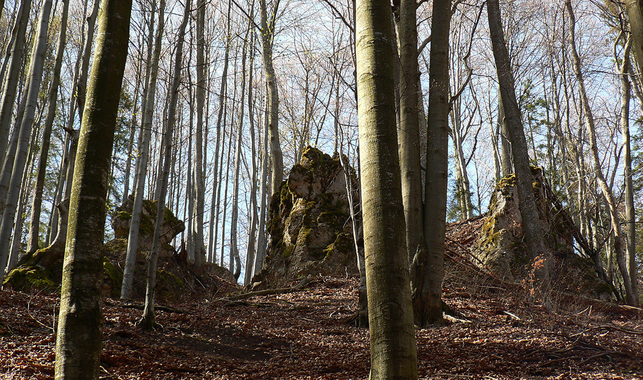Chodník sa točí doľava a obchádza vrchol. Postupne sa vynárajú spomedzi stromov čoraz väčšie bralá a na severe parádna, hlboká skalná rozsadlina, do ktorej treba dole zísť. Možno by sa dalo aj skočiť do nej, tá perina z bukového lístia na jej dne sa zdá byť bezodná.
