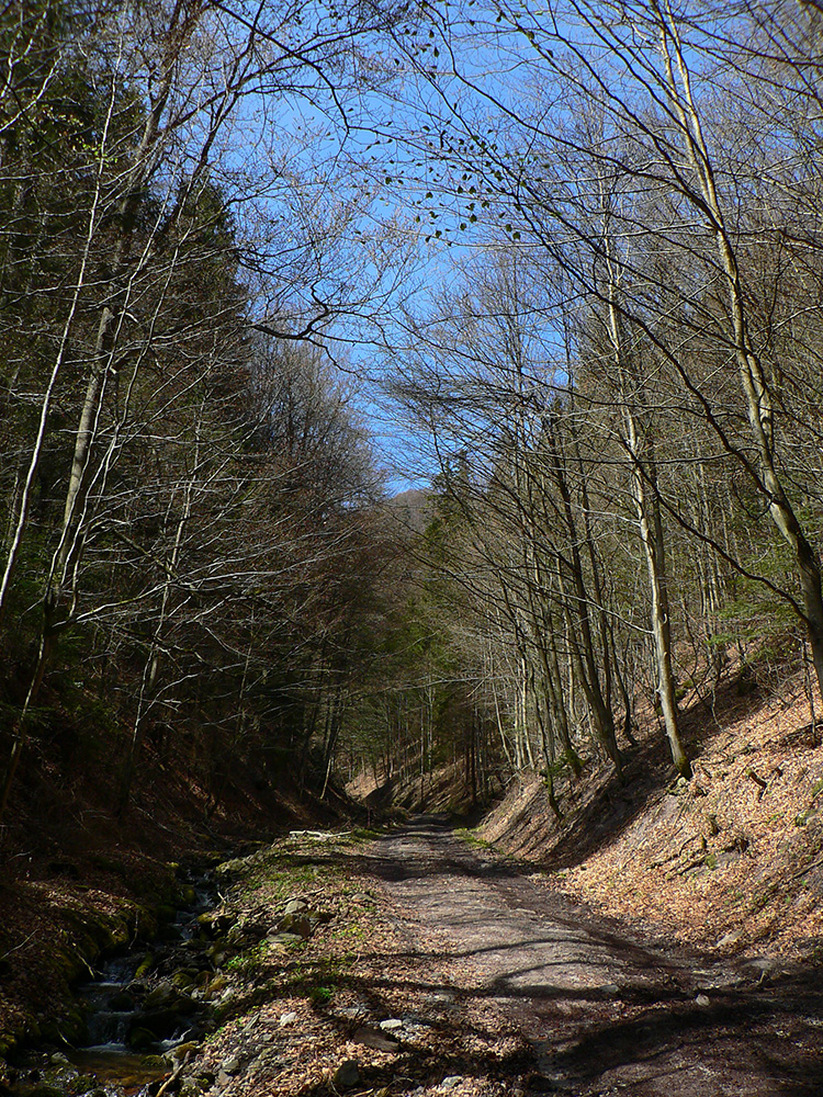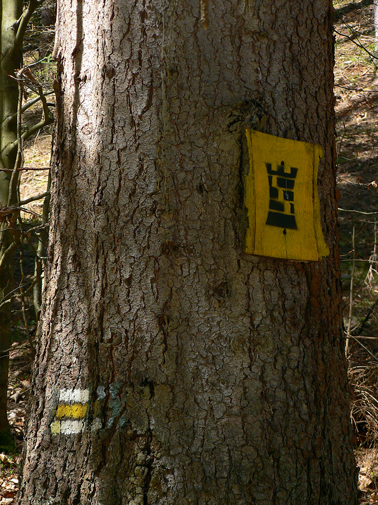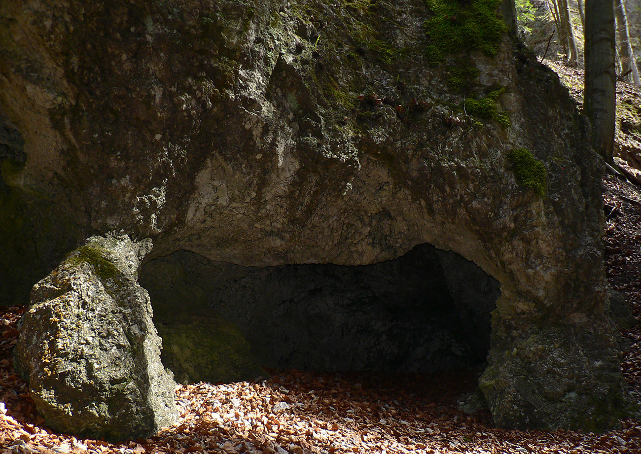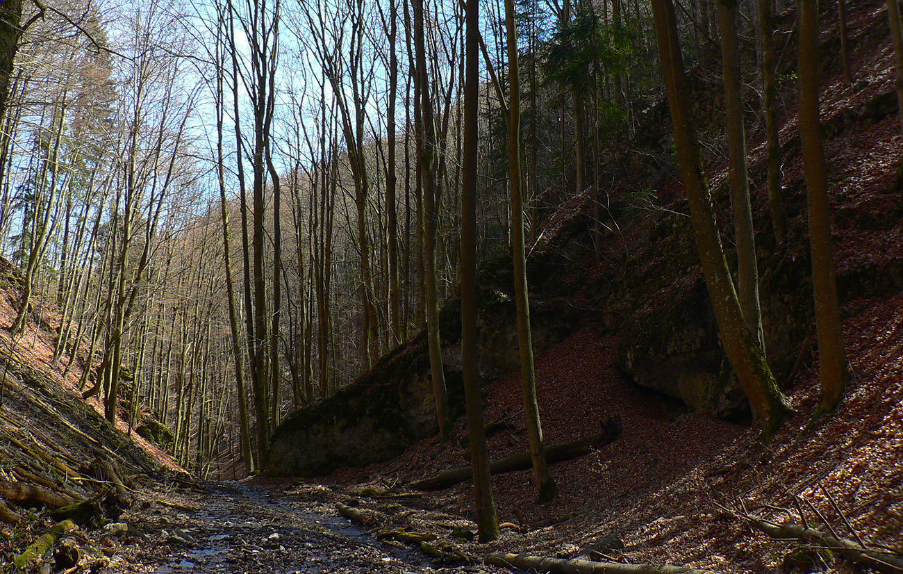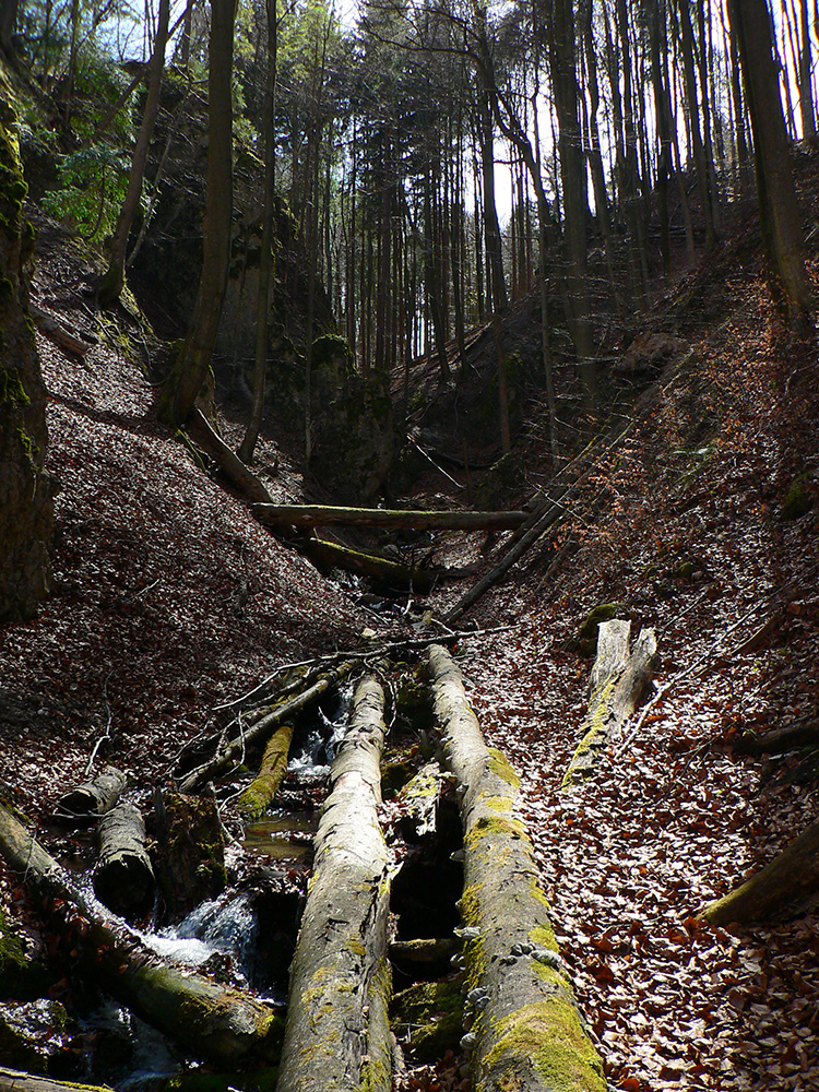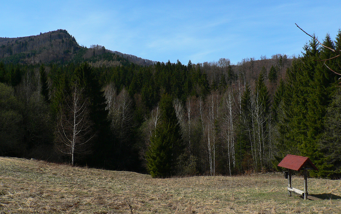 Chodník sa točí doľava a obchádza vrchol. Postupne sa vynárajú spomedzi stromov čoraz väčšie bralá a na severe parádna, hlboká skalná rozsadlina, do ktorej treba dole zísť. Možno by sa dalo aj skočiť do nej, tá perina z bukového lístia na jej dne sa zdá byť bezodná.