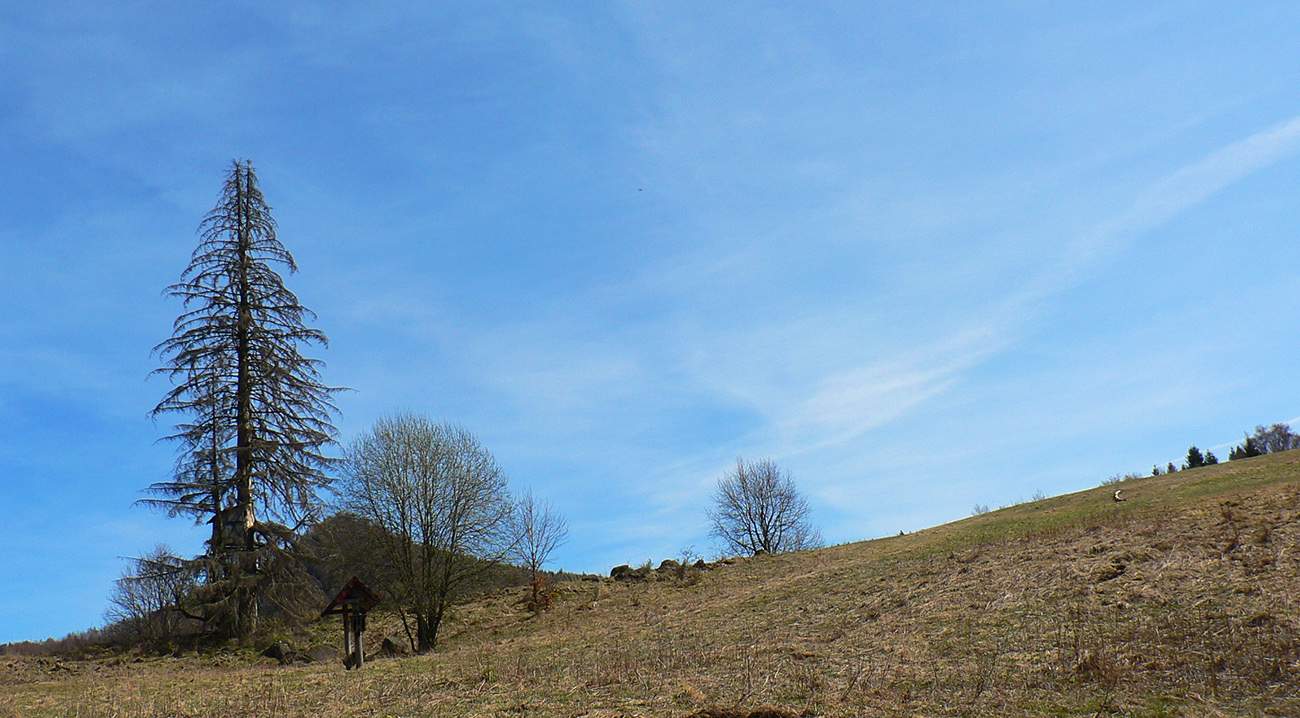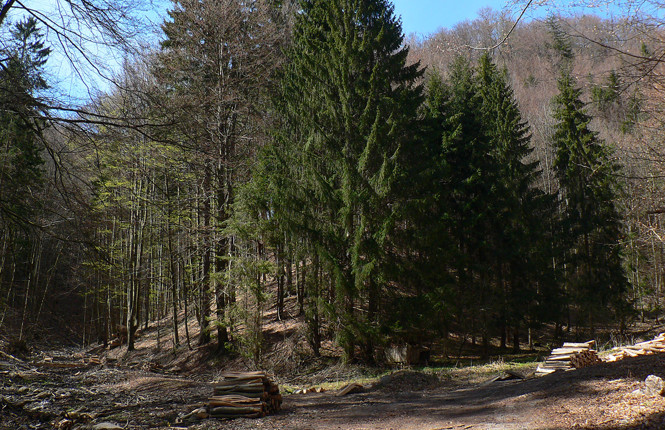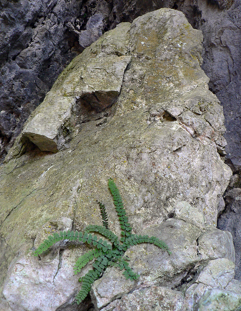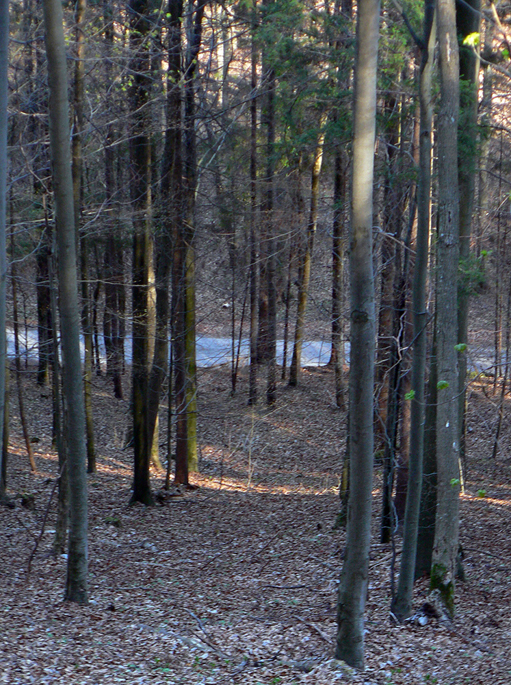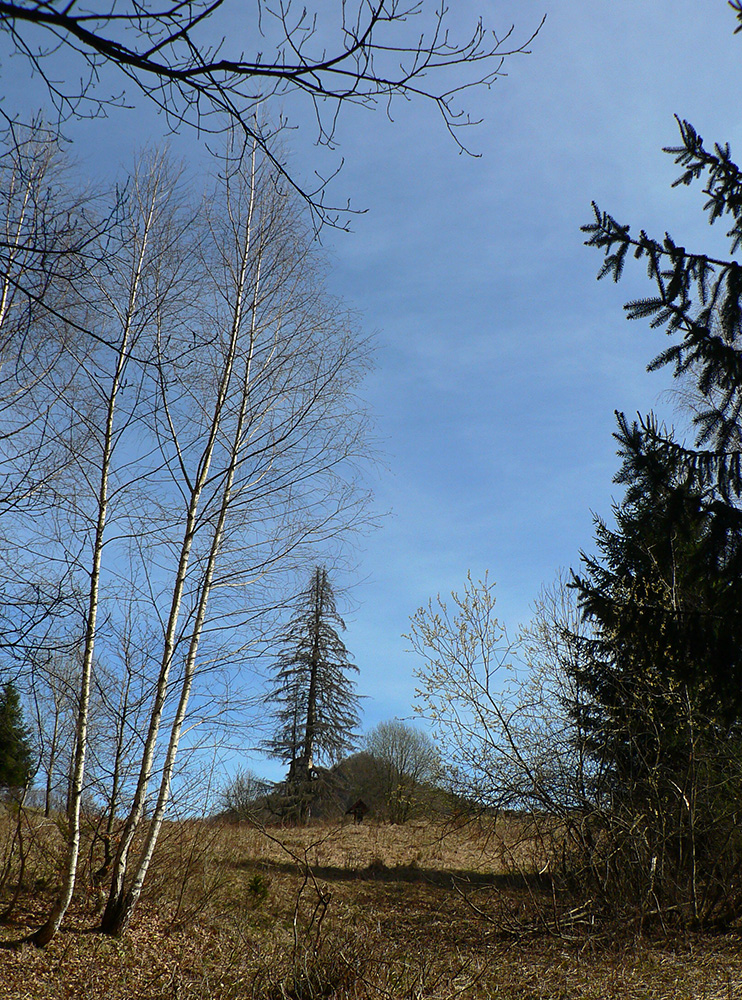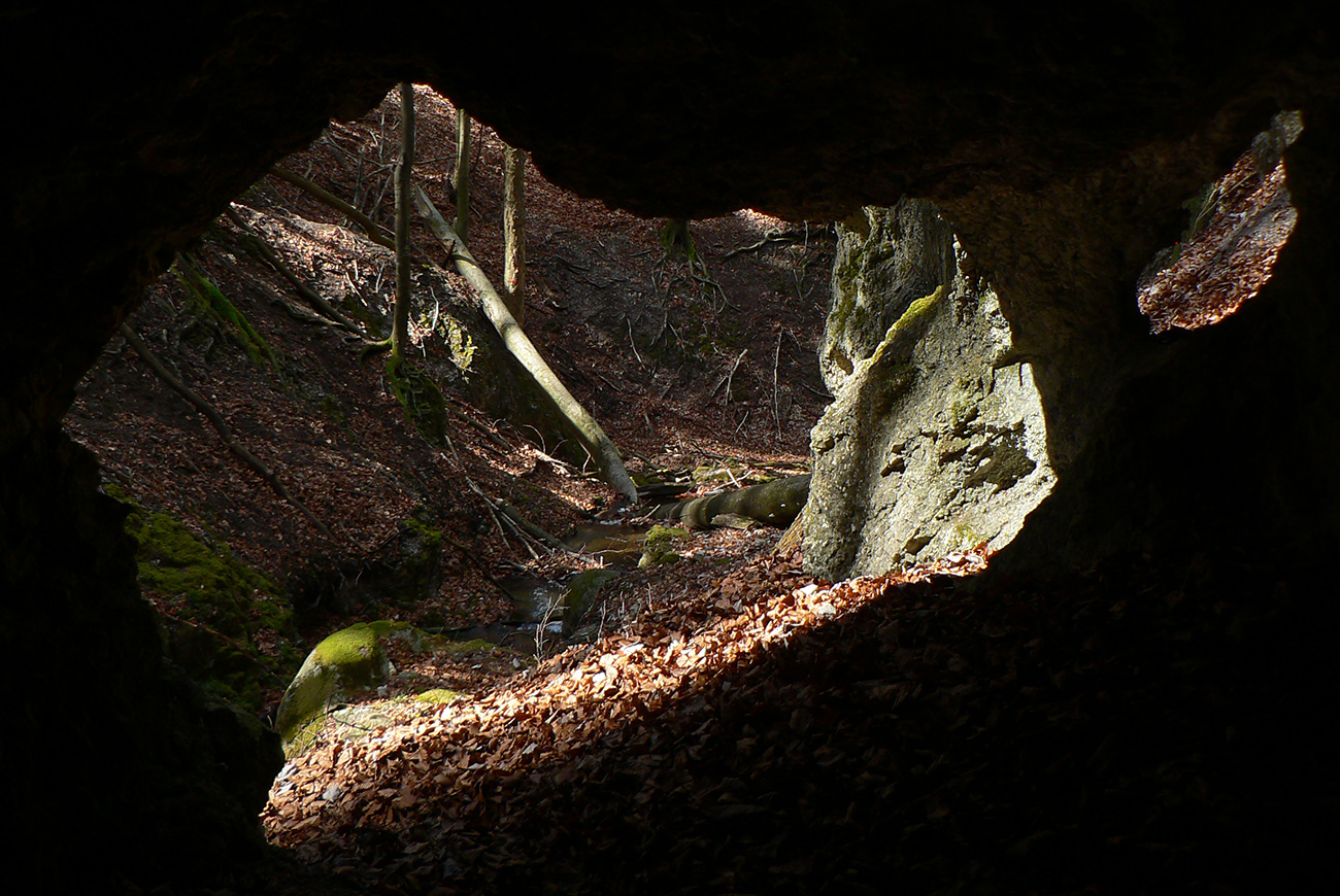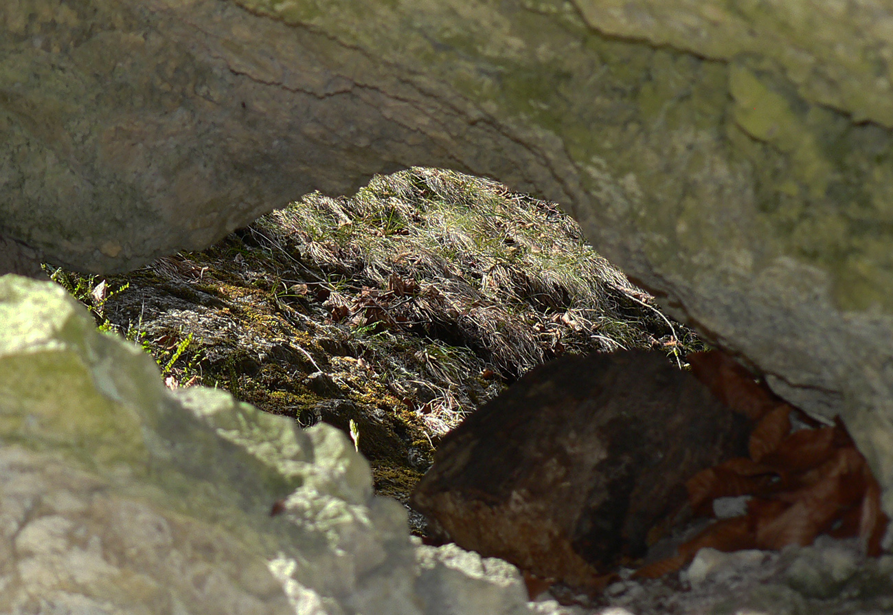 Chodník sa točí doľava a obchádza vrchol. Postupne sa vynárajú spomedzi stromov čoraz väčšie bralá a na severe parádna, hlboká skalná rozsadlina, do ktorej treba dole zísť. Možno by sa dalo aj skočiť do nej, tá perina z bukového lístia na jej dne sa zdá byť bezodná.