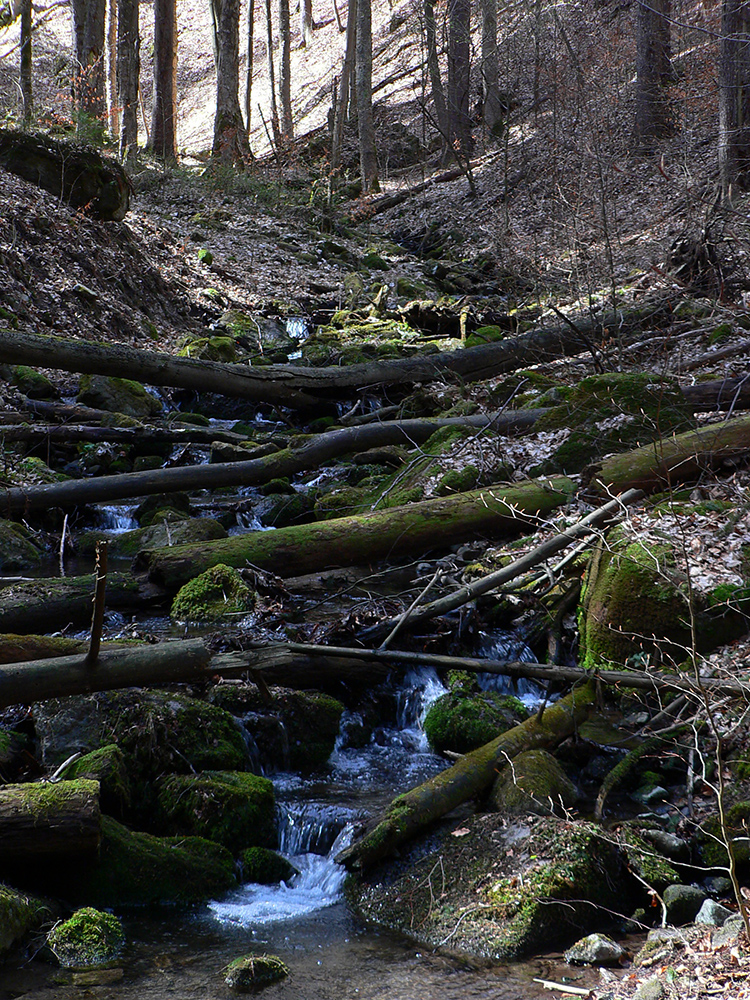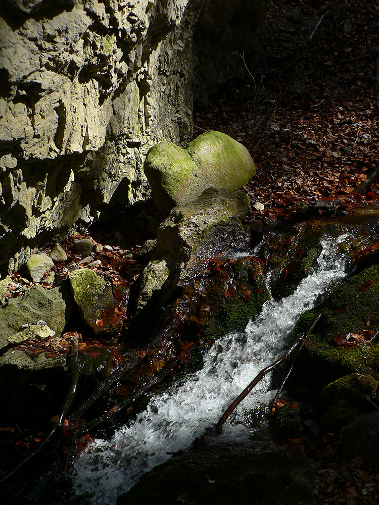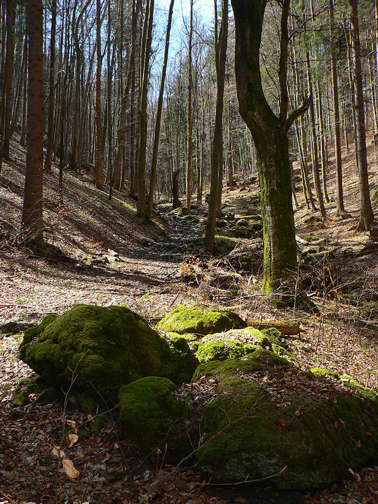 Onedlho sa objaví prvá skalná „bránka“ – nič dramatické, ale pekné je to. Nad ňou kus vyššie druhá. Potom sa dolinka rozšíri a potok je vystlaný nádhernými, machom obalenými balvanmi. A to je z dolnej časti Racvalovej všetko.