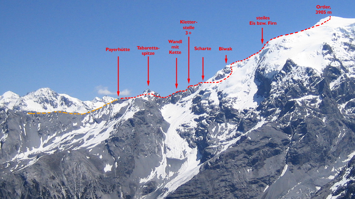 Hintergrat podľa Vetroplacha: štart o siedmej ráno zo Suldenu z parkoviska pri lanovke. Hintergrathutte za 1 hodinu a za ďalšie necelé tri hoďky vrchol Ortlera. Celkový čas 3h50min. V hornej časti som veľa fotil a v miestach pri Signalkopf som hľadal správnu cestu cca 10 min.