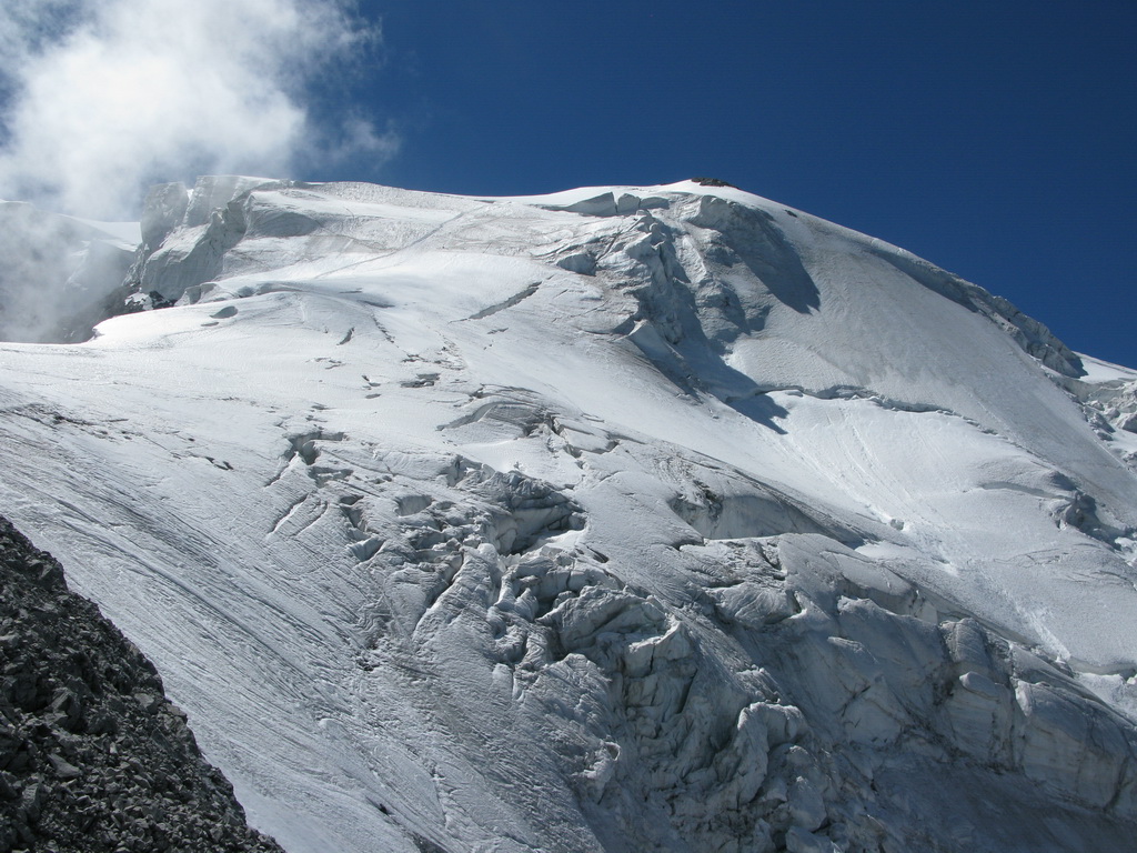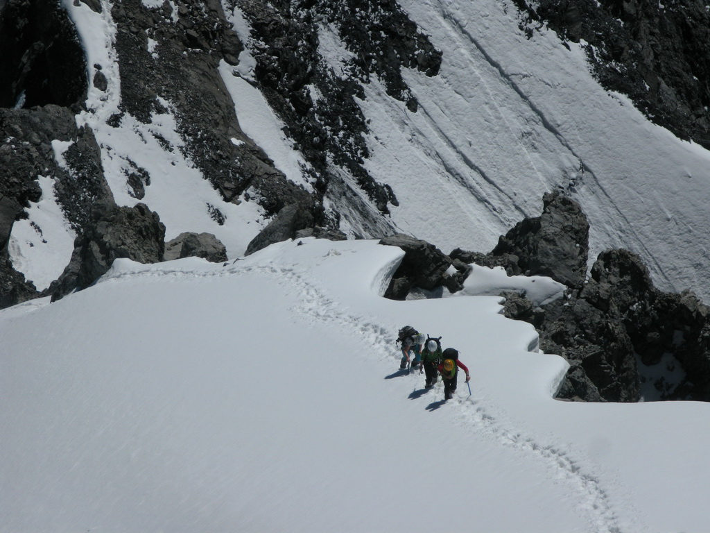 Po prelezení kľúčového miesta nasleduje najkrajší úsek. Veľmi pekné lezecké úseky (cca 3) až na vrchol. Prerušené je to druhým ľadovým poľom. Tu som mal prešľapanú stopu, bola dobrá a tak som mačky opäť nepoužil. Všimol som si že ľudia, ktorých som predbiehal, mačky nasadzovali, takže treba s tým rátať.