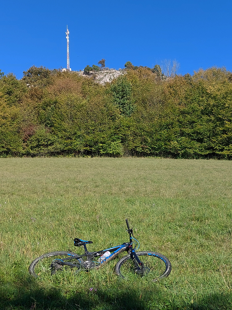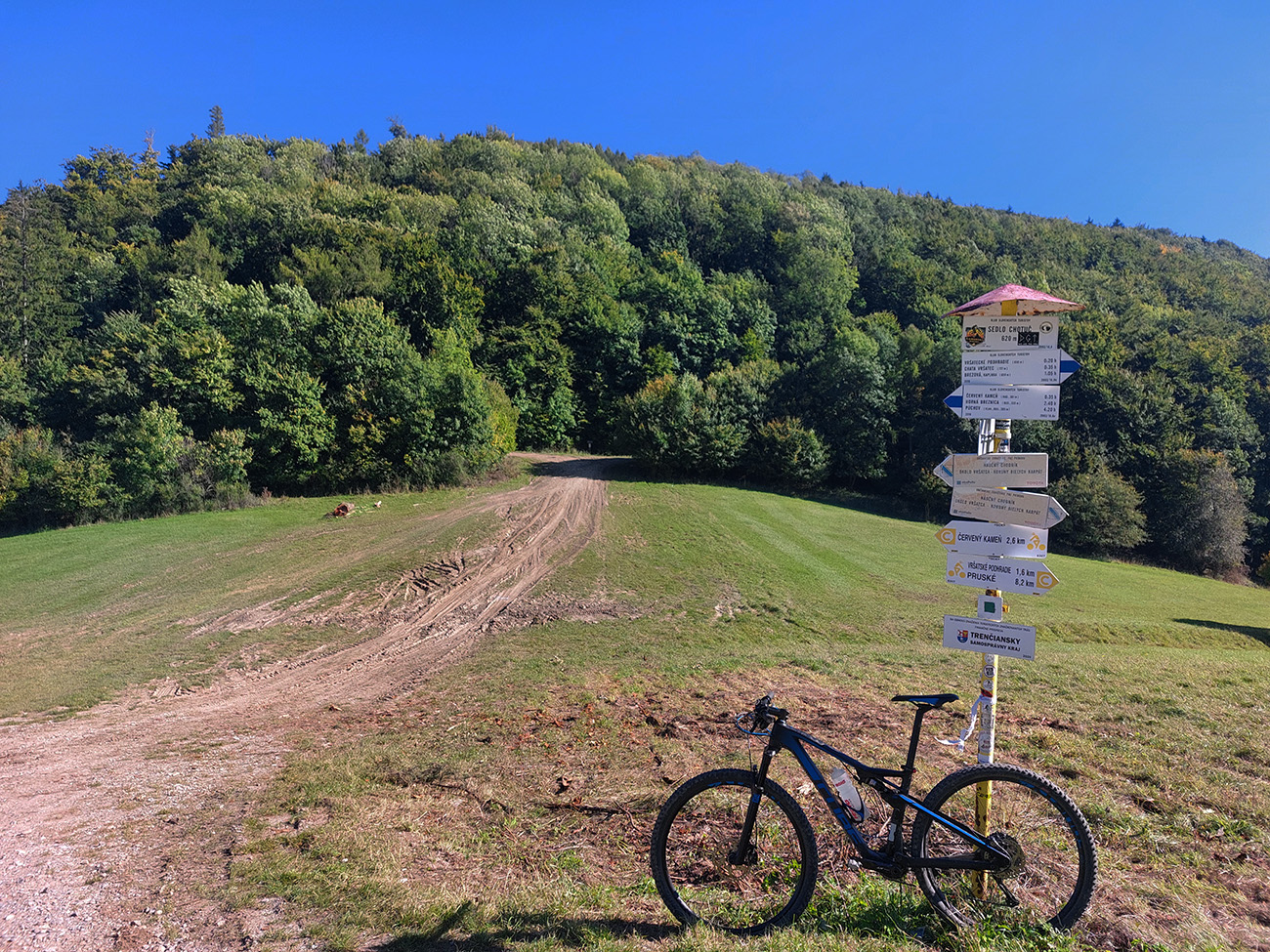 Od vysielača medzi Srním a Borčicami zošup „naslepo“ po lúkach bez ciest (podľa toho aj ten záznam trasy vyzerá, hehe...), úplne dole na nivu Váhu, na cyklotrasu, a tam začala druhá časť – dlhoooo hore kopcom, až na Vršatec, ale v miernom sklone. Prevažne lesom, len dole ešte nejaké tie lúky s výhľadmi. Začiatok prevažne po hline, v Bolešovskej doline (aj na jej svahoch) kilometre drssssného asfaltu a šotoliny, záver potom po kamenistej zvážnici. Dole prejazd popri spustnutých sadoch, vyššie farebné lesy, lesnícky náučný chodník okolo horárne Chrastková a jedna malá rozhľadňa.