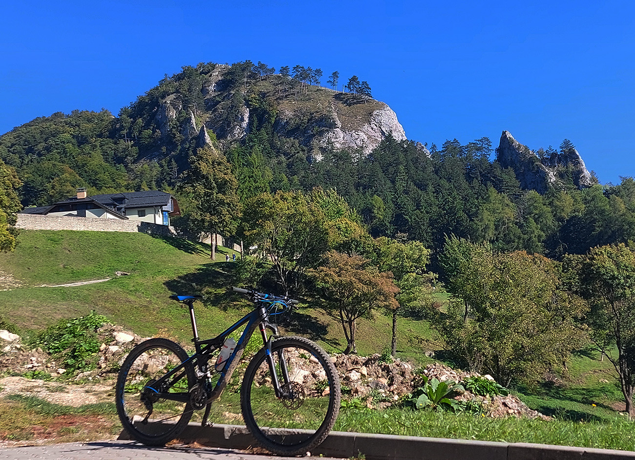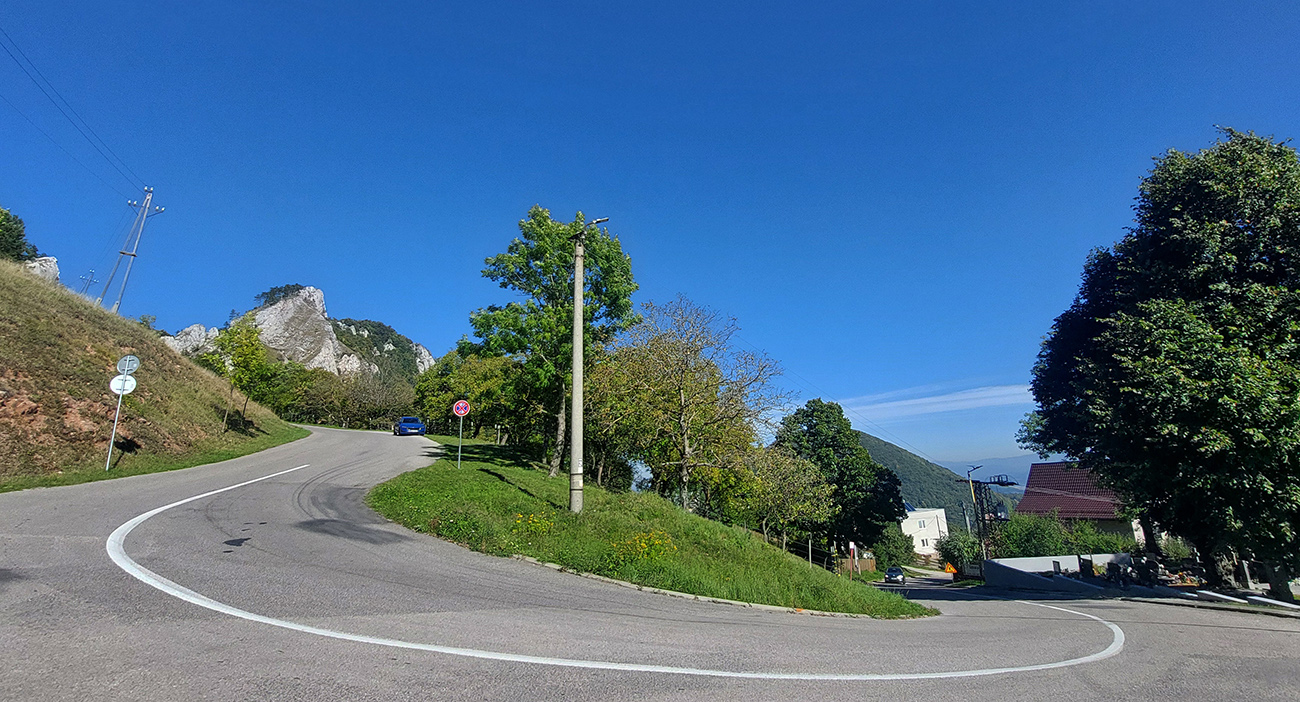 Pod Vršatskými bradlami plno, autoturistika poriadna, len som sa pokochal skalami a panorámou kotliny na východe. A davaj dole, do poslednej „etapy“. Tou bol dlhý a miestami strmý zjazd zo sedla Chotuč do Pruského (zelená značka). Opačne by som to teda ísť nechcel. Na bajku, pešo by to bola príjemná prechádzka. Zas početné výhľady, tým na sever a východ už slnko nevadilo.