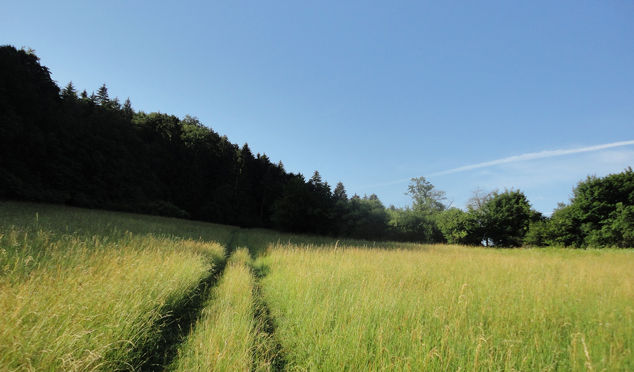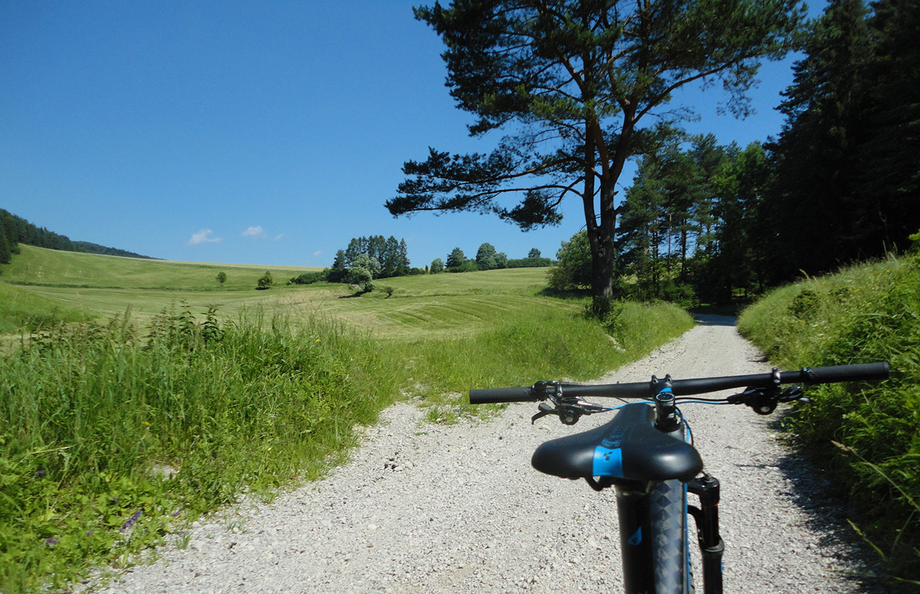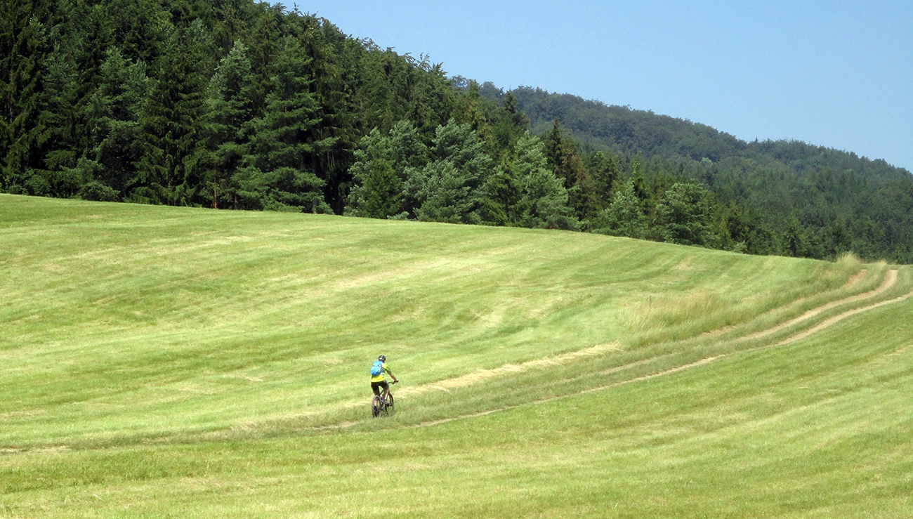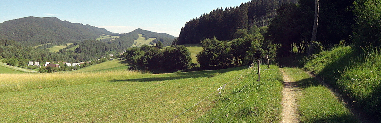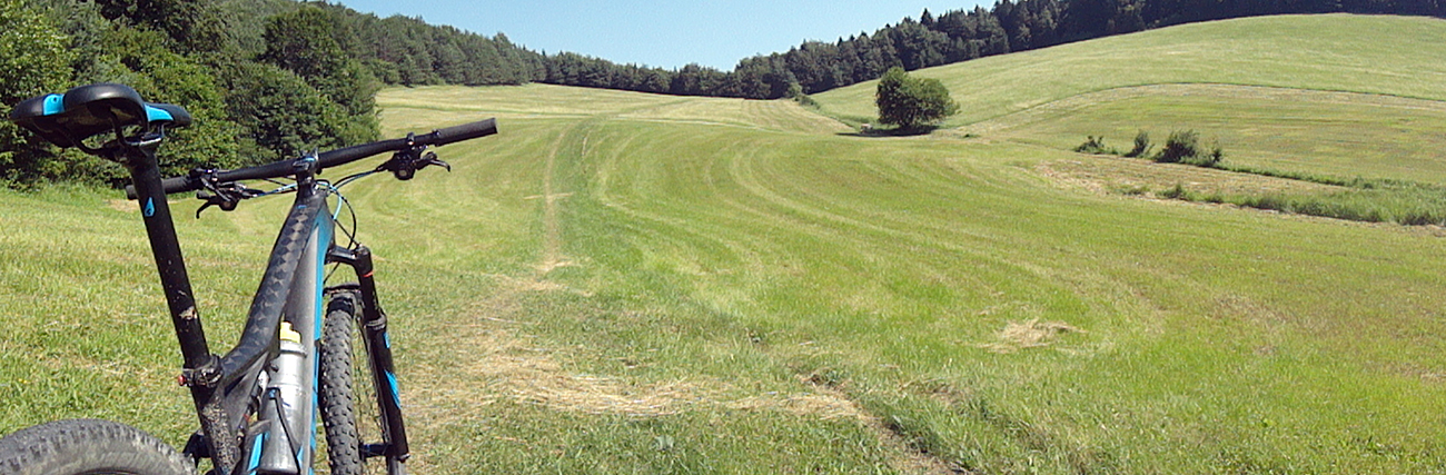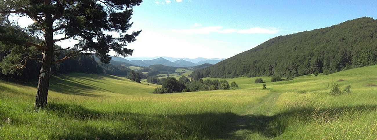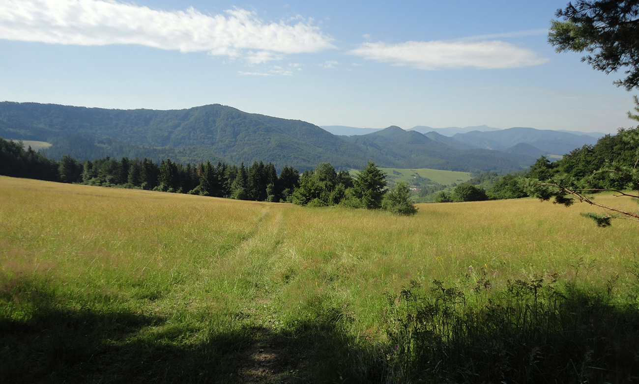 Potom to už zase bolo jednoduché, vlastne až do konca, lebo dobre značené. Do Podhoria po cyklotrase cez polia a za Podhorím konečne zas po pekných lúkach smerom do lesa, už aj po turistickej modrej. Južný predfrontový vietor príjemne pomáhal do chrbta a zmierňoval tropický hic, ani ovady nemali šancu. Super.