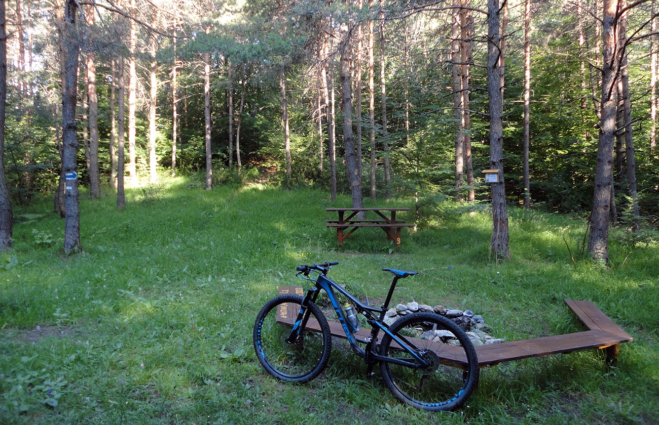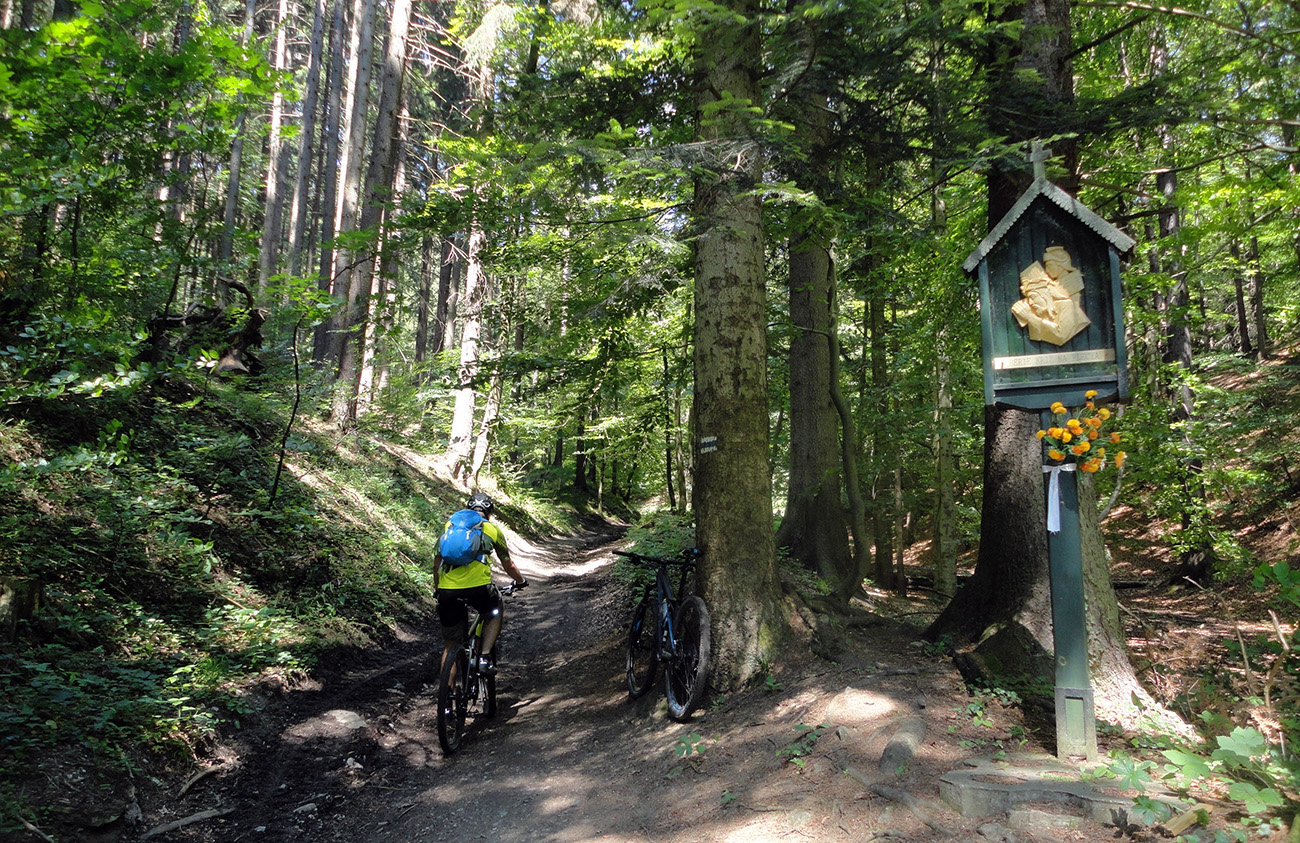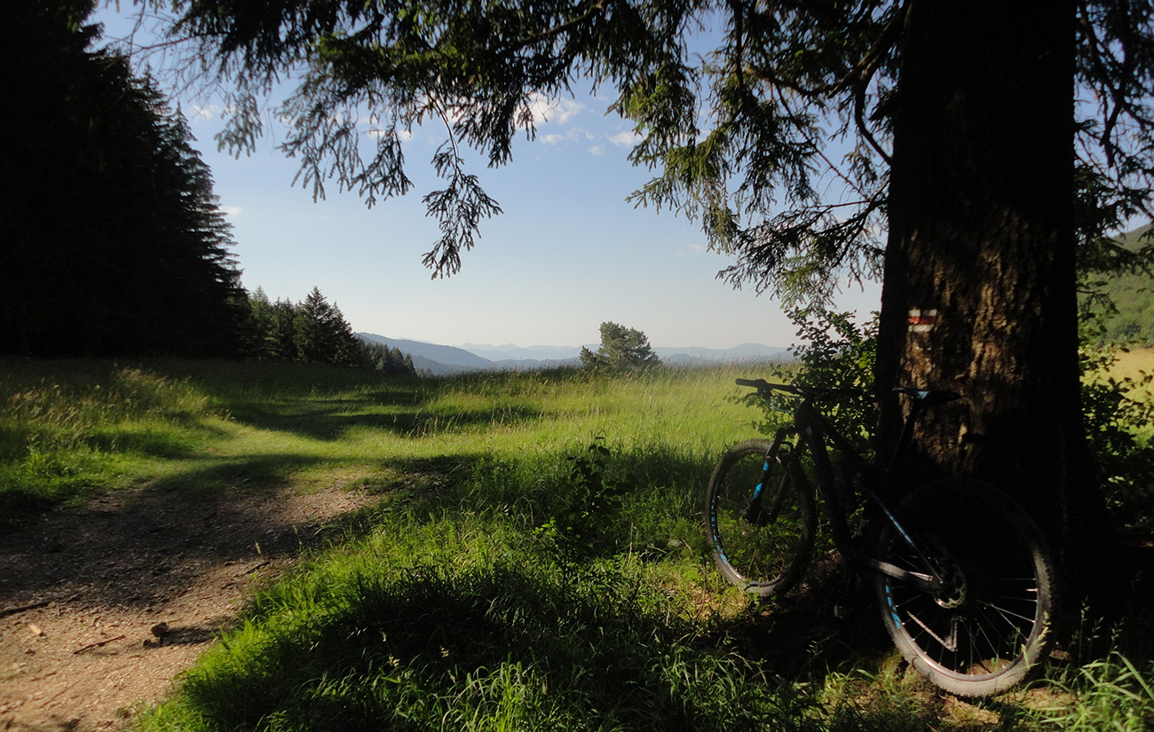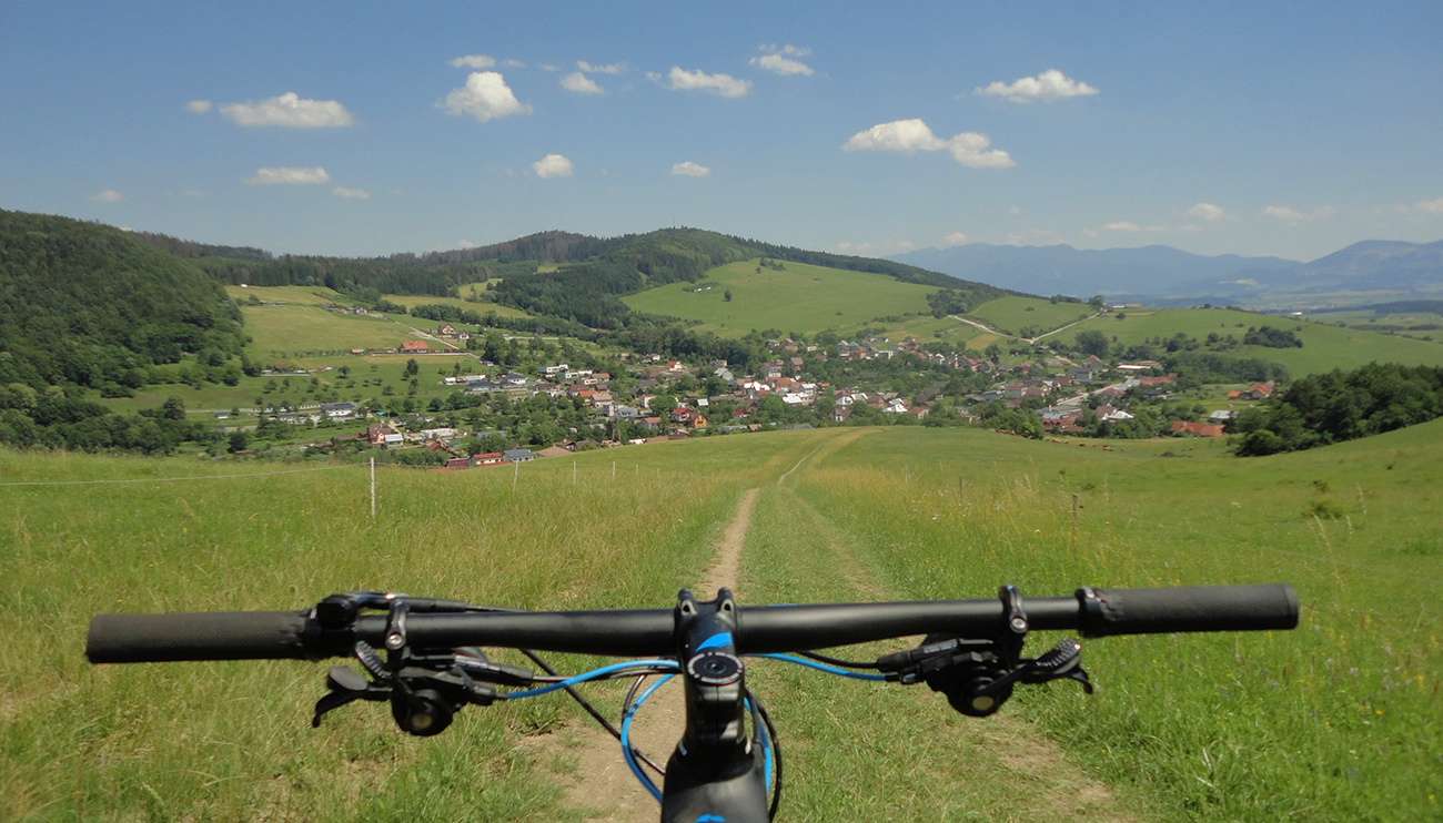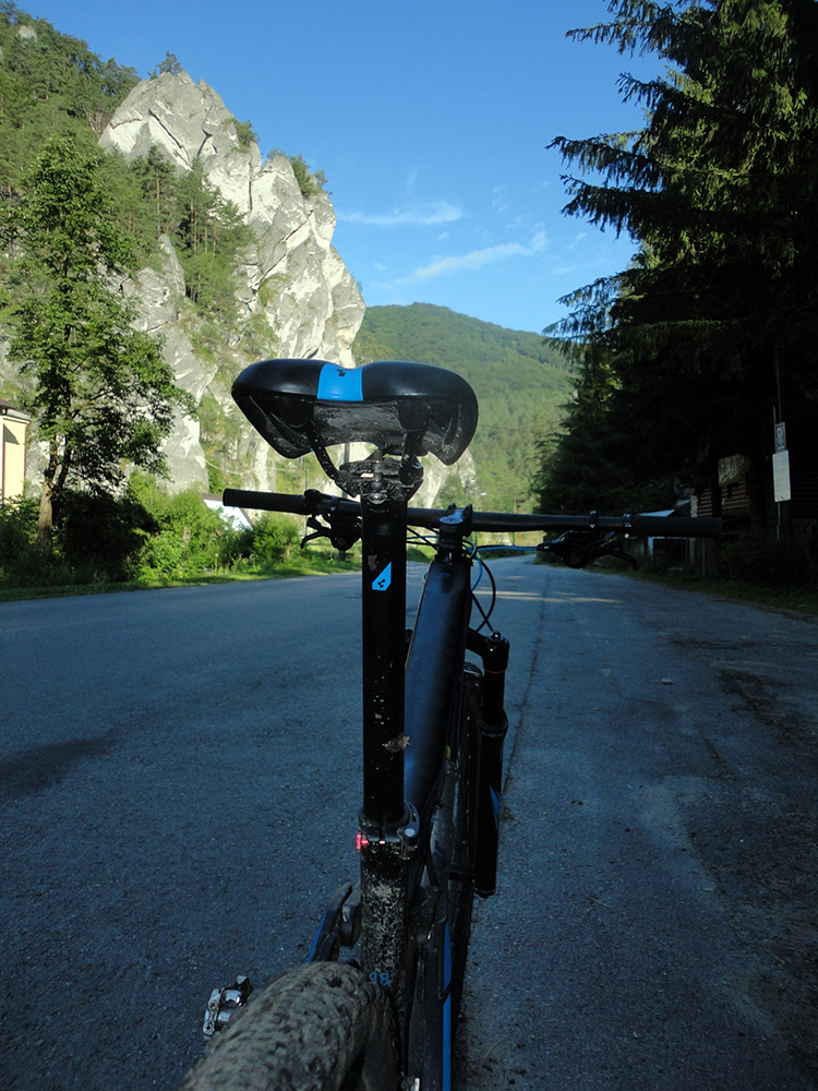 V Sedle pod Bradou ešte stále bolo čerstvé ráno, ešte skoro na davy výletníkov, tak som sa zošuchol po červenej (Jemne a pomaly, bez stôp po brzdení!) až na parkovisko v tiesňave. Len jednu rodinku som stretol, aj to na širokom chodníku. Príjemný zošuch, len hore miestami mierne technický, kameňatý, koreňatý. Dole ponad dedinu k parkovisku úzky singlík. Tak len jemne, opatrne bolo treba, ak by niekto z protismeru...