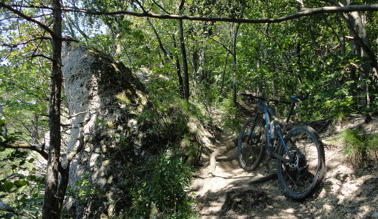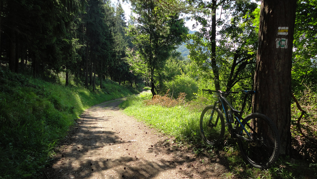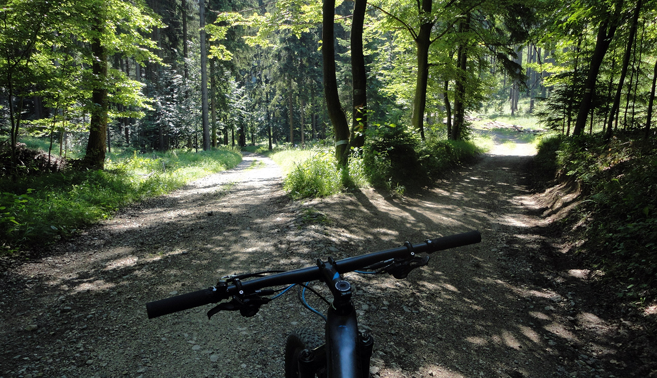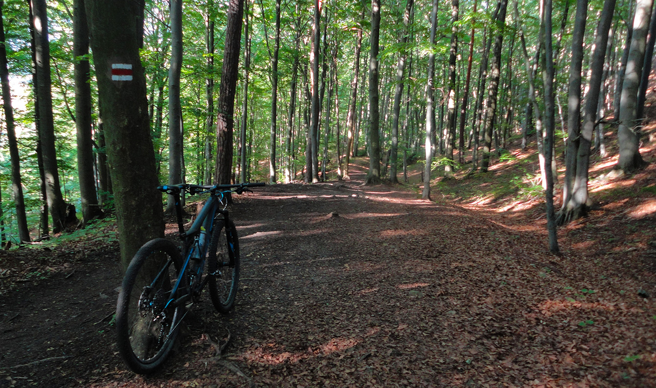 Prvé klesanie a stúpanie som zvolil podchodom od vlaku, preč zo stanice v Bytči - Hrabovom. Potom chvíľku popri ceste, vpravo vbok a začal som stúpať po modrej značke do Sedla pod Bradou. Toto je asi najpohodovejší prístup na hrebeň od západu aj pre bajkera. Len zo tri razy sa bolo treba „viac kusnúť“ a vydupať krátke, prudké stojky. Ale celkovo príjemne, v lesnom tieni sa tu ide skoro všetko: