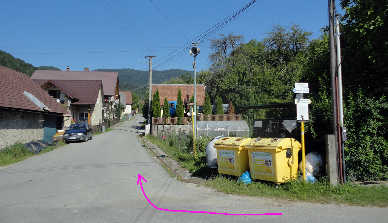 Úplne iný svet – rozsvietený, ale ešte júlovo nerozhicovaný. Rýchlo som bol dole v dedine, pri pamätnej drevenici. Zatiaľ prvý raz, lebo som plánoval ešte nadstaviť malé kolečko cez Bodinú. Po žltej tam, po modrej nazad. Po modrej aj cyklotrasa vedie. Takže z námestia najskôr po spoločnej trase so žltou cyklotrasou a zelenou turistickou značkou. Odbočka na moju žltú výrazná, ale pozor – neoznačená. Len sa tá žltá proste z priameho smeru stratila :-)