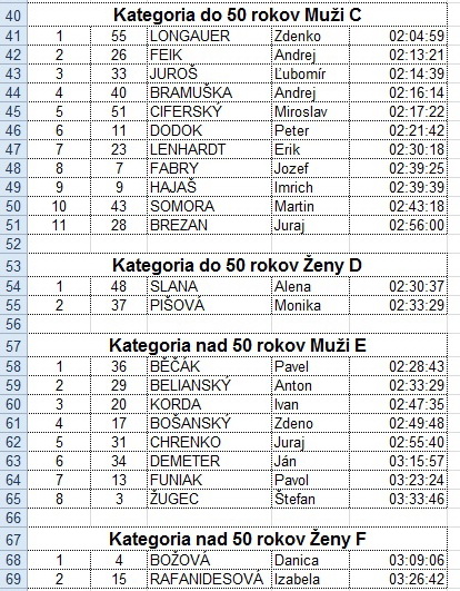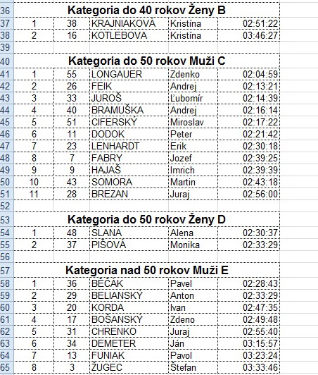 V cieli potom čakalo na dobiehajúcich občerstvenie – jednohubky, pivo, kapustnica, kofola. Nechýbala živá kapela. Vyhodnotenie bolo po jednotlivých kategóriách. Celkovo štartovalo 55 účastníkov. Najrýchlejší čas atakoval hranicu 2 hodín. Po vyhlásení nasledovala tradičná tombola, v ktorej vyhral takmer každý.