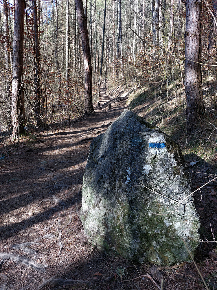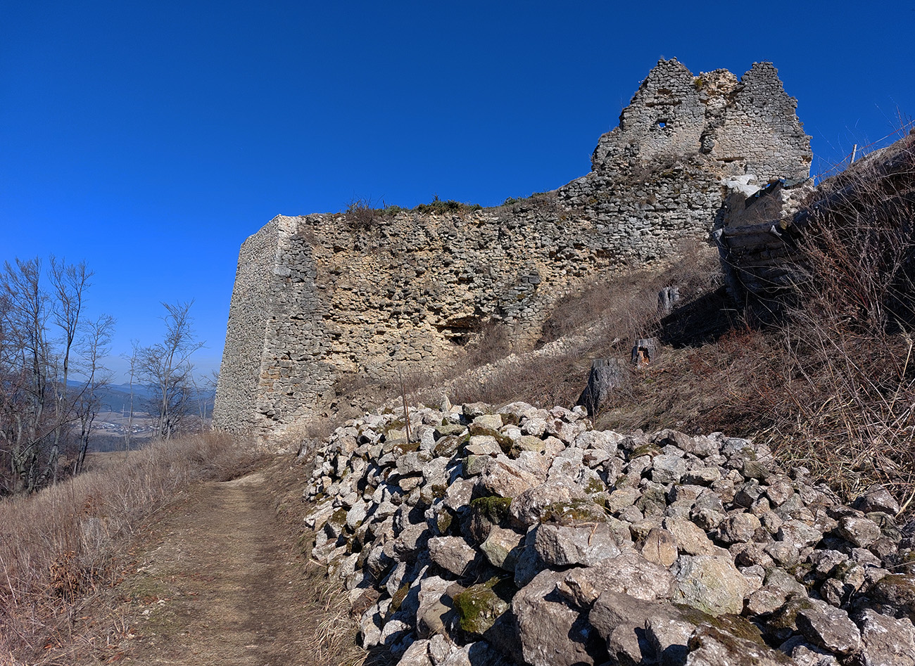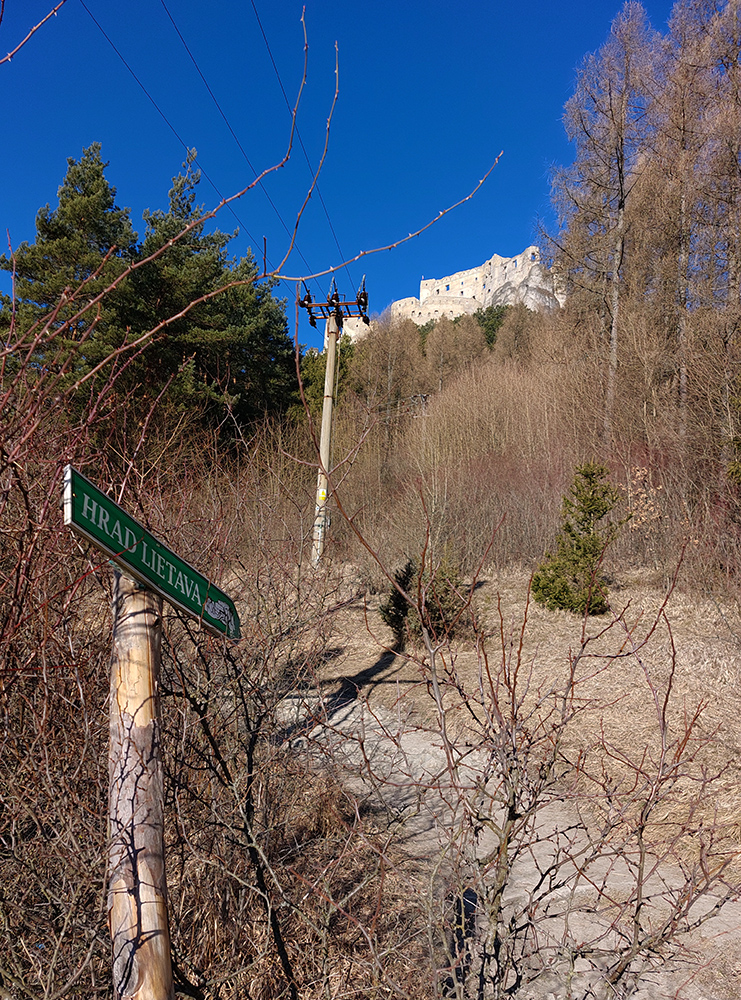 No a aby som sa dole k autobusu nevracal rovnako, z hradu som sa do Lietavy zošuchol po príjemnom chodníku, ktorý vedie priamo spod jeho severných hradieb. Zas iné pohľady na jeho majestát, aj keď som ich mal proti slnku. Hrebienky na sever sú dva, ale dedinu dole počuť aj vidieť, zablúdiť sa nedá, len o kúsok inde prísť :-) Treba proste ísť viac doprava, trochu navádzajú aj zvyšky nejakej miestnej bajkovej trate. Skoré predjarie je inak na túto prechádzku super, lebo pomedzi holé stromy dobre vidno tie skalné steny a veže. Kto chce, hore má aj gpx – šťastnú cestu!