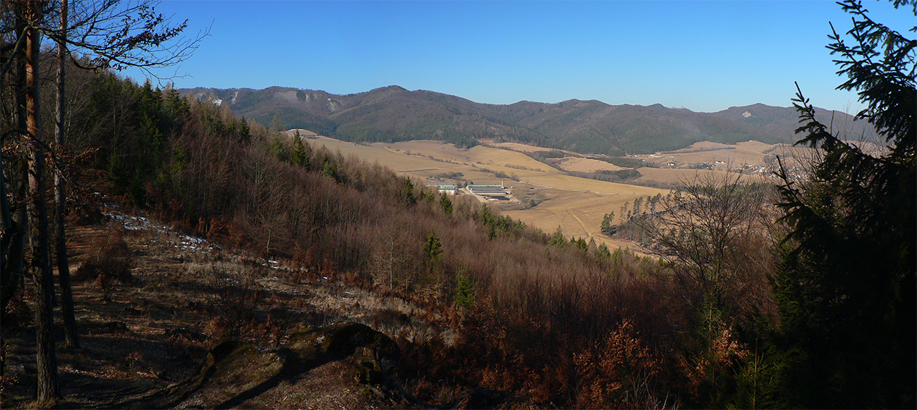 Hrad som si nechal až na záver, najskôr som mal v pláne obkrúžiť Strážnu s jej skalami, bralami, vežami a skalnými mestami. Takže z rázcestia pod hradom davaj po modrej na západ, smer Podhorie. To je príjemná cesta lesom, ešte príjemnejší je ale paralelný chodník po hrebienku. Taký súľovskejší: sem - tam skalka, sem - tam výhľad do kotlinky Lietavskej Svinnej. Na druhú stranu výhľady asi len zo dva, cez rúbaniská.