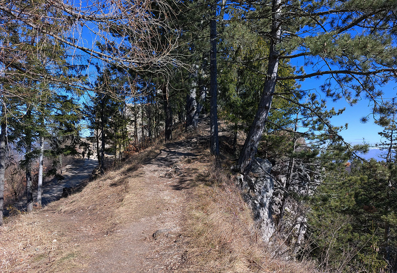 Značku som opustil v zalesnenom sedielku pri kríži, kde sa stretá až osem ciest a chodníkov. Neznačený, ale zreteľný chodník (niekedy aj viac chodníkov) vedie odtiaľ cez hrebienok Strážnej. Hneď na úvod pekná skalná plošina aj s výhľadom nazad ku hradu, potom čím ďalej, tým viac skaliek a výhľadov z vrcholov skalných veží.