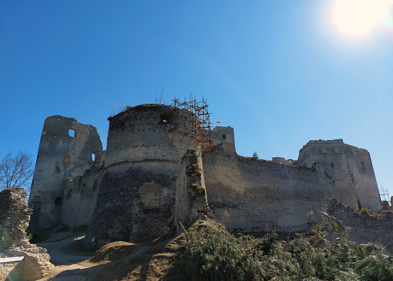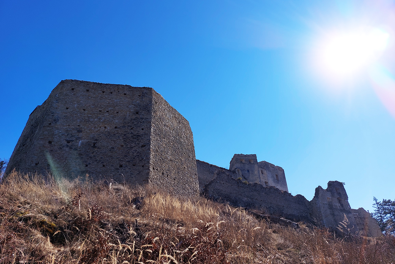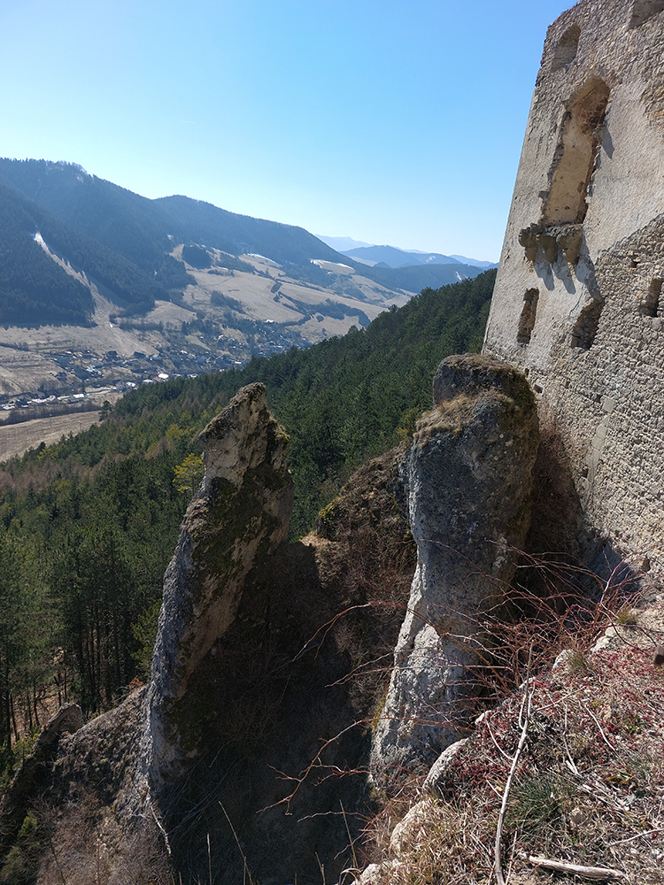 Nazad pod hrad som potom došiel takmer tou istou trasou, len som sa ešte popod skaly prvej vyhliadky pomotal. Hrad je impozantný z každej strany, kvalitne postavili tú zrúcaninu :-) A prístup k nemu po hrane poriadne vysokej skalnej steny (po odbočení z chodníka v závere) je fakt paráda! Potom už nasleduje prehliadka múrov, veží a nádvorí (alebo aj ponuky hradnej krčmy) – teóriu si ale záujemca nájde na lepších miestach. Tu len spomeniem, že stavitelia ozaj umne využili danosti terénu a miestneho zlepenca, podobného na pohľad betónu. Podobne ako na menšom Súľovskom hrade.