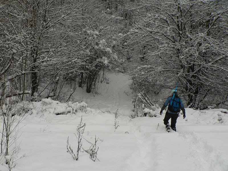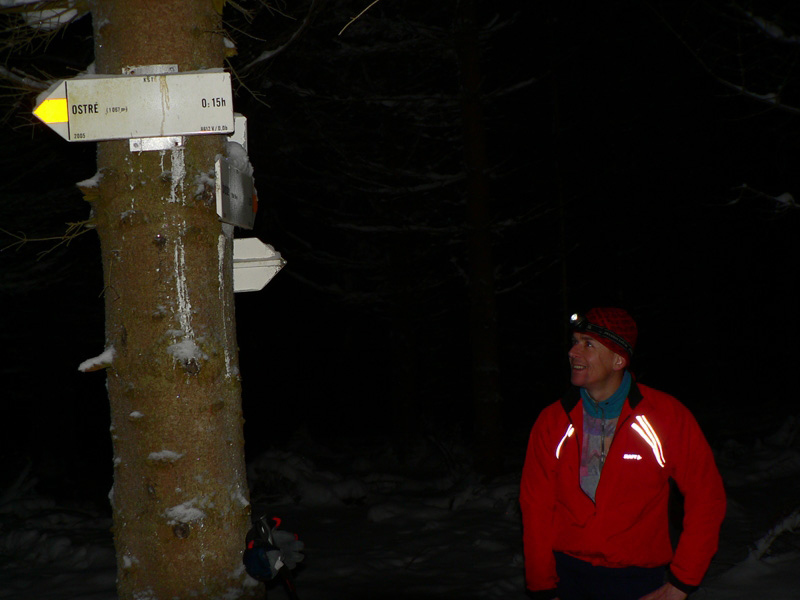 Odtiaľto je to už striedavo z kopca – do kopca až do sedla pod Ostrým, zato záveje sú čoraz hlbšie (či vyššie?). Z hrebeňa trčia vápencové bralá, niektoré treba obísť, z niektorých sa dá dovidieť do doliny Váhu. Výstup na Ostré sme si potme už odpustili. Zo sedla už sa ide dolu príjemne, najprv chodníkom, ktorý sa čoskoro zmení na rozbitú zvážnicu s výmoľom v strede. Aj napriek hlbokému snehu sme za hodinku na stanici v Švošove.