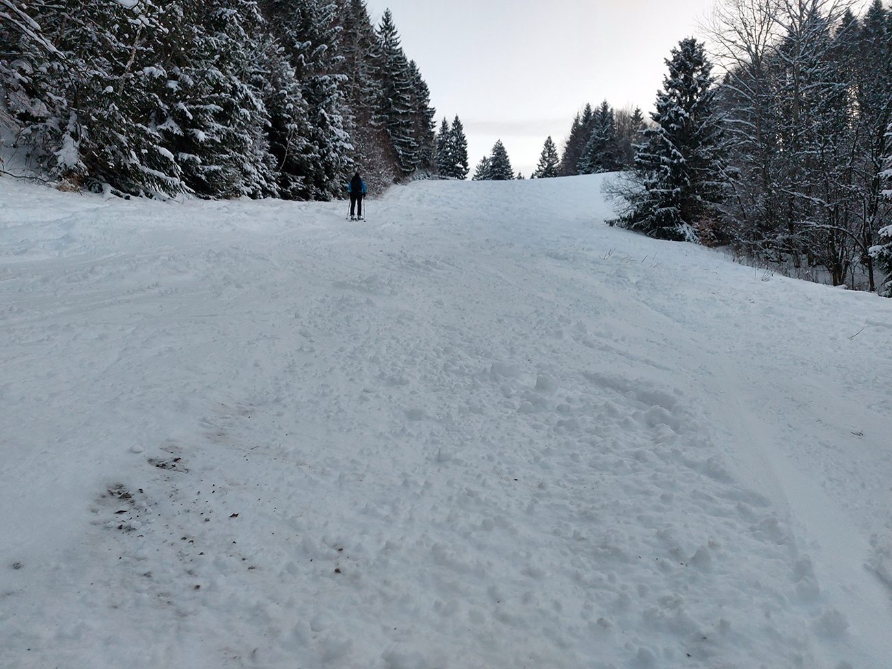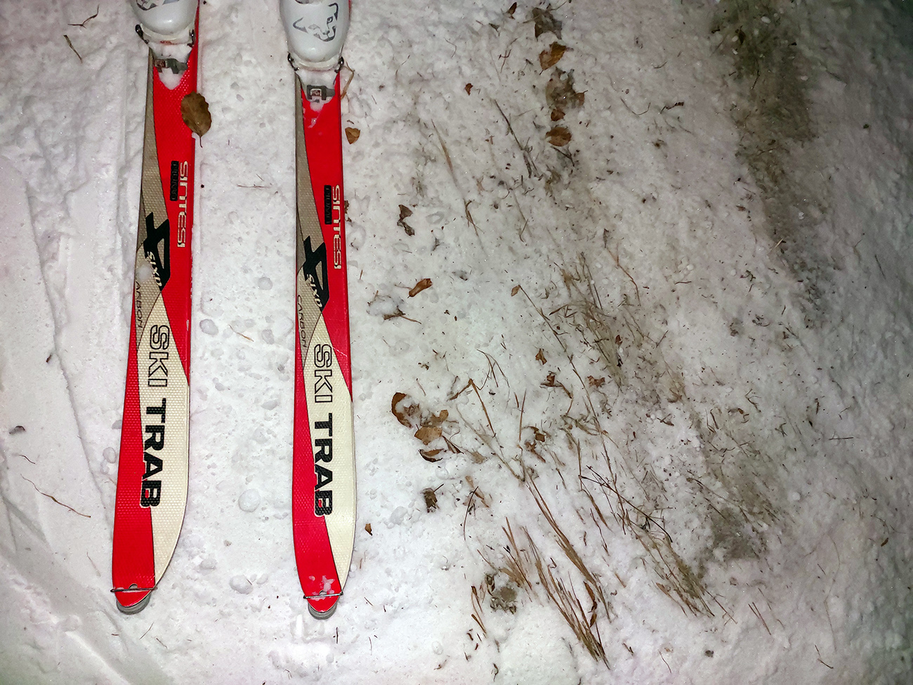 Chleb (v stredu z Trusalovej): Generál klasicky bubnovatý, horná, rovnejšia časť bez prekážok, v strmine kríčky a jafury ako slalomové bránky trčia na vrcholoch, je to vyšmýkané, všetky zrady viditeľné. Potom už dole cestou, kde len občas kamienok spod snehu ratračím pásom vyhodený striehne a na vari dvoch strmších miestach sú nejaké väčšie vyorance rozhádzané. Keď sme my za tmy nič nepochytali, za svetla no problem. Z drevoskladu aj les polyžovaný, ale išli sme slušne po turistickej zelenej až na Zajacovú, a zas – v strede občas piranie mláďa hlavu vystrčí, ale žiadne súvislé húfy tam nie sú, všetko obíditeľné. Turistický chodník zo Zajacovej do Trusalovej taký užší – pekne vyleštené výstupové stopy a popri nich sa v hlbšom snehu dá, ale bacha na skryté konáre. Po ceste je to rýchle, rovné, ujazdené autami, takže predvídateľné. Zlyžovali sme až k Markovi po okraji odpluhovanej cesty, úplne v pohode.