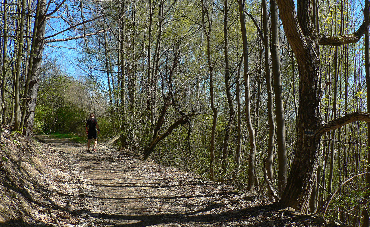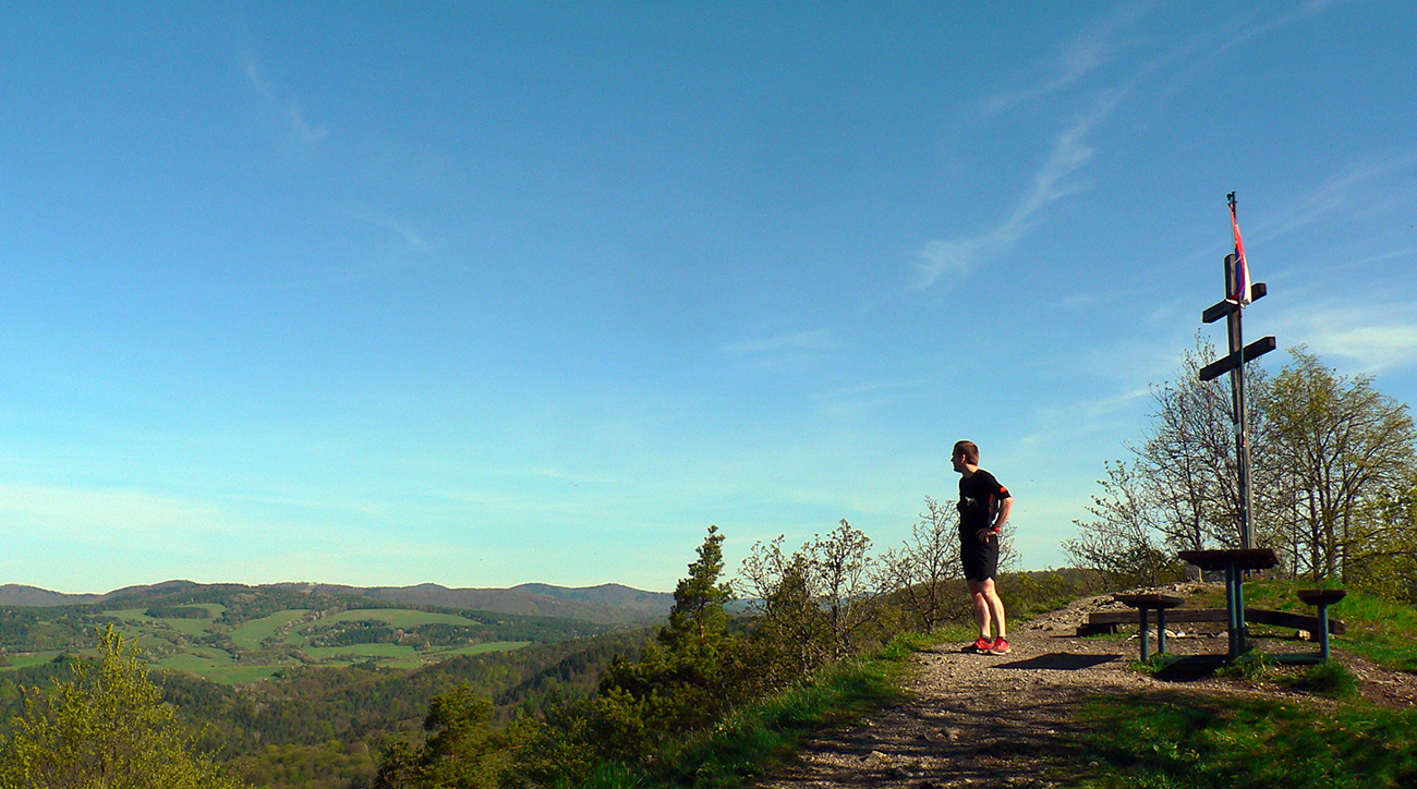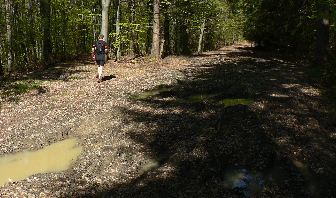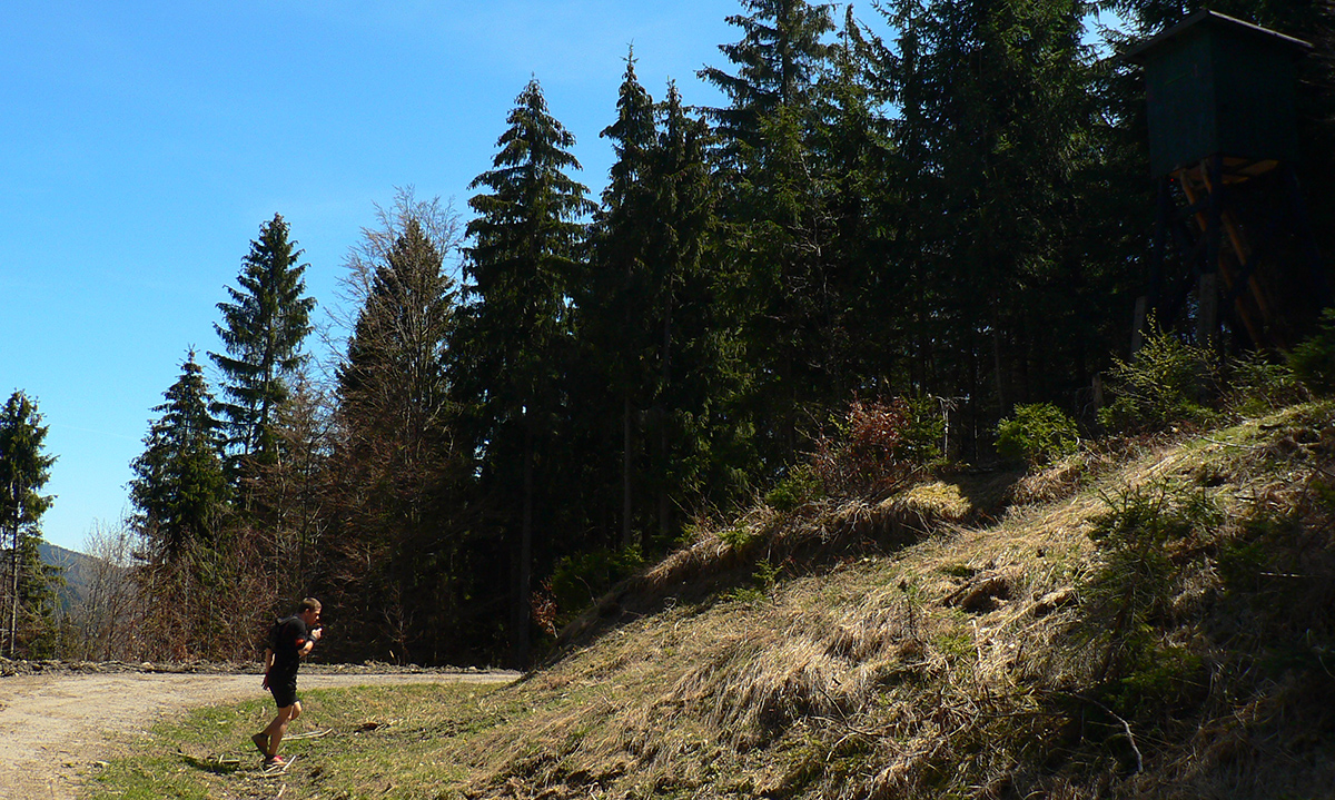 V Modlatíne pumpa, tak pumpujem, dáko ma suší po tej rannej slanine či prečo... No ale ultraraňajky museli byť! Osviežení, posilnení, znovu s budovateľskou piesňou (alebo skôr s blbými rečami) na perách stúpame po parádnej lesnej asfaltke a debaty o zmysle života a iných zbytočnostiach sa zase rozbiehajú do vyšších obrátok ako naše nohy. Takže keď zisťujeme, že už dlho nemáme modrú, zisťujeme aj to, že sme príliš leniví tak ďaleko sa vracať. Ale múdry telefón ukazuje, že značka vedie nad nami a onedlho sa k nej dosť priblížime, tak sa napojíme. Ani sa moc za tým ale neženieme, odrádzajú nás tie nedávne zážitky. Akurát kým k tomu napojeniu dôjde, stihnem ešte zhejtovať zopár bajkerov – gravelistov, ktorí si tu svištia. Lebo nohy už cítiť.