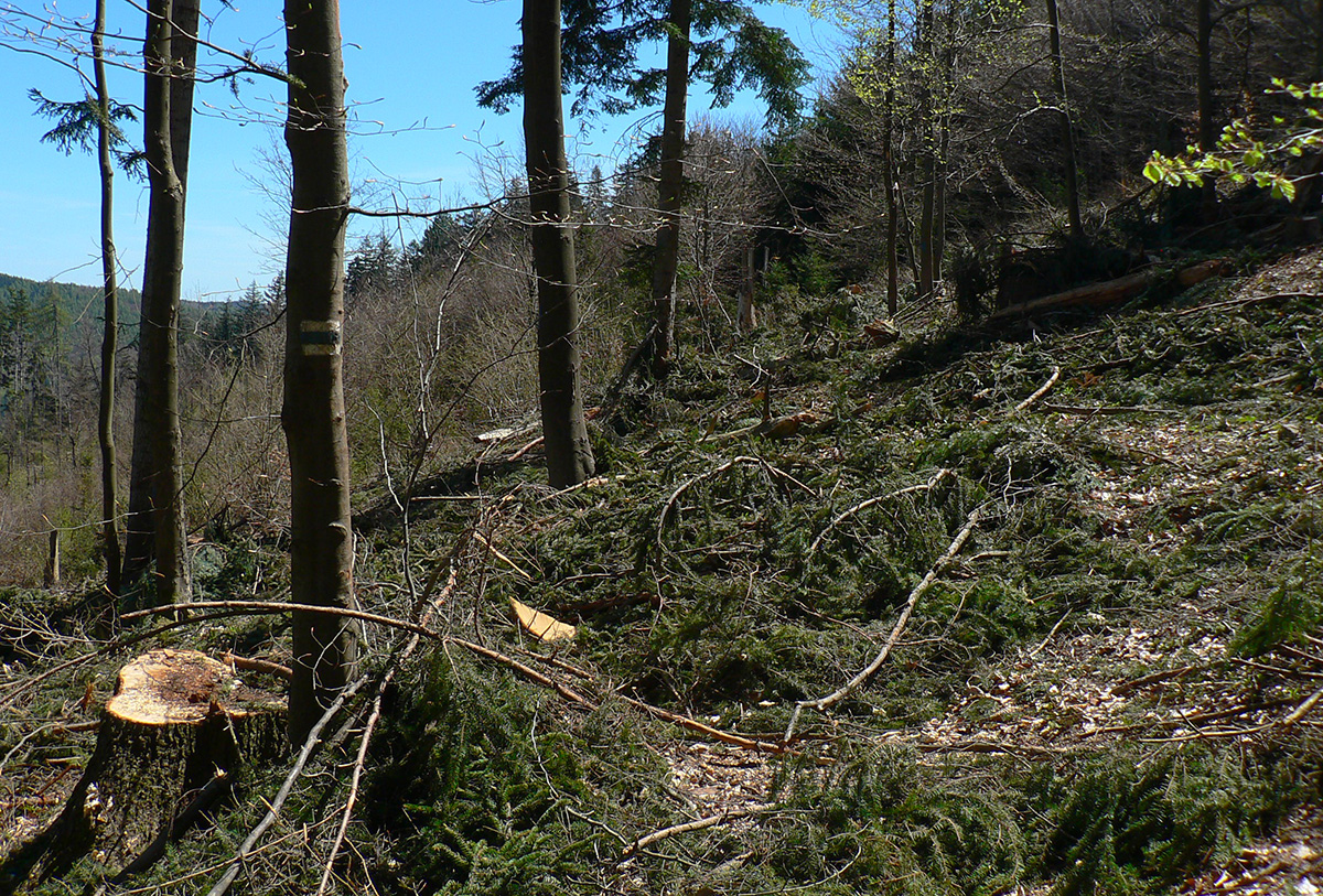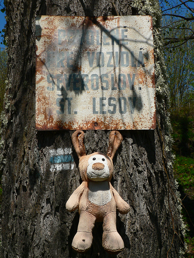 Ale ide sa do lesa a romantika na dlhý čas končí. Lebo až do Maríkovej – Modlatína je to rozbahnená, roztraktorovaná cesta typicky hospodárskym lesom so všetkým, čo k nemu patrí v tejto dobe holorubnej. Aj zopár pracovných offroadov stretáme, aj stôp po motorkároch je tu na mraky, aj značky niekde chýbajú. Ešte že je tu „bývalý kamarát“ s telefónom a mapami, keď neúmyselne skracujeme hneď nad Klieštinou a jej osadu Brunov zďaleka obchádzame, aj keď sme ju mali líznuť okrajom. Čerešničkou na torte je ale záverečný traverz za Zigovom – bahno, ťažba, predieranie mladinou, zo všetkého trochu. A potom výživných 300 výškových smerom dole do Modlatína. Najhnusnejšia turistická značka široko ďaleko, vrelo neodporúčam. Ale nálada zatiaľ neklesá, len tempo, pozvoľne.
