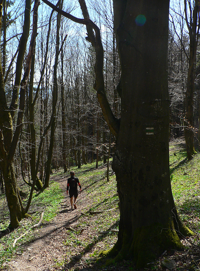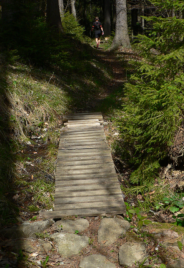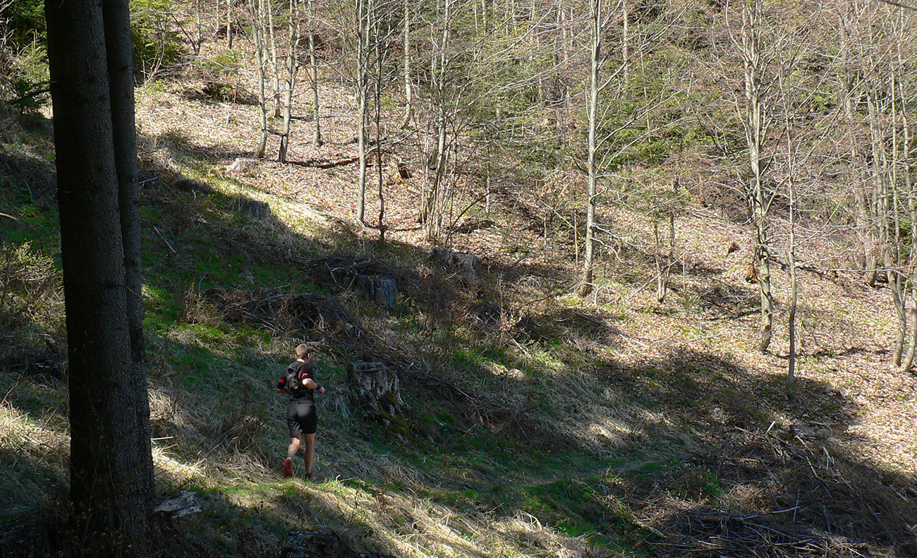 Napojenie sa znovu darí vďaka mapám v telefóne a sánka nám padá: nádherný singlík jemne stúpa traverzom, je vidieť, že je pravidelne čistený, či v lese, či na rúbani. Stôp po bajkeroch viac ako po turistoch. Počúvam čosi o „Maríkovskom Eldoráde“ – doma po malom gúglení sa z toho vykľuje Traildorádo (https://www.mtnlovers.sk/clanok/28/marikovske-traildorado-nic-pre-slecinky). No, za-u-jí-ma-vé! Len jednu chybu ten chodníček má – asi kilák či dva pred začiatkom finálneho strmého stúpania na Portáš zrazu značky miznú a nebyť toľko spomínaného telefónu a jeho inteligentného majiteľa (alebo aj naopak), tú odbočku hľadám ešte dnes. Za odbočkou značiek zas dosť. To čo bolo totok? Horšie ale je to, že so značkami miznú aj sily z nôh a na rozdiel od značiek už sa znovu neobjavujú.