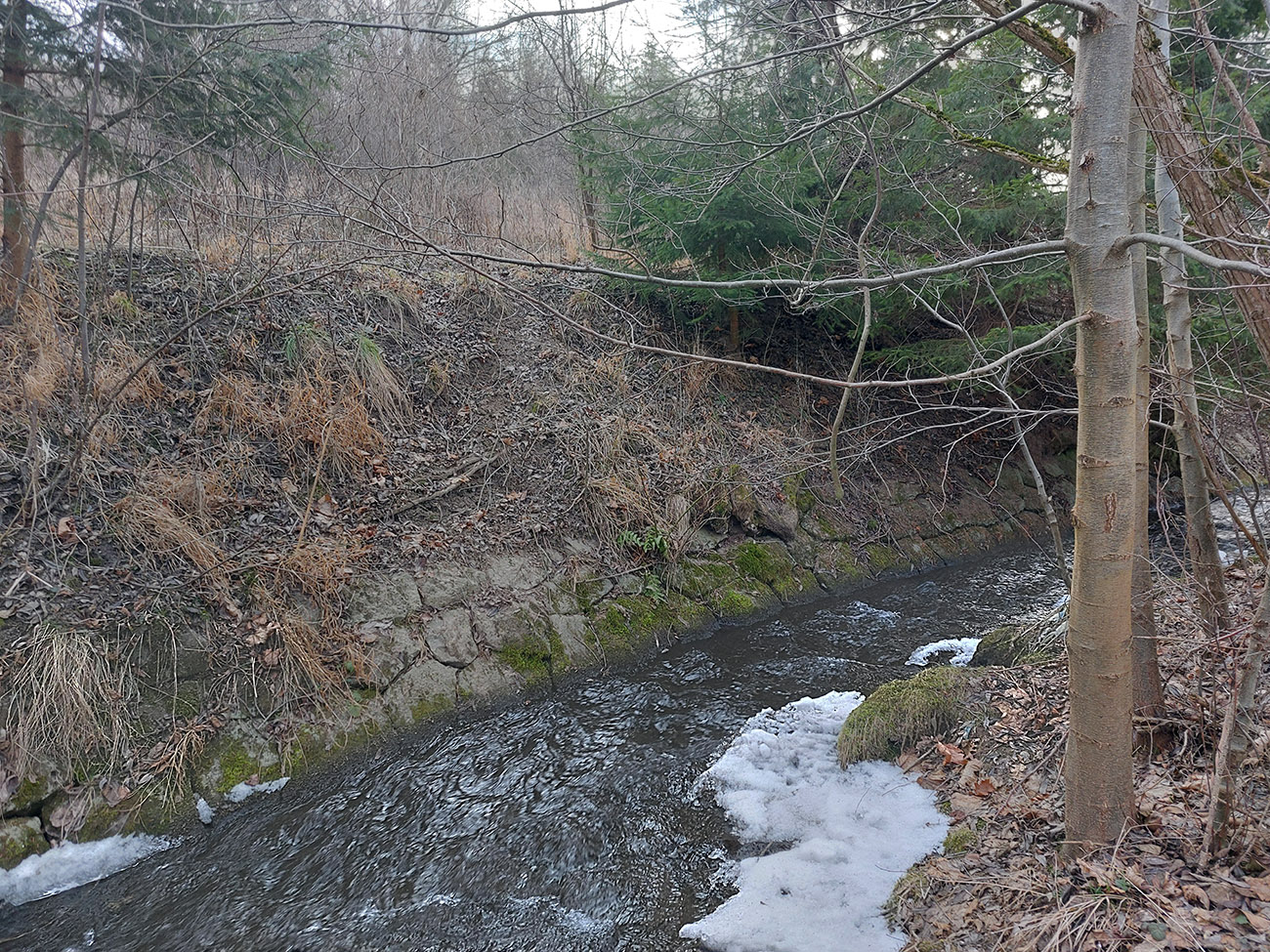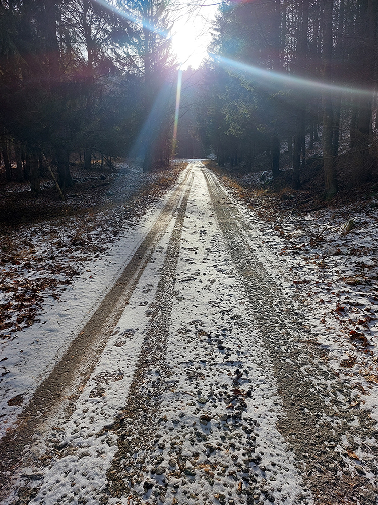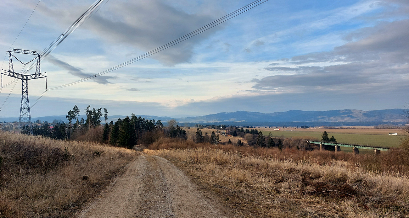 Ešte trochu prebárania bolo na aktuálne nepoužívanej ceste v obchvate bezmenného kopca nad Širokou dolinou, ale tá bude v lete skvelá pre bajk. Potom čím nižšie, tým viac šotoliny, samozrejme. A jeden či dva biedne priekuky pomedzi redšie stojace stromy – ku hrádzi vodárenskej nádrže Turček.