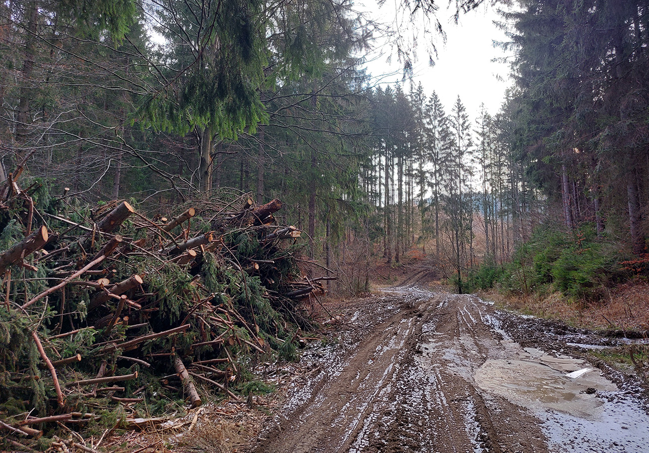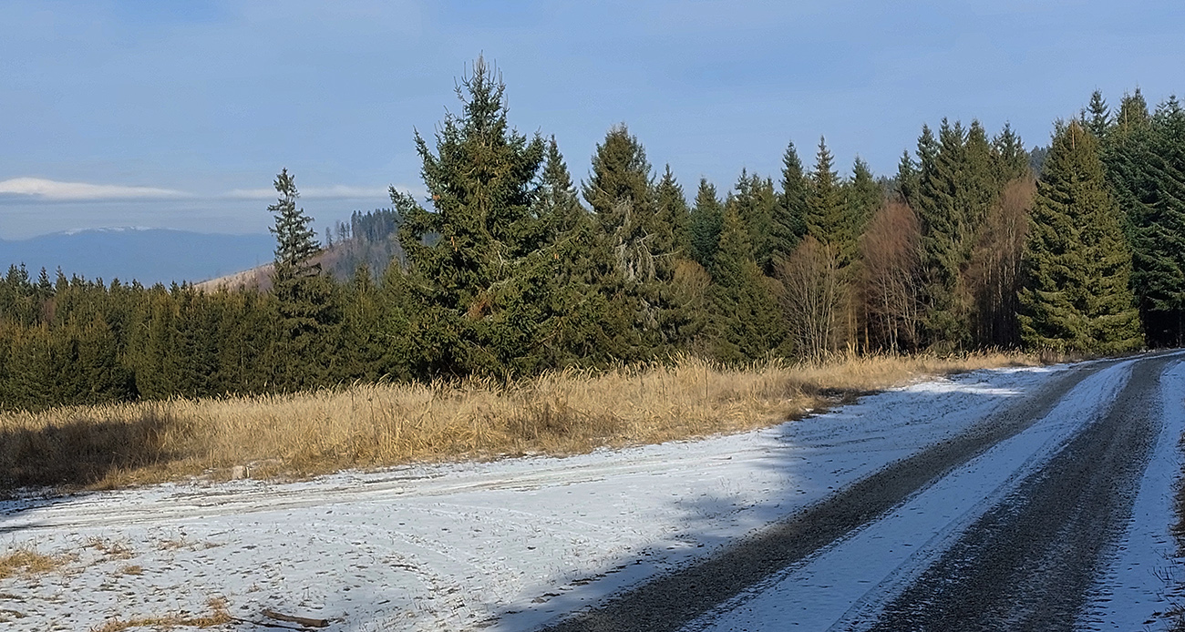 Od križovatky Široký peň už aj asfalt pod nohami a dlhéééé dupanie mierne dole až do dediny, s postupným pribúdaním ťažby a približovania dreva naokolo. Aj tam by sa to dalo možno obabrať po mäkších bočných cestách, alebo kadejako poskracovať či poobchádzať.