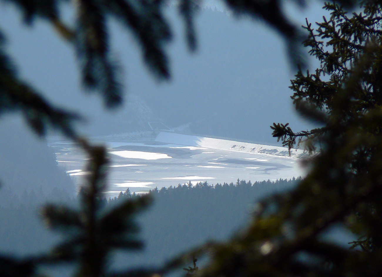 Najvyšší kopec Kremnických vrchov má síce 1319 m, ale je to zalesnený chrbát bez výhľadov a všetky cesty na tú „náhornú plošinu“ vedú lesmi, z veľkej časti hospodárskymi. Len hore je rezervácia. Zároveň ako pokračoval snehovo biedny február (skôr taký koniec marca), keď sa v noci vyjasnilo a všetko to zmrzlo, nechcelo sa mi lyžami dakde po ľade hrkotať, obul som trailovky. Vyšiel z toho okruh od vlaku k vlaku, z hororovej (Hostelovej?) stanice v Hornej Štubni. Samé zvážnice, len strmý záver výstupu na Flochovú od severu (po zelenej) po lesnom chodníku. Zároveň po poriadnom klzisku. Takže skôr tréning – pohodová vyklusávačka, iba za vrcholom, na jednom neprechodenom úseku lesnej cesty sa to trochu pod nohami borilo, inak ani na to prebáranie niet nikde snehu. A zvážnicové blatá pomrznuté a lúky nad dedinou suché, ani som nemal šancu sa zaprasiť. Takže spokojnosť, takto to vyzeralo: