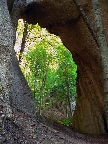 Poskakovanie pokračuje, hore, dole a kľukato, za každou zákrutou nové pohľady na skalné veže a na konci aj to najznámejšie skalné okno. Lebo gotické. Pekné je, ale dnes si ešte užijem aj väčšie.