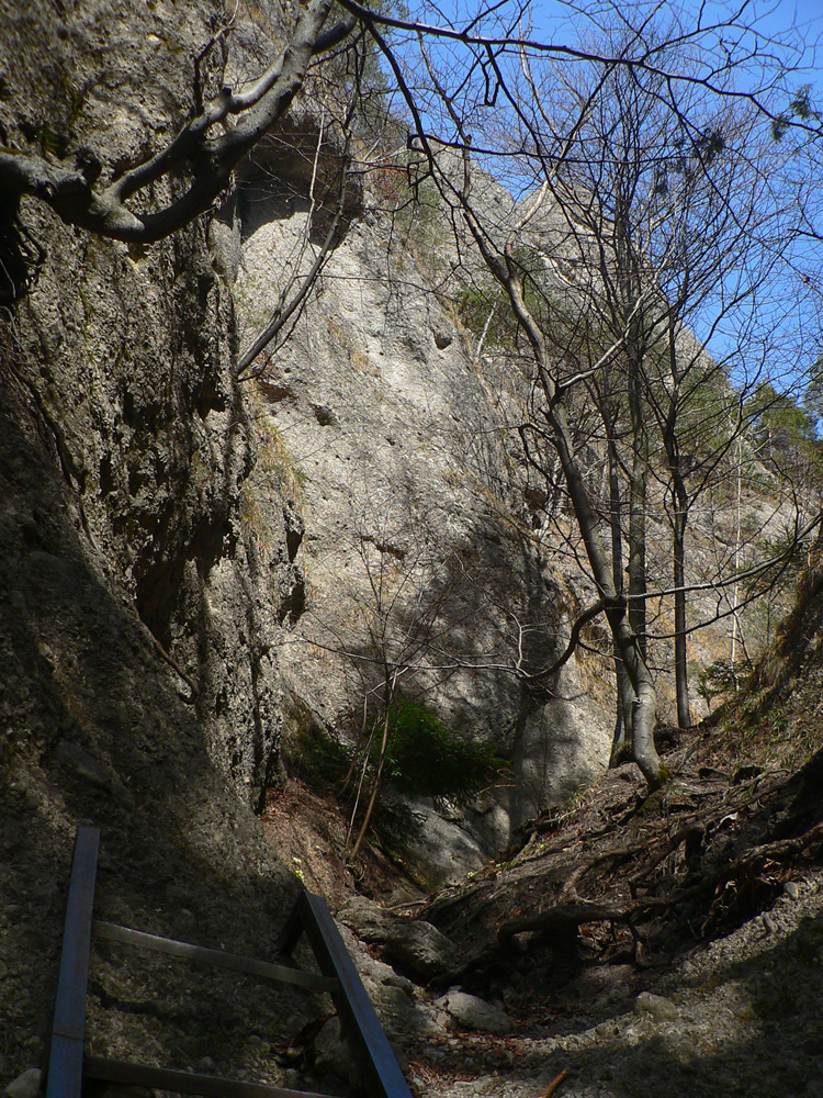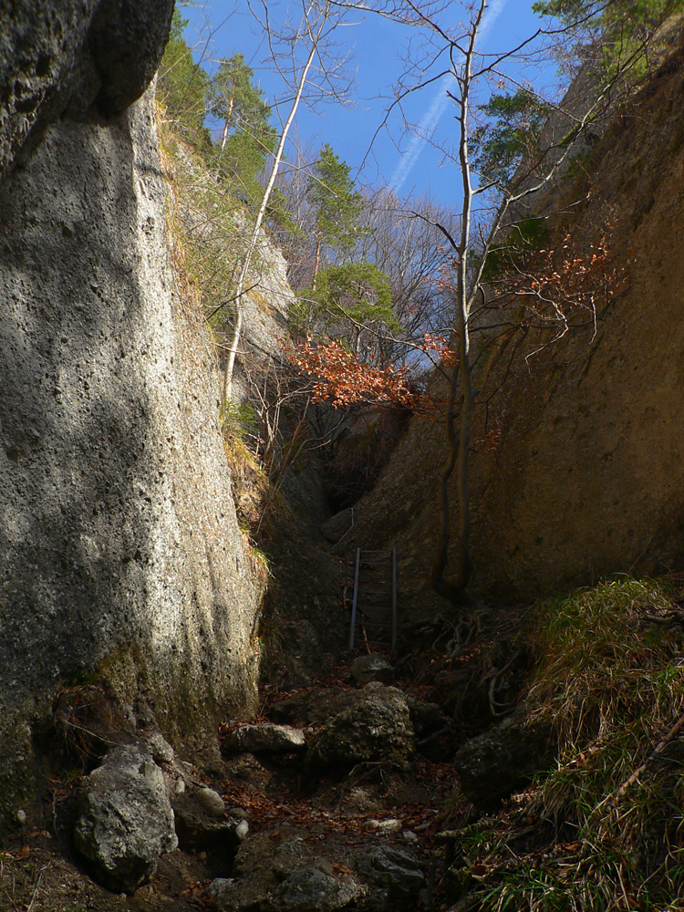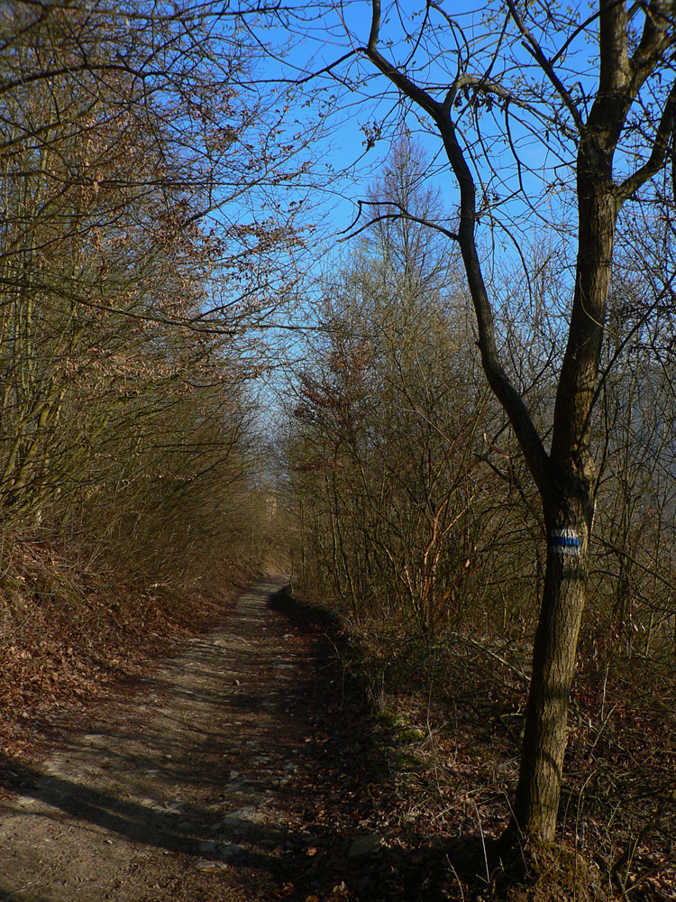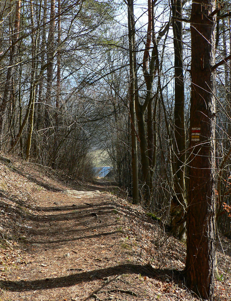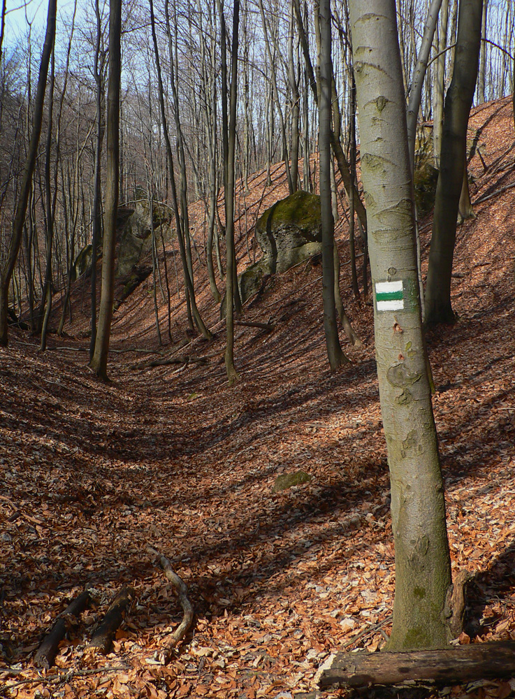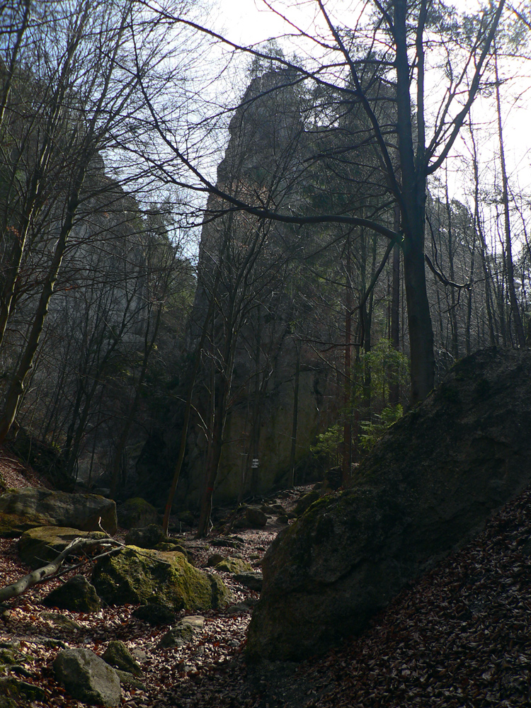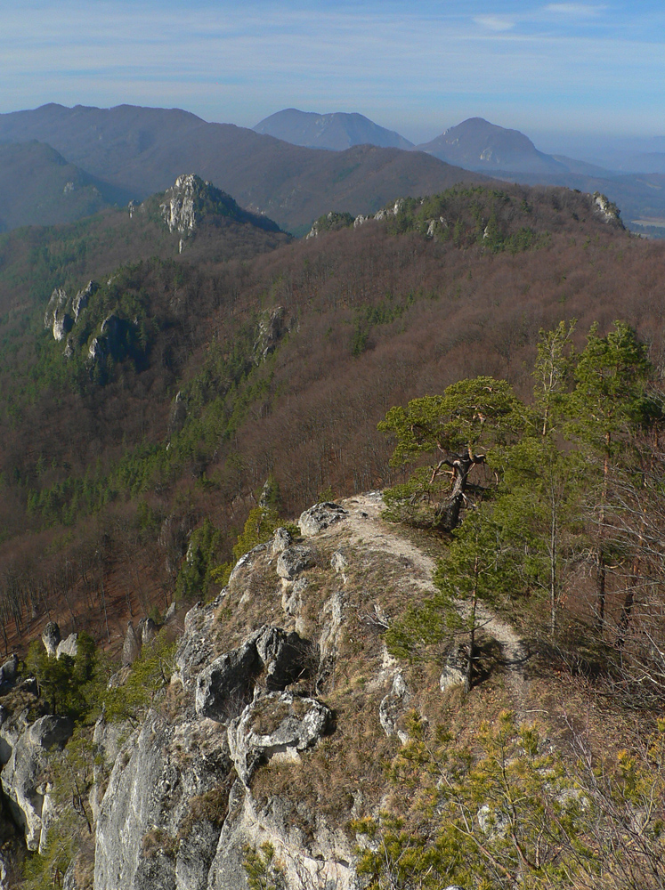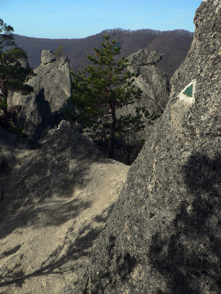 Nazad dole k smerovníku a strmý nástup na hrebeň. Toto je jednoznačne najkrajší chodník zo Súľovskej kotliny na jej obrubu. Pomedzi holé stromy dupľom.