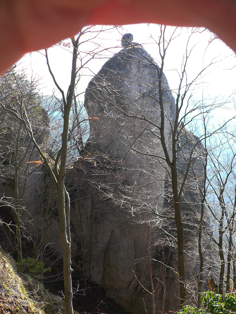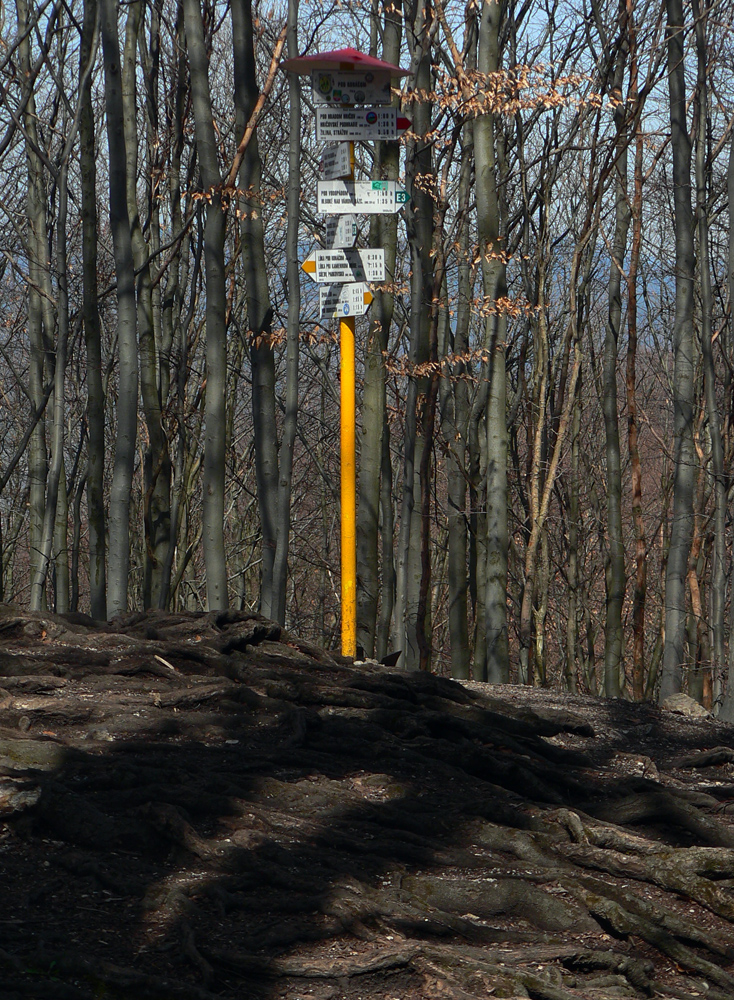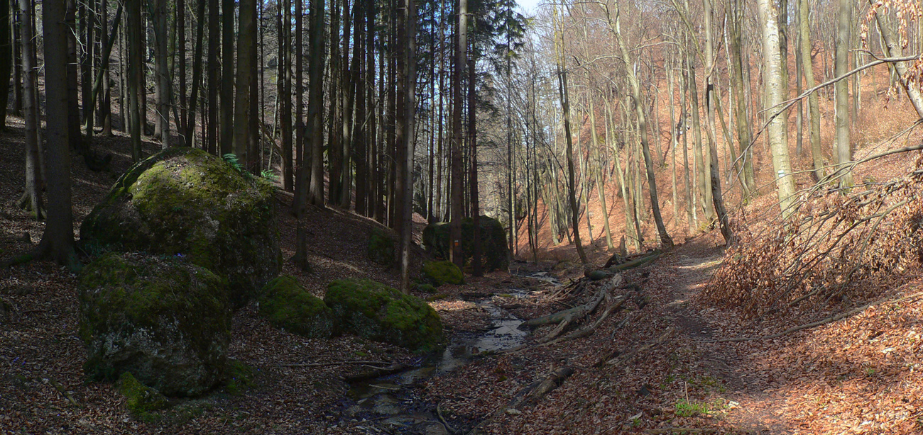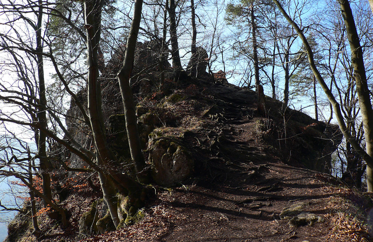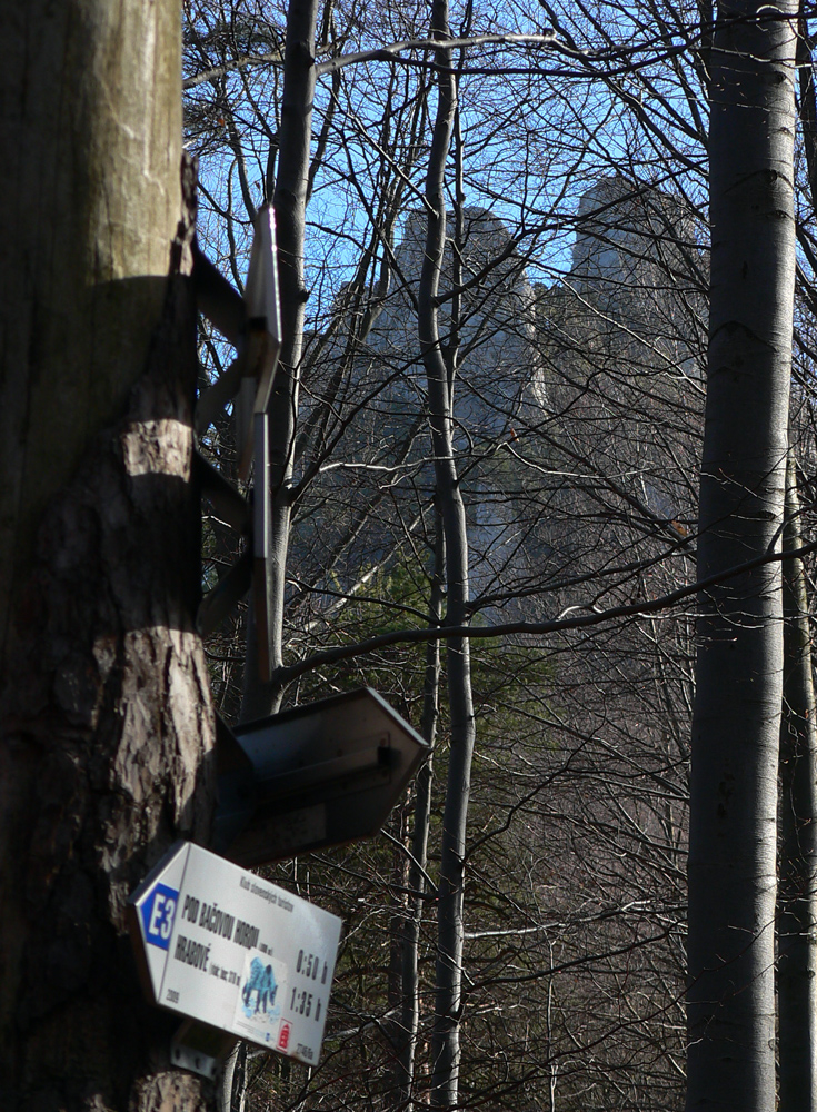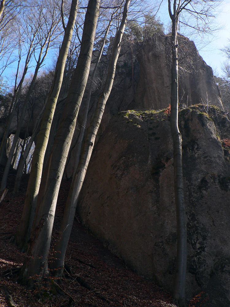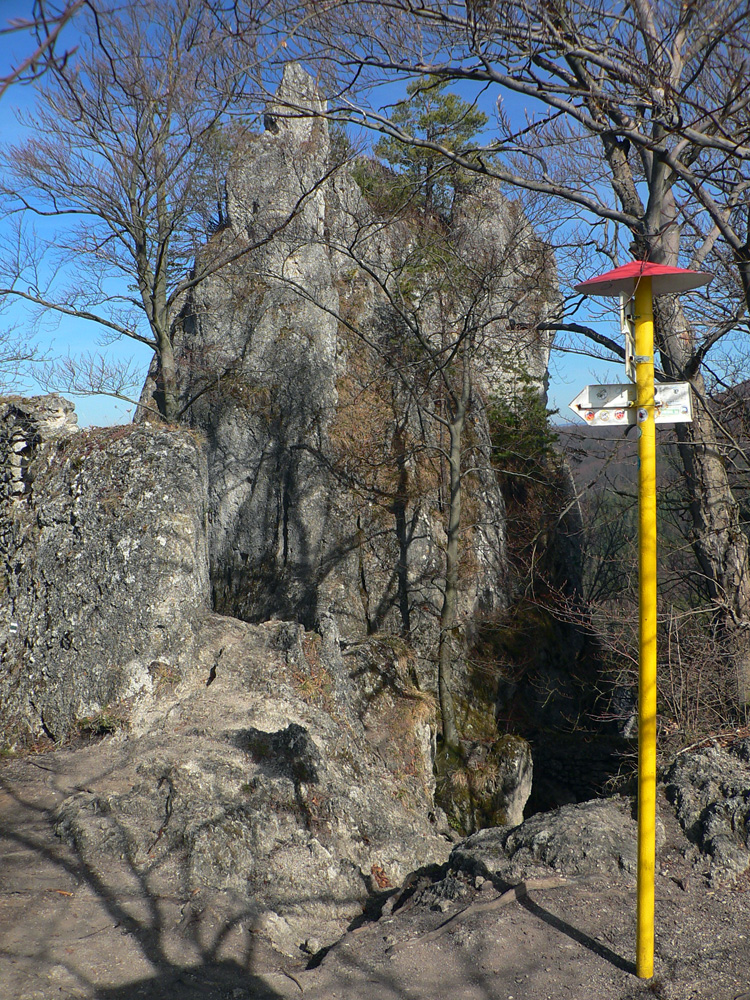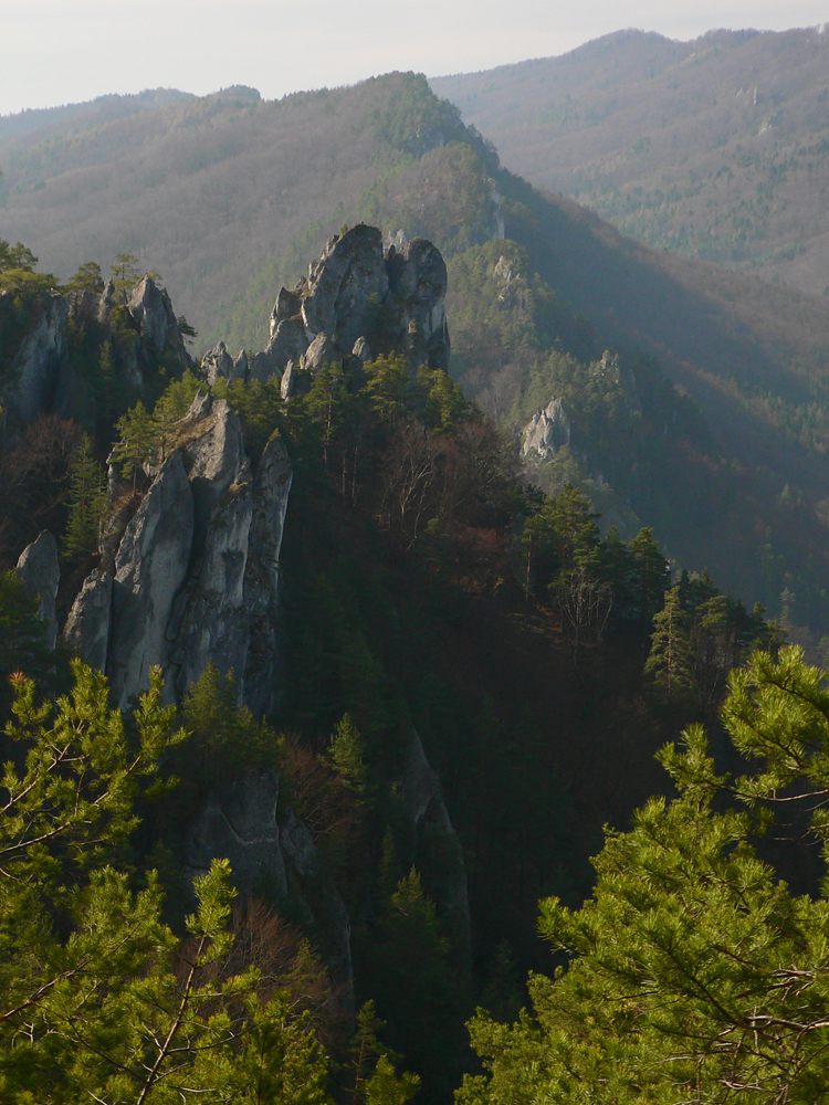 Nazad dole k smerovníku a strmý nástup na hrebeň. Toto je jednoznačne najkrajší chodník zo Súľovskej kotliny na jej obrubu. Pomedzi holé stromy dupľom.