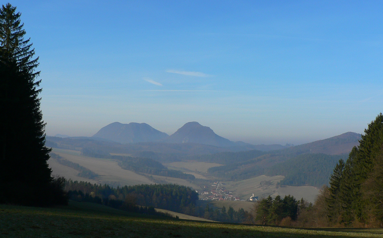 Malá zachádzka doľava na vyhliadku, využiť ranné slnko keď nie v chrbte, tak aspoň na ľavoboku. Kým nezavadzia výhľadu do Súľovskej kotlinky. Len inverzný opar trochu kazil dojem. Zato ponad neho výhľady od Manínov ku Kľaku.