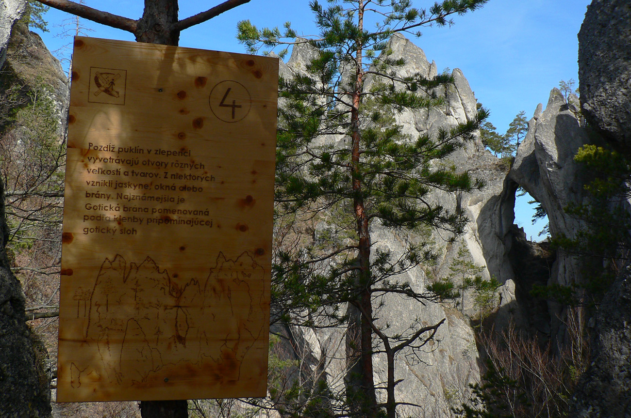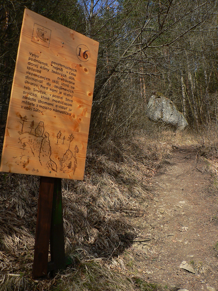 Nazad dole do sedla, krátke zhupnutie ešte nižšie do ďalšieho a už je tu prudké štveranie na bralá Súľovského hradu. Miestna posádka musela mať mocné lýtka :-) To už som napojený na okružný náučný chodník z dediny, sprevádzajú ma jeho nové tabule.
