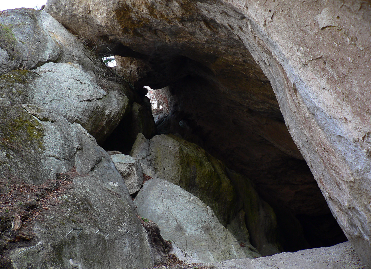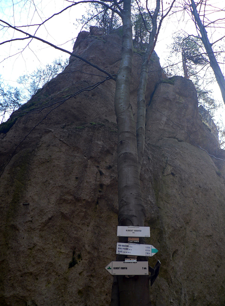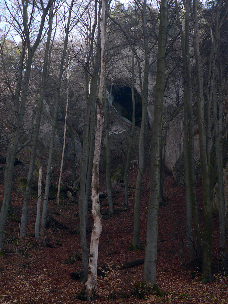 Od smerovníka odbočka, idem sa pozrieť, odkiaľ to tie miestne šarkany vylietajú. Strmo sa k ich hniezdu treba štverať, aj po nových kramliach, aj po šmykľavom lístí, ale stojí za to tá ich diera.