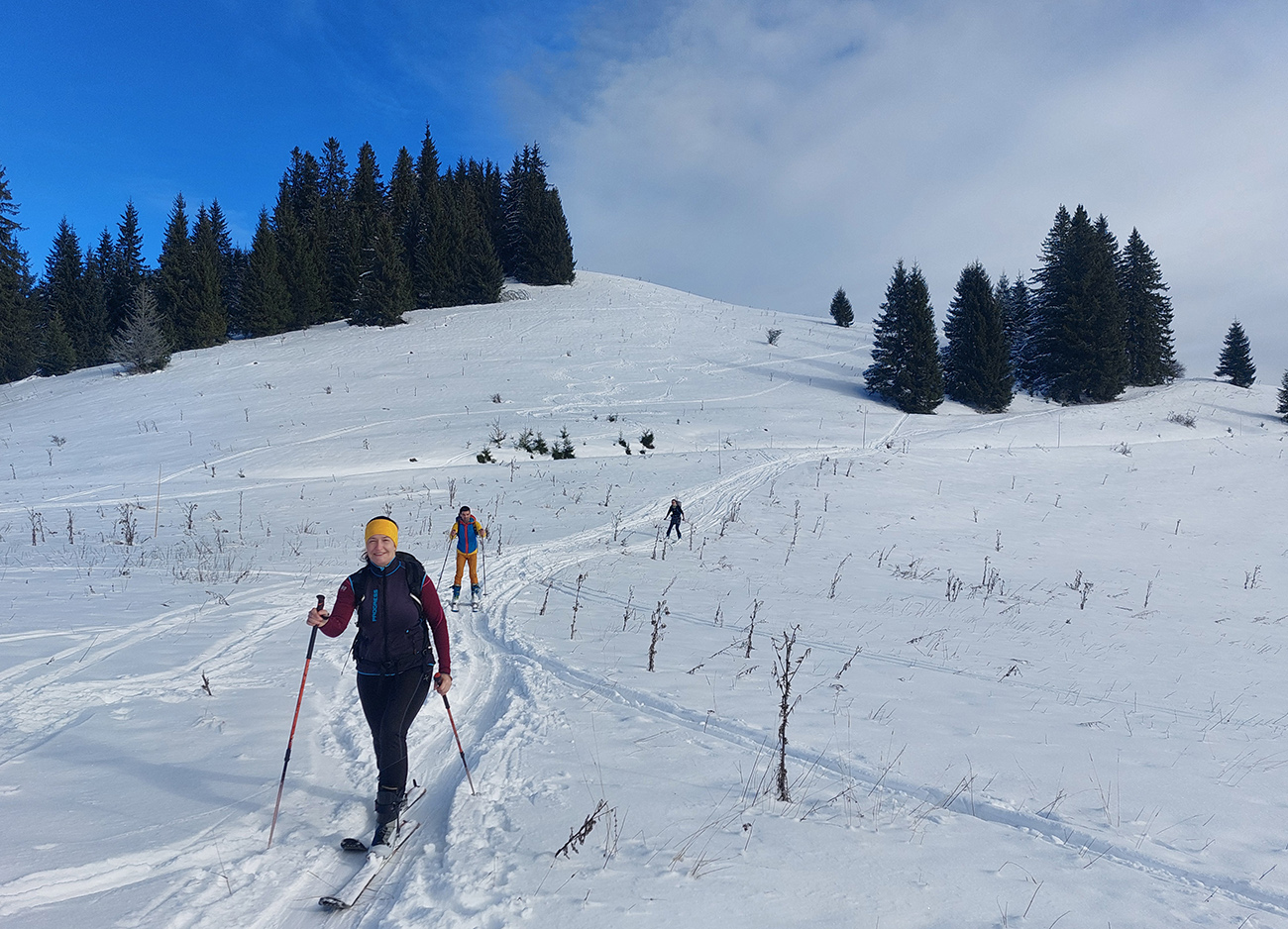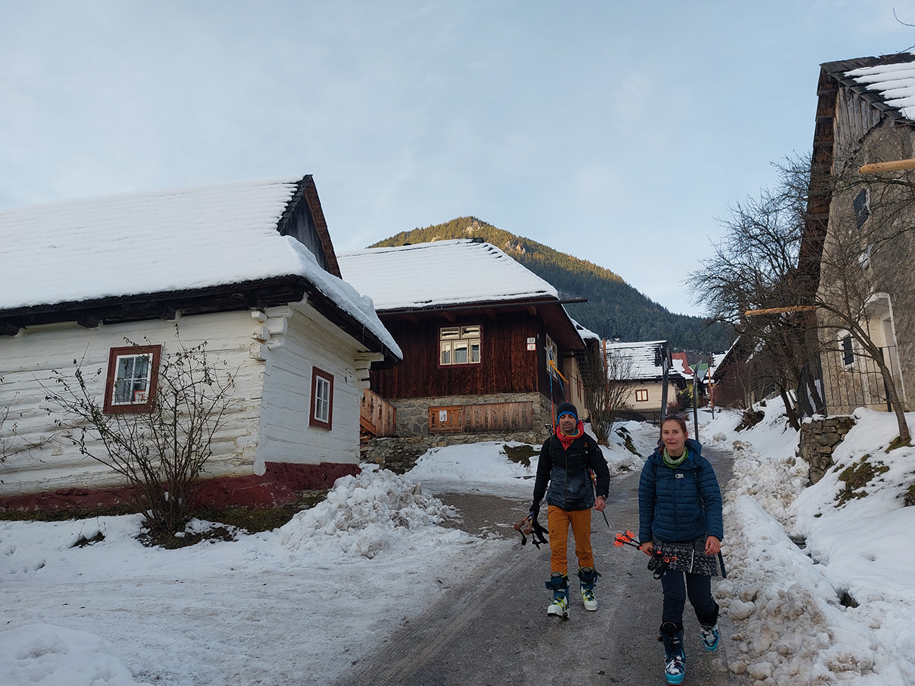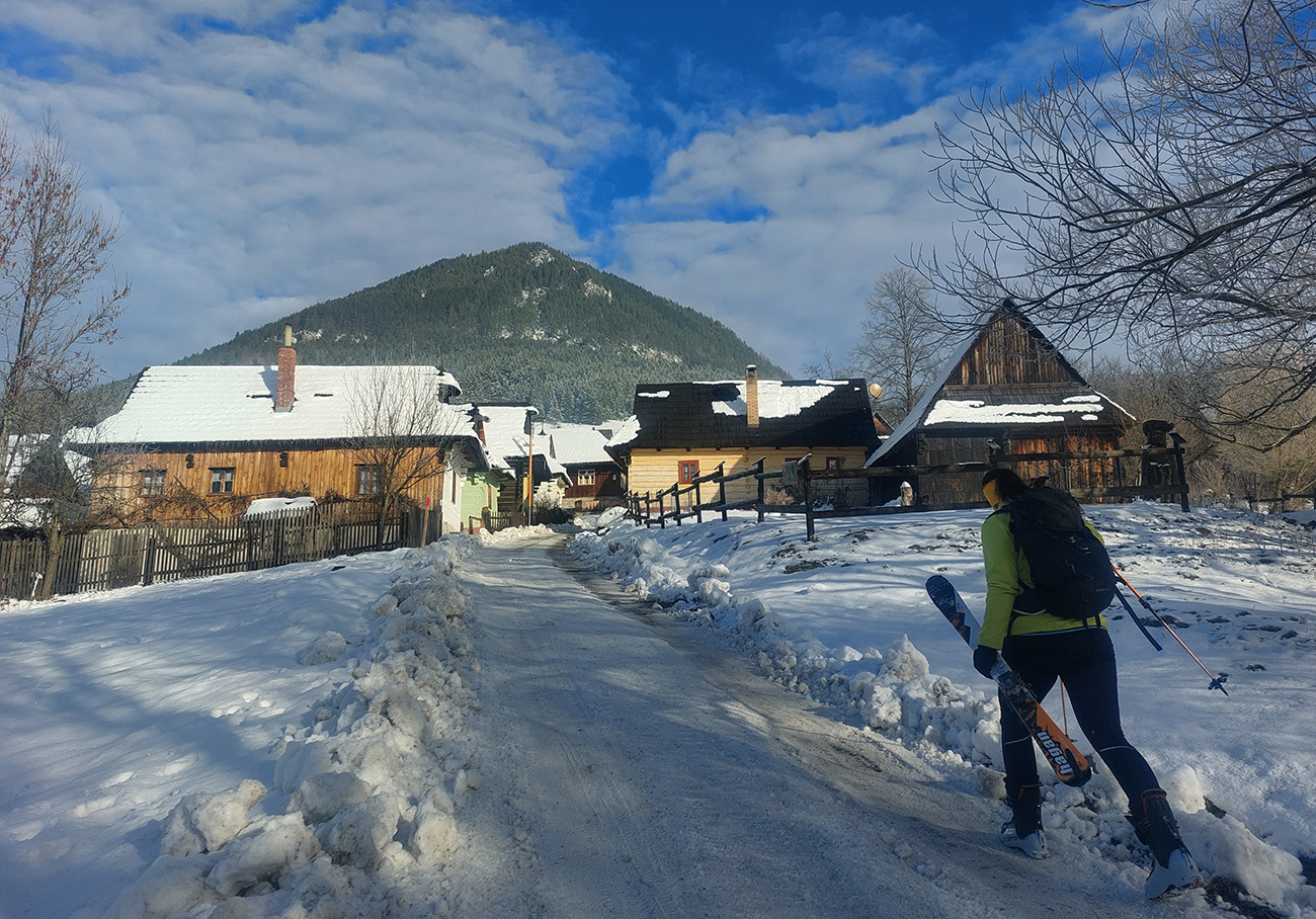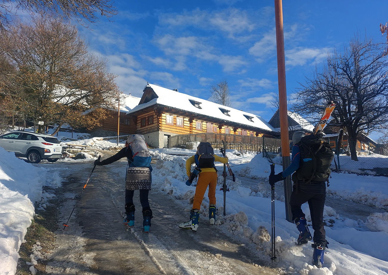 Haliny a Sidorovo na nás dohliadali pri nahadzovaní lyží na batoh, lebo po južnej stráni dole do Vlkolínca sa ani kameňačky riskovať neoplatilo. Ale zato veľkolepé výhľady na Nízke Tatry v diaľke a obielené strechy dreveníc pod nami – no čo viac si priať na rozchodenie do sezóny? Super to bolo a ďakujem modelkám za pózovanie!