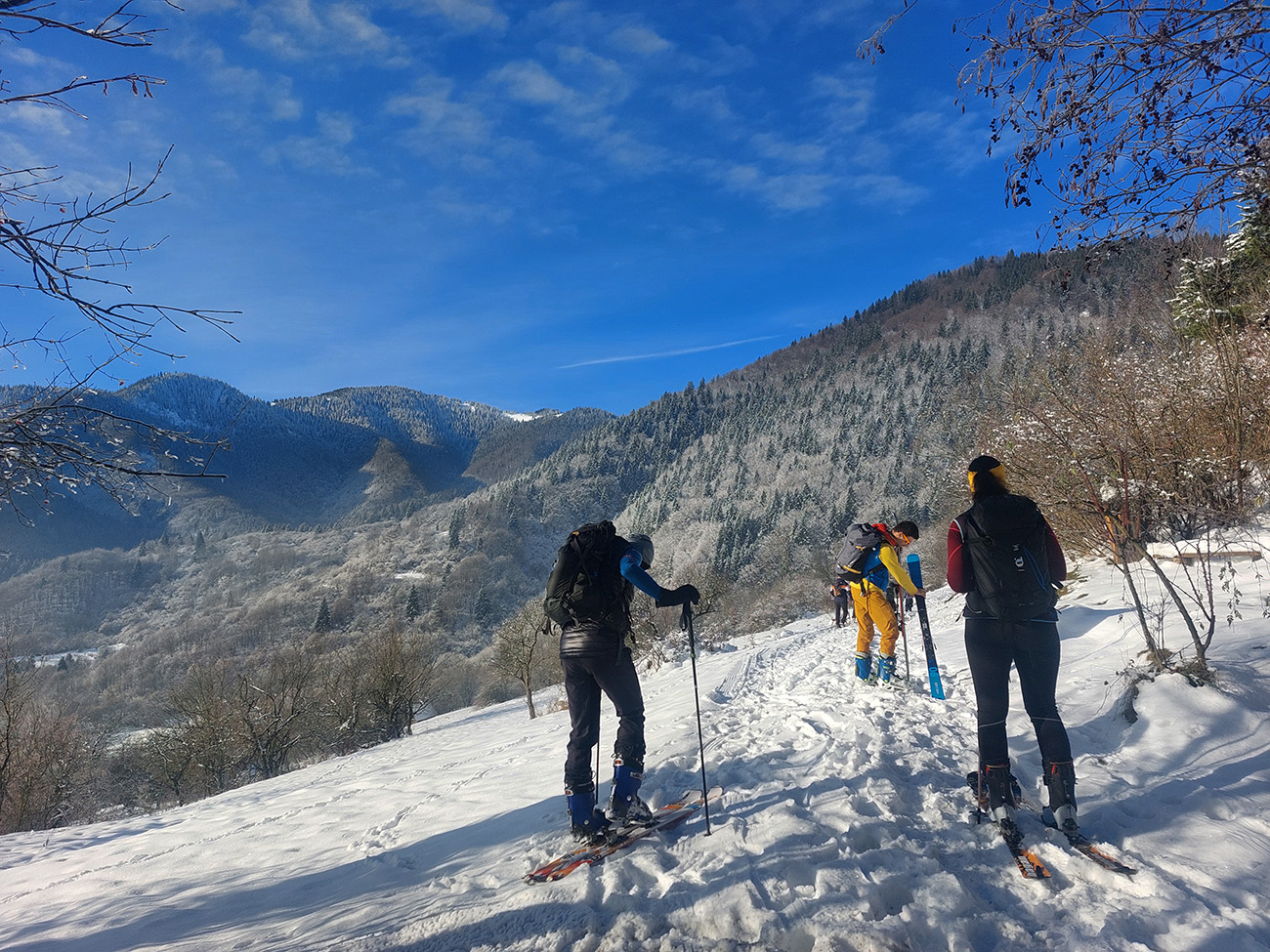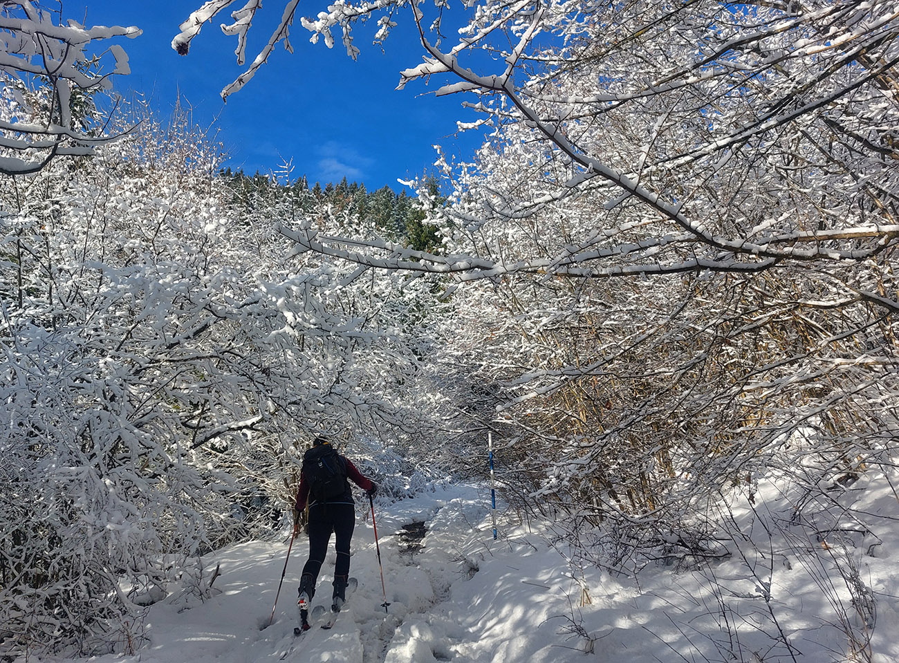 Hore Suchým Hrabovom snehu ako v polke zimy a tvrdý základ nadstavený 5-10 cenťákmi prášku. Na koniec novembra niečo nevídané! Aj keď vyššie, v traverze otočenom na juh a pod stromami bez listov už popŕchalo, ako sa slnko usilovalo. Aj pár vytopených miest pod pásmi, ale tu vyššie aj na zjazd totálny komfort.